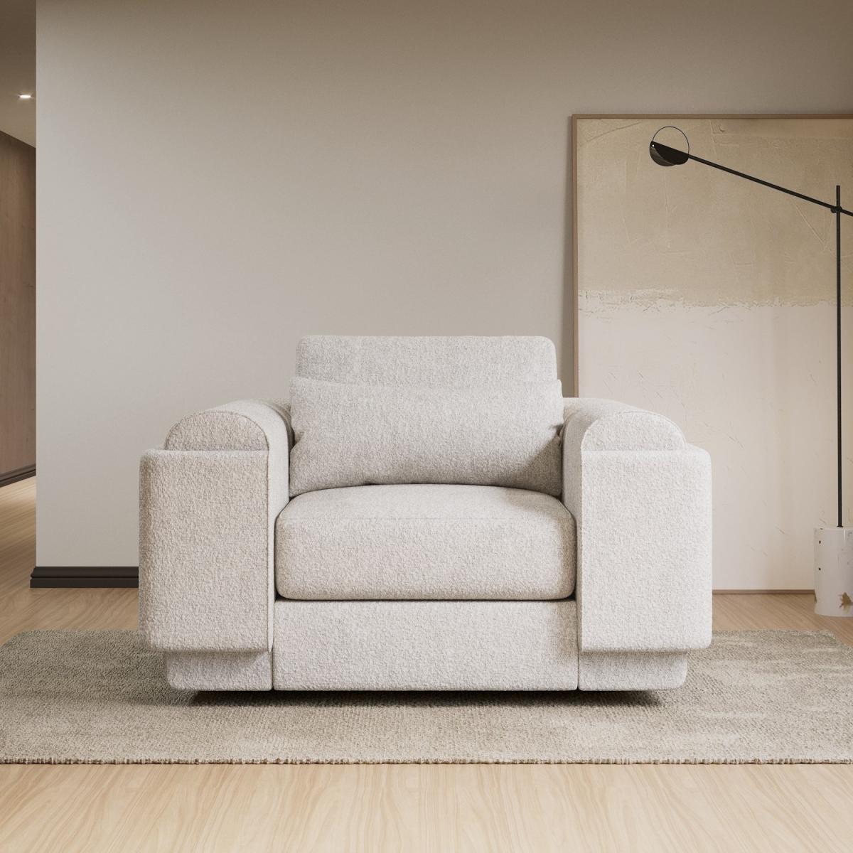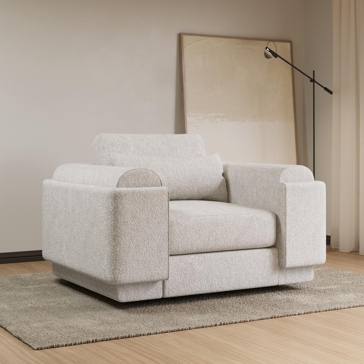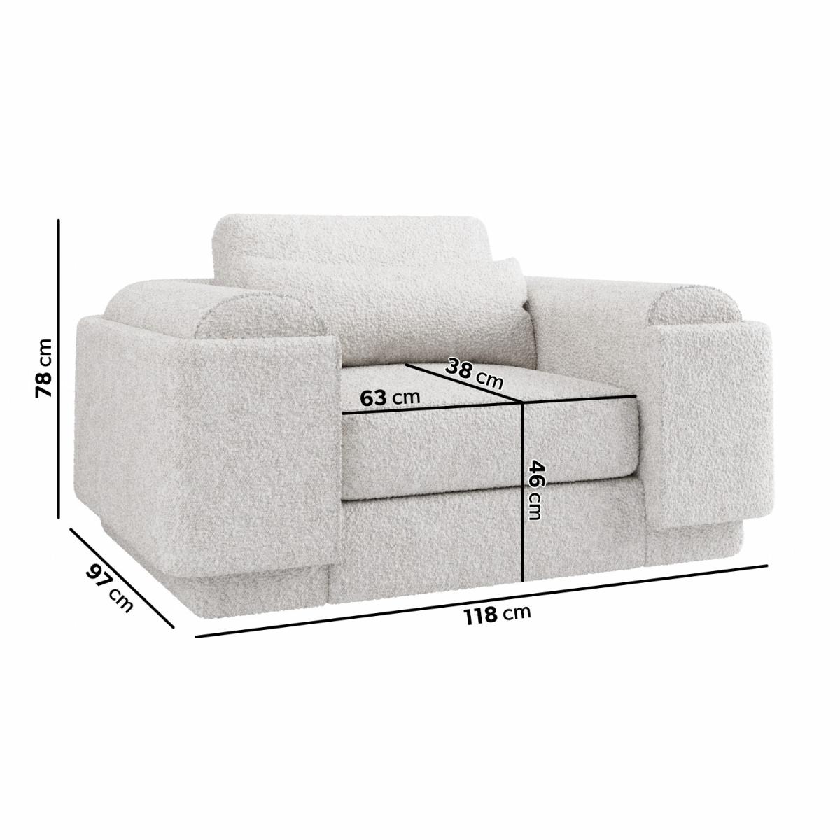 All about me. The Elvi cream boucle armchair is unique and beautifully upholstered in soft cream boucle fabric that’s guaranteed to create a statement in any living room. A long scatter cushion allows you to tailor your seating position and the seat and back cushions are filled with foam for optimum comfort. The frame is crafted from strong plywood and eucalyptus wood so the Elvi armchair is built to withstand the test of time. Need to know. Dimensions. W118 x D97 x H78 cm Packaging dimensions. W120 x D100 x H60 cm Weight. 45 kg Max supported weight. 110 kg per seat Colour. Cream Finish. Boucle fabric upholstery Material. Strong eucalyptus and plywood frame Filling. Foam Assembly required. Yes - just attach the legs.