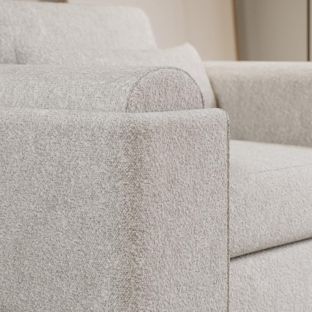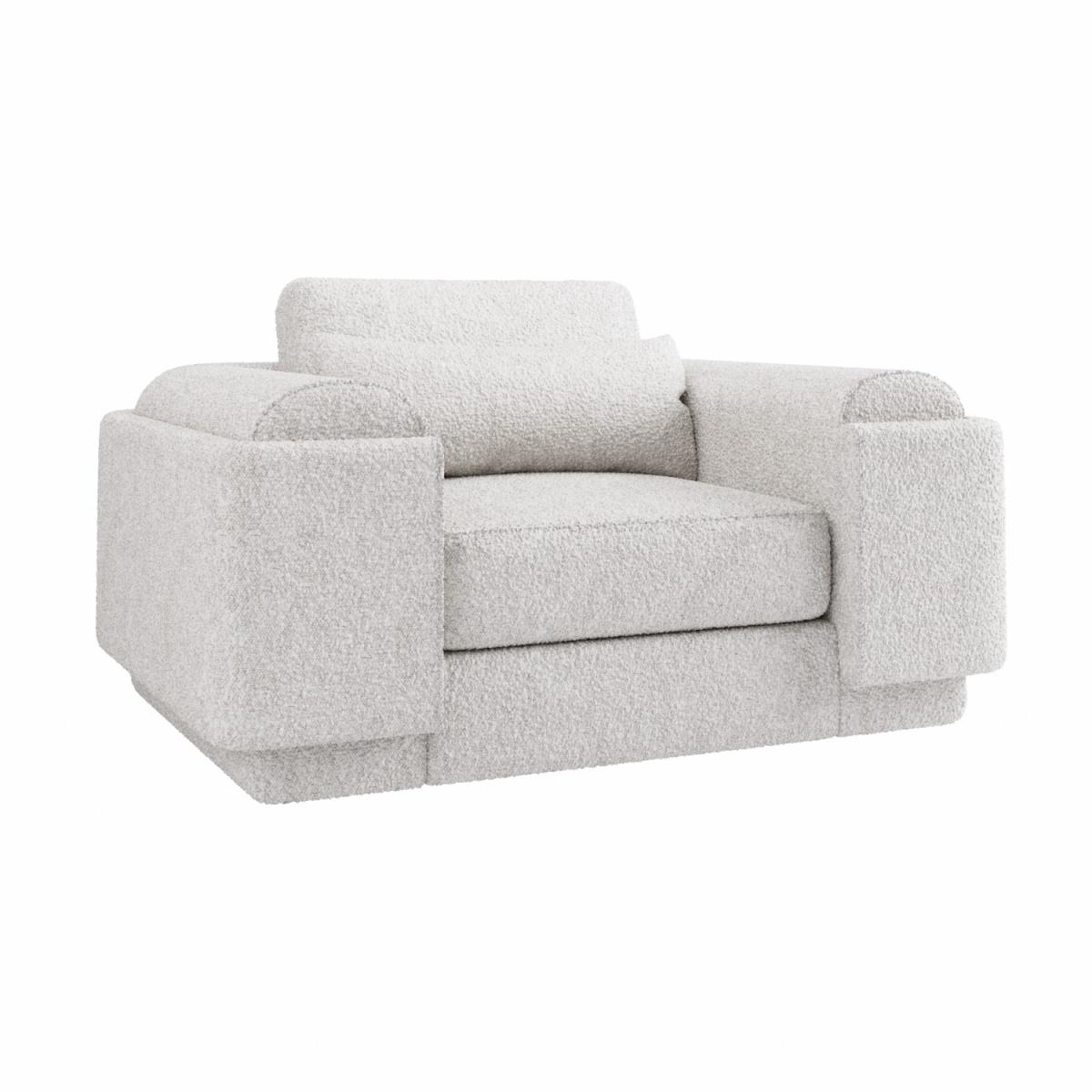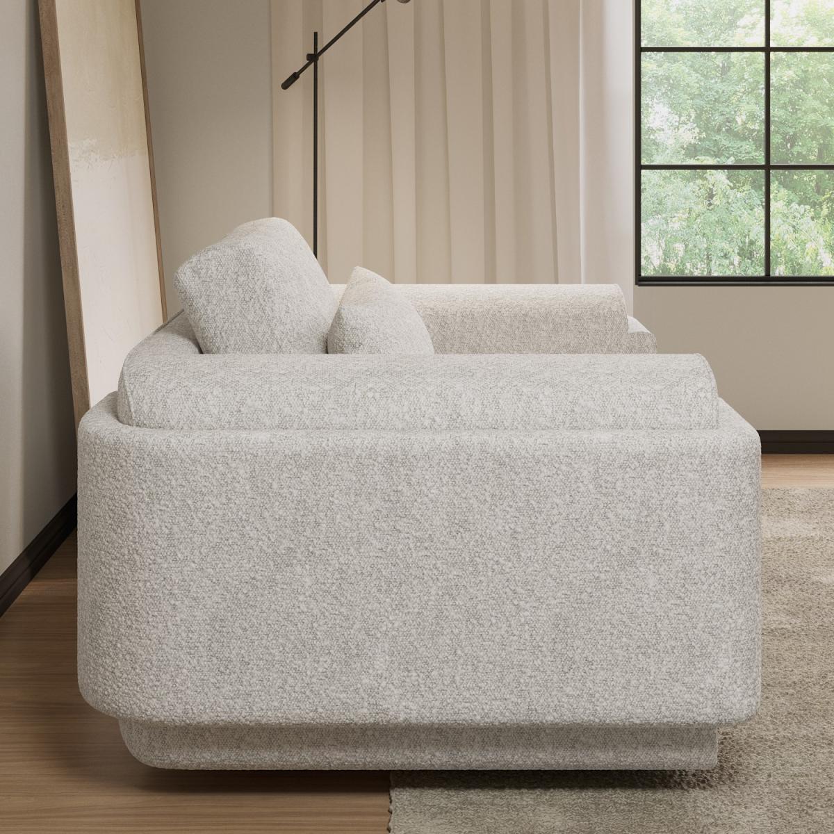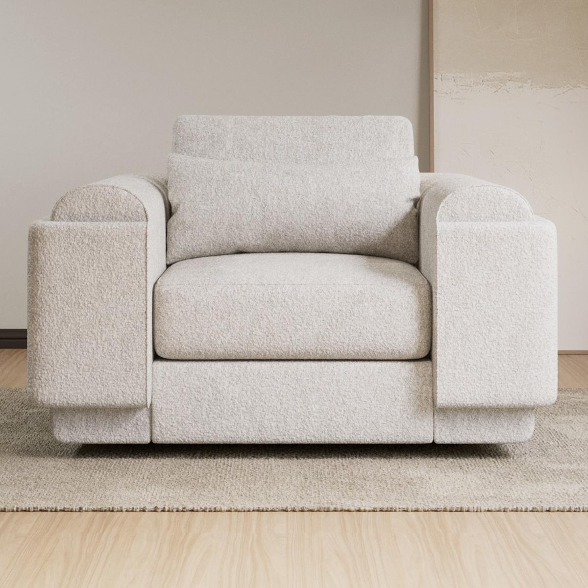 All about me. The Elvi cream boucle armchair is unique and beautifully upholstered in soft cream boucle fabric that’s guaranteed to create a statement in any living room. A long scatter cushion allows you to tailor your seating position and the seat and back cushions are filled with foam for optimum comfort. The frame is crafted from strong plywood and eucalyptus wood so the Elvi armchair is built to withstand the test of time. Need to know. Dimensions. W118 x D97 x H78 cm Packaging dimensions. W120 x D100 x H60 cm Weight. 45 kg Max supported weight. 110 kg per seat Colour. Cream Finish. Boucle fabric upholstery Material. Strong eucalyptus and plywood frame Filling. Foam Assembly required. Yes - just attach the legs.