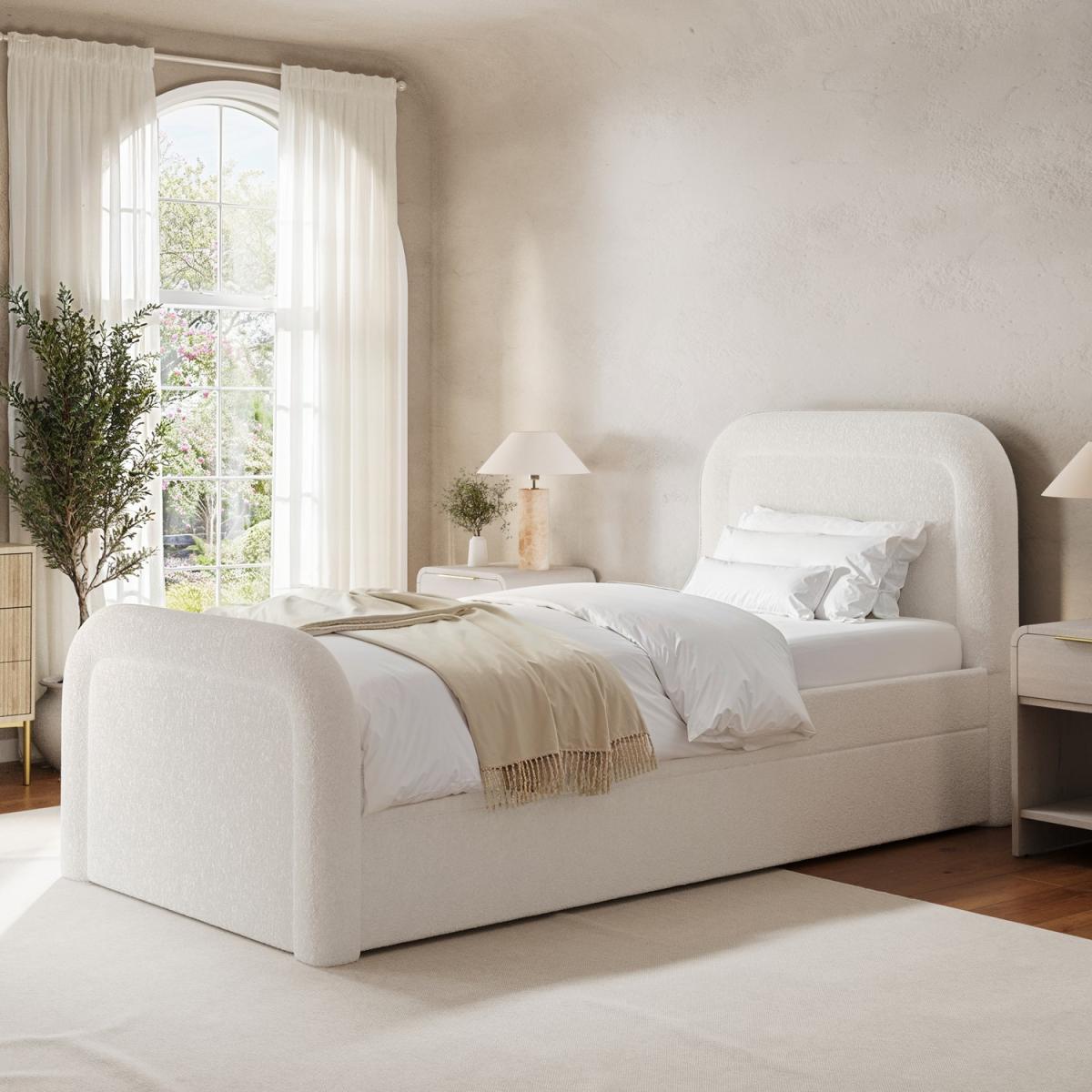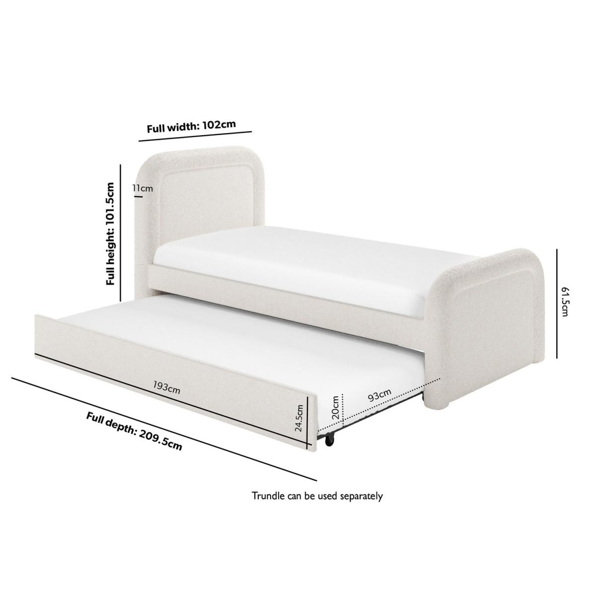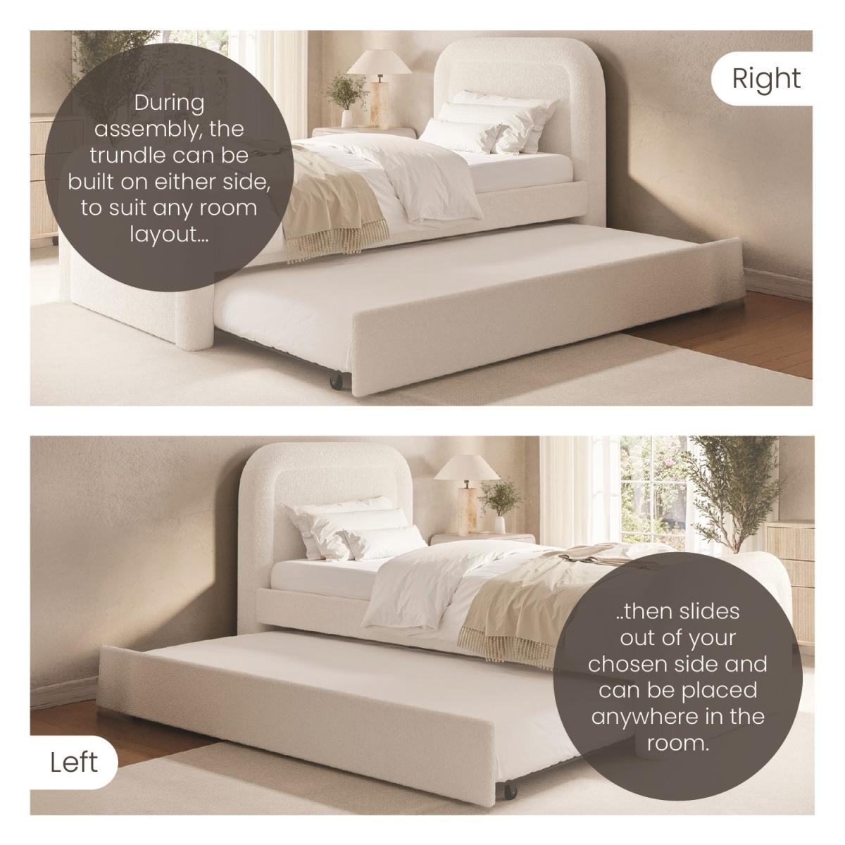 The curved headboard gives a modern and sophisticated look to your bedroom. Trundle is fitted with castor wheels and pulls out from either side for effortless movement and easy setup. The trundle neatly stores under the main bed when not in use, keeping the room clutter-free and organised. Provides excellent support for the mattress, promoting airflow for added comfort and longevity. Soft, durable fabric in a versatile cream shade complements various interior styles. The pull-out trundle bed is seamlessly integrated, making it ideal for hosting overnight guests without taking up extra space. Enhance your bedroom with the Naomi single guest bed with trundle. Upholstered in a textured cream boucle fabric, it features a plush curved headboard which blends comfort with style. This bed also offers a space-saving solution as the discreet pull-out trundle is perfect for a smaller room or an additional sleeping space. The trundle easily glides out as it's fitted with castor wheel and can be set up to open from the side that works best for your room. Both beds have wooden sprung-slatted bases for comfortable mattress support and fit a standard UK single mattress.