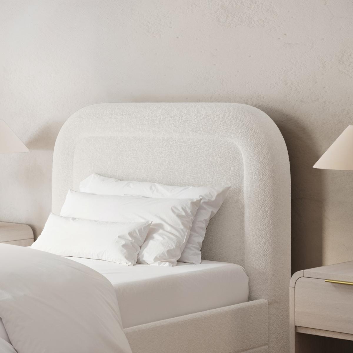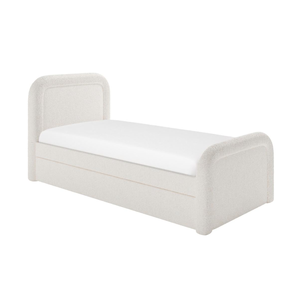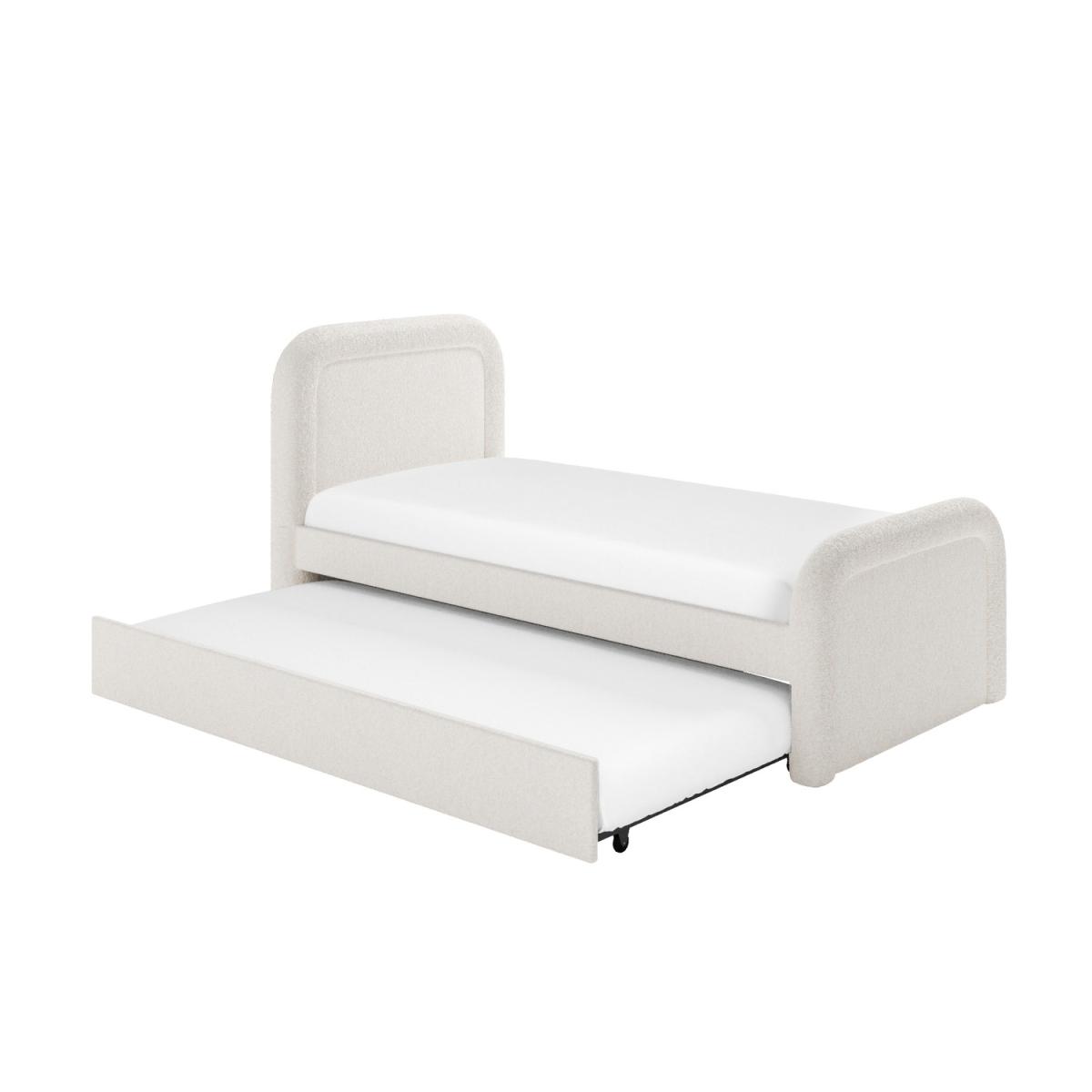 The curved headboard gives a modern and sophisticated look to your bedroom. Trundle is fitted with castor wheels and pulls out from either side for effortless movement and easy setup. The trundle neatly stores under the main bed when not in use, keeping the room clutter-free and organised. Provides excellent support for the mattress, promoting airflow for added comfort and longevity. Soft, durable fabric in a versatile cream shade complements various interior styles. The pull-out trundle bed is seamlessly integrated, making it ideal for hosting overnight guests without taking up extra space. Enhance your bedroom with the Naomi single guest bed with trundle. Upholstered in a textured cream boucle fabric, it features a plush curved headboard which blends comfort with style. This bed also offers a space-saving solution as the discreet pull-out trundle is perfect for a smaller room or an additional sleeping space. The trundle easily glides out as it's fitted with castor wheel and can be set up to open from the side that works best for your room. Both beds have wooden sprung-slatted bases for comfortable mattress support and fit a standard UK single mattress.
