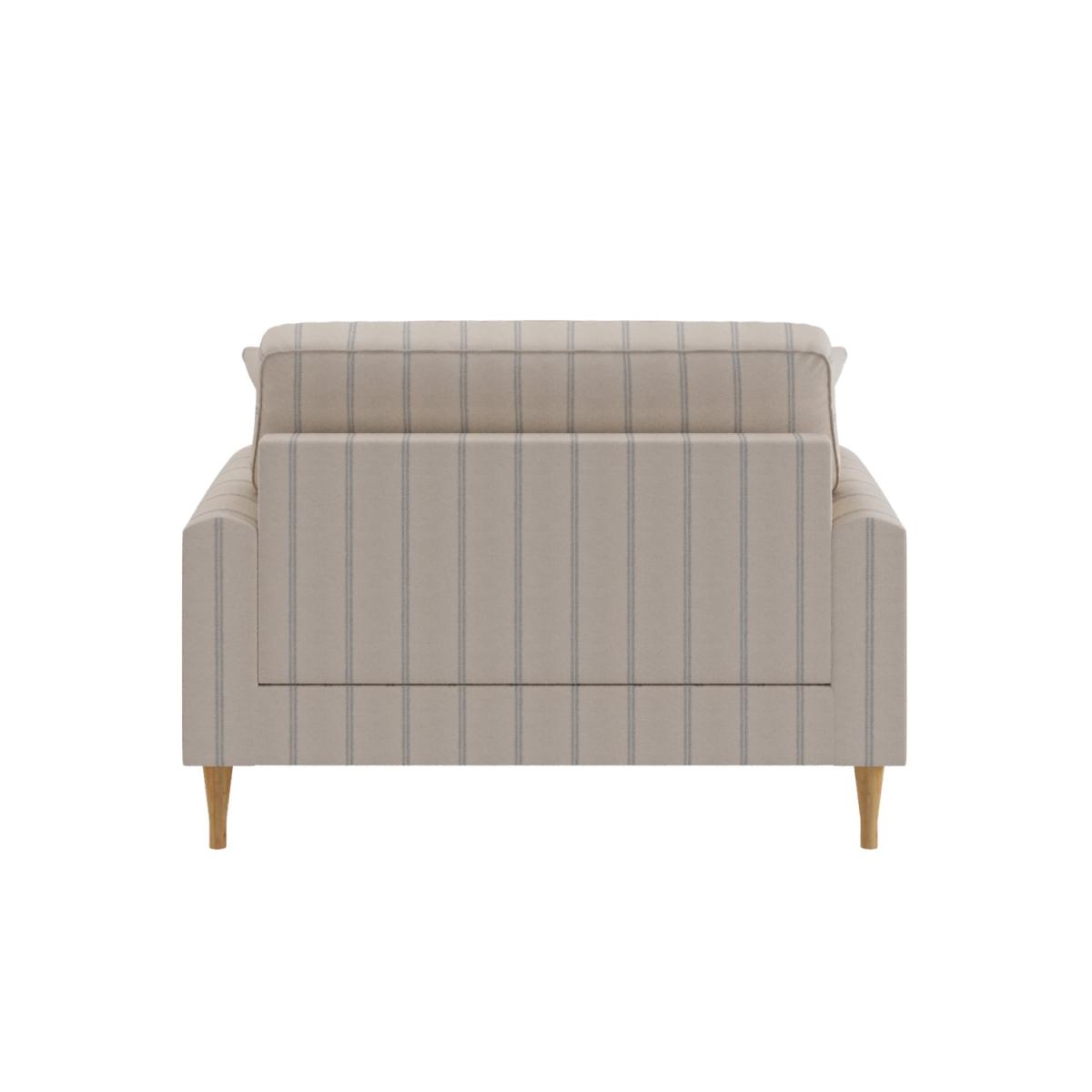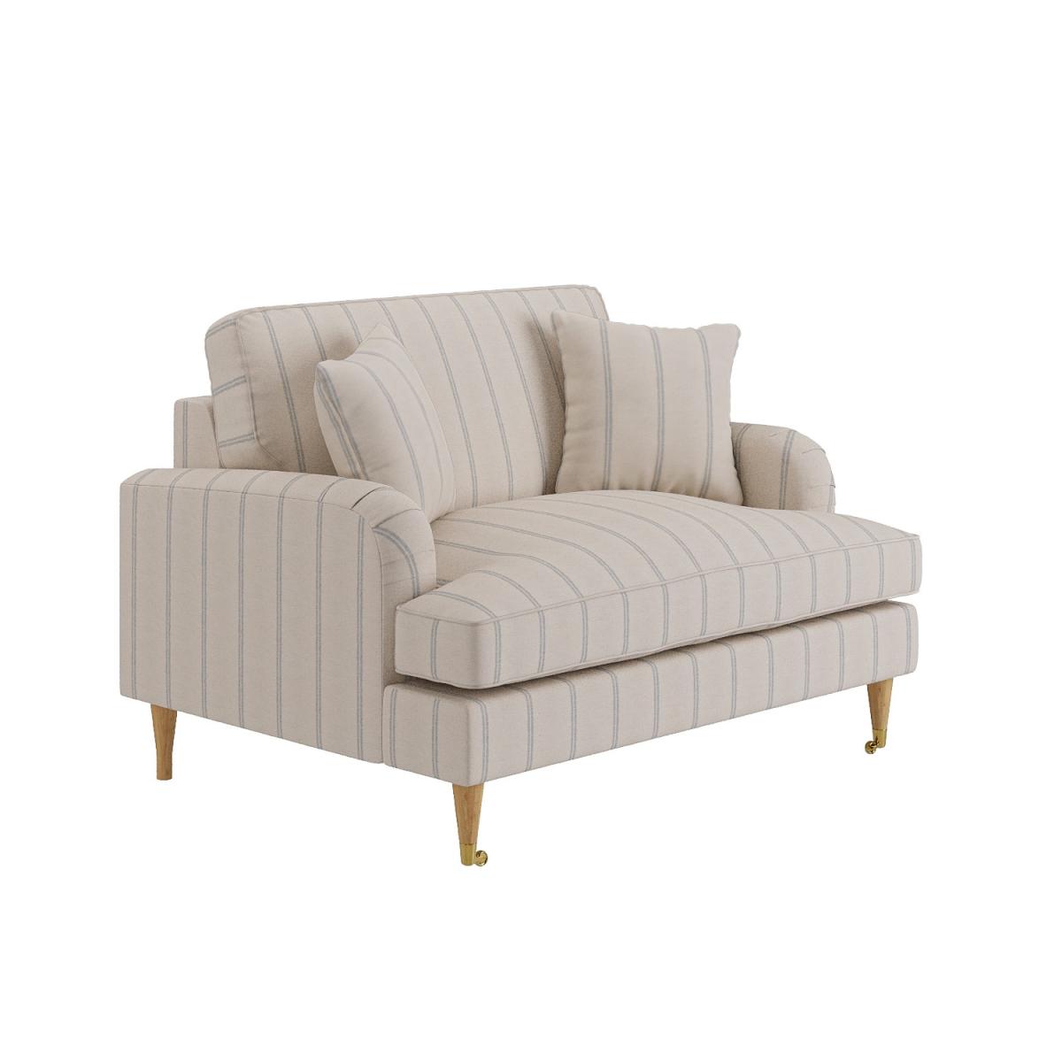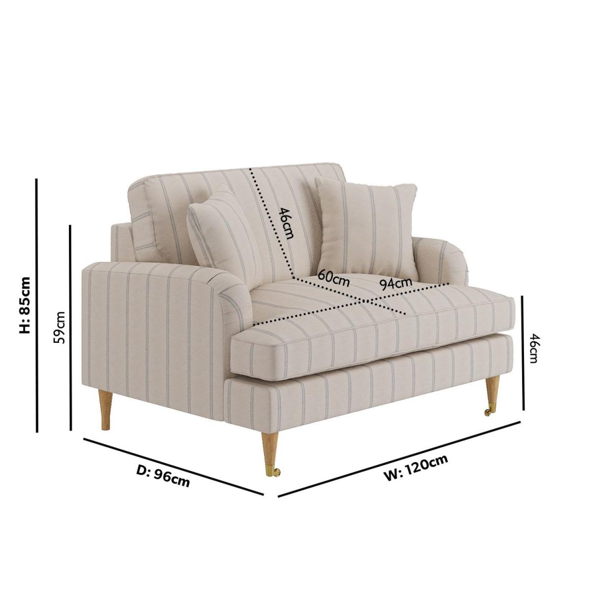 Sink into comfort with the Payton Cream with Light Blue Stripe Love Seat. Designed for two, this spacious cuddle chair is perfect for cosy nights in, whether you’re relaxing alone or cuddling up with a loved one. Upholstered in a soft cream chenille fabric with light blue stripe, this love seat brings a gentle and calming feeling to your space. Its deep, plush cushions offer a soft, inviting feel, making it the perfect statement piece for your living room, snug or bedroom. Comes with two matching throw cushions to help customise your seating position for optimum relaxation. Whether you prefer extra support or a laid-back lounging experience, this love seat adapts to your needs. The front legs feature castor wheels, allowing you to reposition the loveseat with ease. The sturdy back legs ensure it stays firmly in place once positioned. The castor wheels are fixed and cannot be removed. Crafted with a solid timber frame and high-quality materials, this traditional love seat is designed for long-lasting durability. It’s an investment in both style and comfort. Sink into the ultimate snuggle spot with our Payton cuddle chair, perfect for two people to cuddle up together, or to be enjoyed all to yourself. Crafted from a soft but durable woven chenille fabric for the perfect balance of comfort and practicality. It comes with two matching throw cushions to help tailor your seating position for optimum comfort. The front legs feature castors for added charm and easy movement, while the back legs hold it in place. The castor wheels can't be removed from the legs. Check out our upholstery care kit to keep your love seat in tip-top condition. Dark wood legs are available to purchase on this armchair; just add yours from our package deals, recommended accessories or at checkout. This Payton range comes with light oak legs as standard.