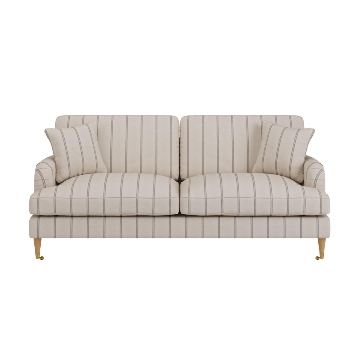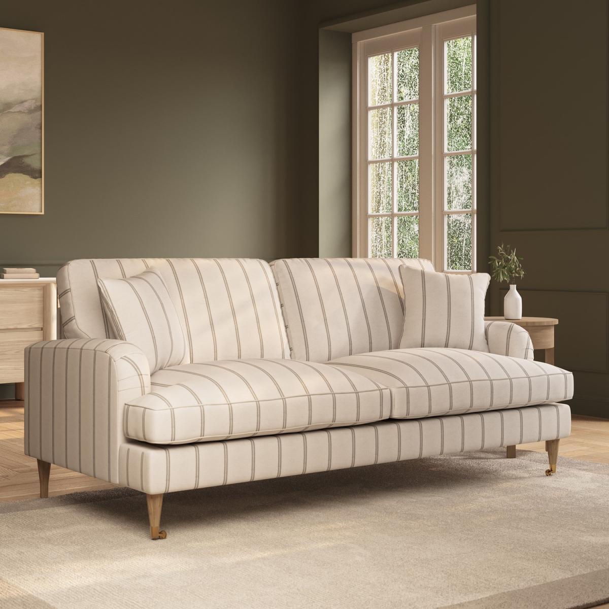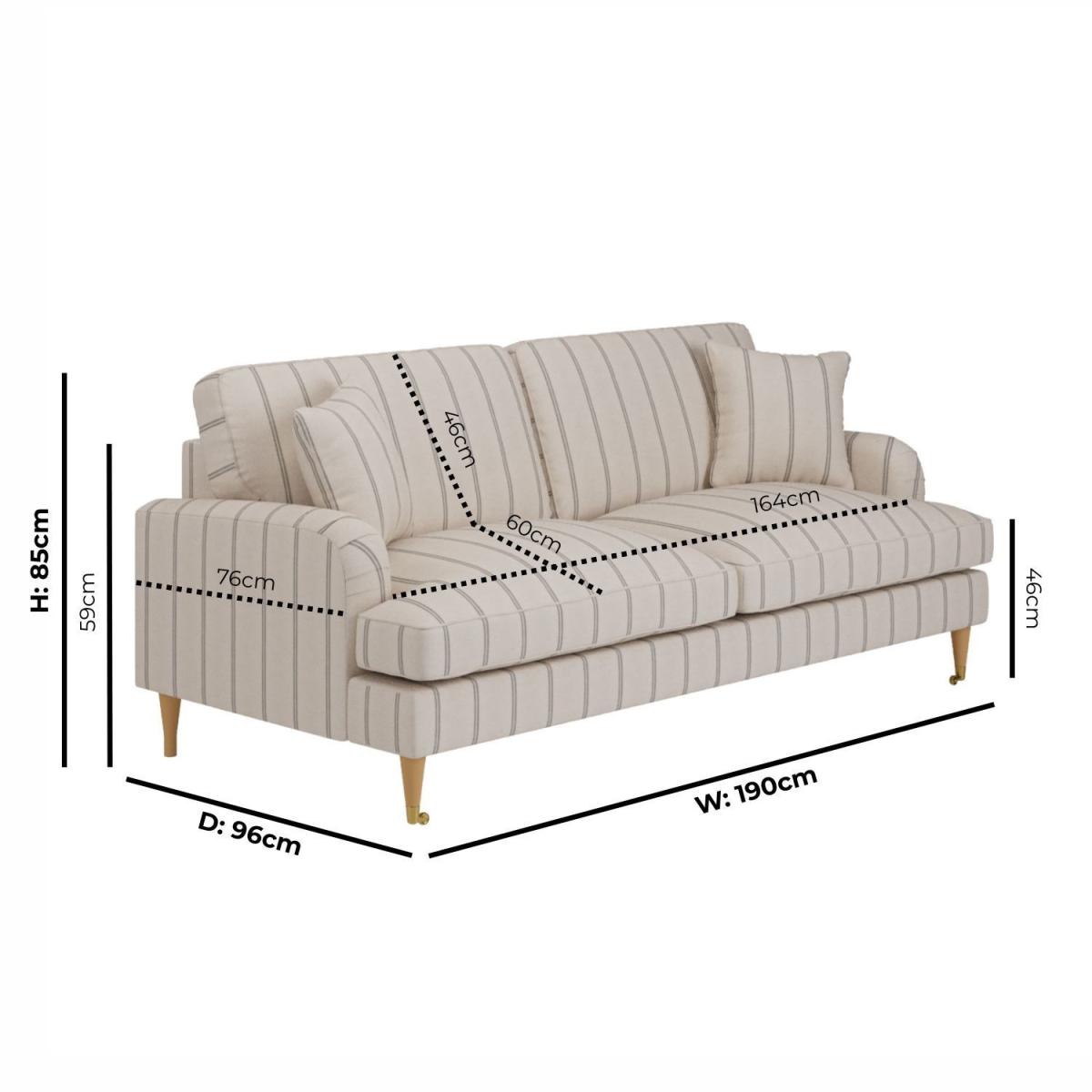 Foam filled Reversible Back Cushions Scatter Cushions Included With its classic ruched saddle arms and elegant silhouette, the Payton 3-Seater Sofa brings a touch of traditional charm to any interior. The refined detailing makes it a statement piece in any living space. Designed to seat three people comfortably, this sofa offers generous space for family gatherings, entertaining guests, or cosy nights in. The plush cushions provide deep, luxurious seating, making it an inviting centrepiece for any home. Crafted from high-quality solid wood, this sofa is built to last, providing strong and reliable support for years to come. The sturdy construction ensures everyday durability, making it a long-term addition to your living space. The light wooden legs add a sophisticated touch, while the gold castors blend classic charm with functional mobility. The castors make it easy to reposition the sofa without compromising stability. Upholstered in a high-quality chenille fabric, the Payton Sofa is soft to the touch, offering a comfortable and inviting seating experience. The subtle cream with grey stripe tone complements a variety of colour palettes, making it easy to integrate into any home. Whether used in a formal sitting area, a cosy living room, or an open-plan space, this sofa offers a blend of style, comfort, and practicality, making it ideal for families, couples, or entertaining guests. The Payton 3-Seater Sofa is the perfect blend of traditional elegance and modern comfort. Designed to accommodate up to three people, this spacious sofa offers a timeless aesthetic with ruched saddle arms, adding a touch of classic charm. Upholstered in high-quality chenille fabric in a subtle cream with grey stripe tone, it effortlessly complements any interior style. Built with a solid wood frame, this sofa is designed for durability and long-lasting support. The oak legs with gold castors provide a sleek and stylish contrast, elevating the look while ensuring easy manoeuvrability. For added personalisation, dark oak legs are available as an alternative, allowing you to tailor the sofa to your décor preferences. Comfort is key, and the removable back and seat cushions ensure plush seating and easy maintenance. Two matching scatter cushions add extra cosiness and style, making it an inviting centrepiece for your living space. With simple assembly required—just attach the legs—this sofa is a practical, stylish, and long-lasting addition to any home.