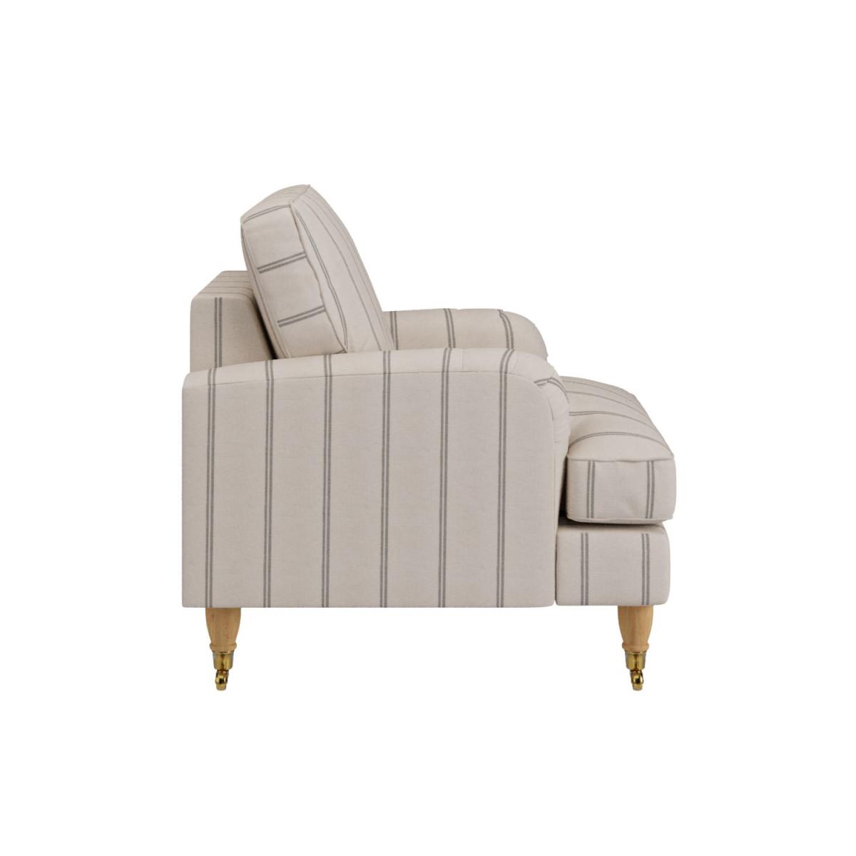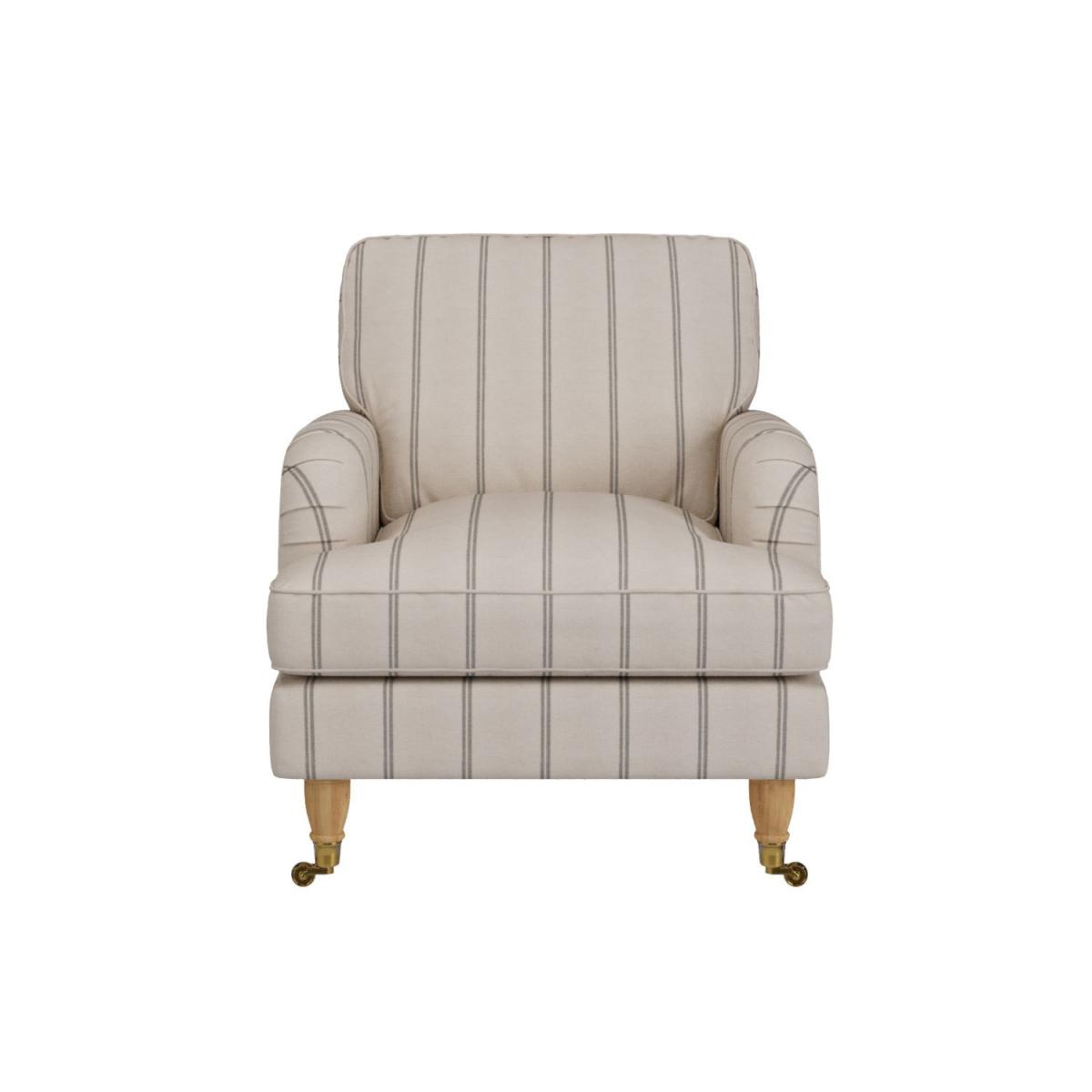 Create a warm and inviting space in your home with the Payton Grey Stripe Armchair. Whether you're curling up with a book or enjoying your favourite show, this armchair offers a comfortable retreat. Upholstered in a soft cream with grey stripe chenille, this armchair exudes a gentle and calming feeling to your space. Its smooth, modern silhouette blends effortlessly with classic and contemporary interiors. Designed with front castor wheels, this armchair is easy to move and reposition, making it ideal for versatile seating arrangements. The sturdy back legs keep it firmly in place. The castor wheels are fixed and cannot be removed. Featuring deep seat padding and a gently curved backrest, this chair provides excellent support and relaxation. The soft chenille upholstery enhances the snug, inviting feel. Crafted with a solid timber frame and high-quality materials, this armchair is designed for long-lasting durability. It’s an investment in both style and comfort. Create the ultimate cosy spot in your living room with our Payton armchair. The modern silhouette makes it the perfect statement piece, and with subtle grey stripe upholstery, it brings a touch of calming feeling to any space. The front legs feature castors for added charm and easy movement, while the back legs hold it in place. The castor wheels can't be removed from the legs. Check out our upholstery care kit to keep your armchair in tip-top condition. Dark wood legs are available to purchase on this product, just add yours from our package deals, recommended accessories or at checkout. This Payton range comes with light oak legs as standard.
