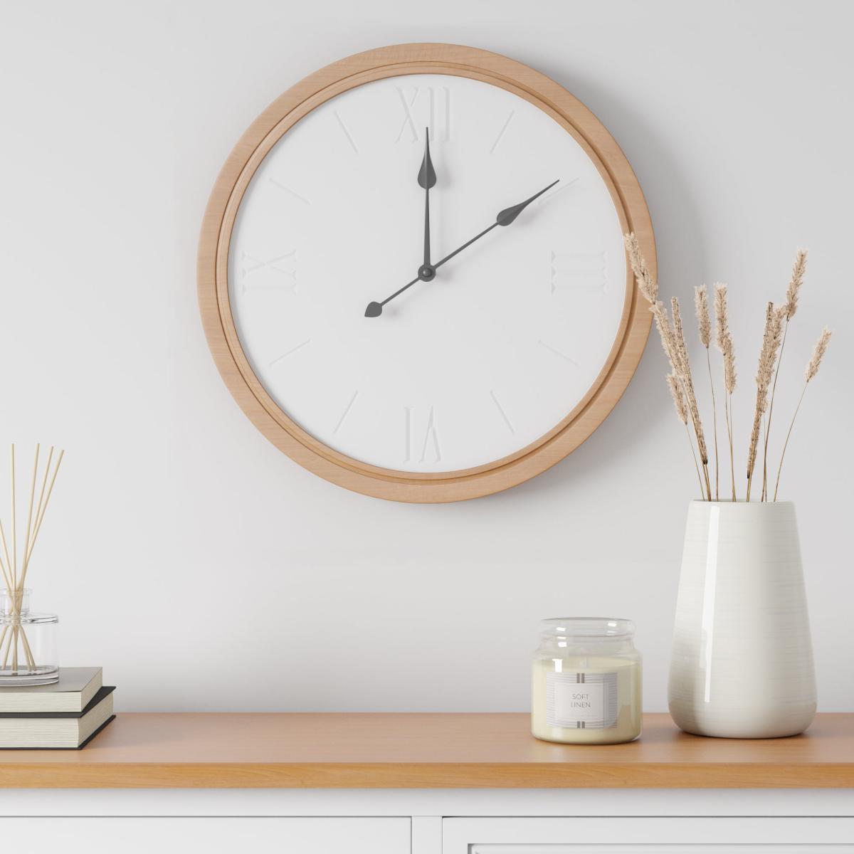 I love this clock for its clean, minimalist design and natural wood finish, which lends warmth and subtle texture to a variety of interiors. It works particularly well in Scandi-inspired, contemporary, or rustic spaces where simplicity and function are key. When styling, consider placing it against a neutral or soft-hued wall to let its understated elegance shine. Practical tips include pairing it with other wooden or natural materials in the room, such as a wooden console or woven textiles, to create a cohesive look. Its 45cm size makes it a versatile statement piece that’s both functional and stylish without overpowering the space.