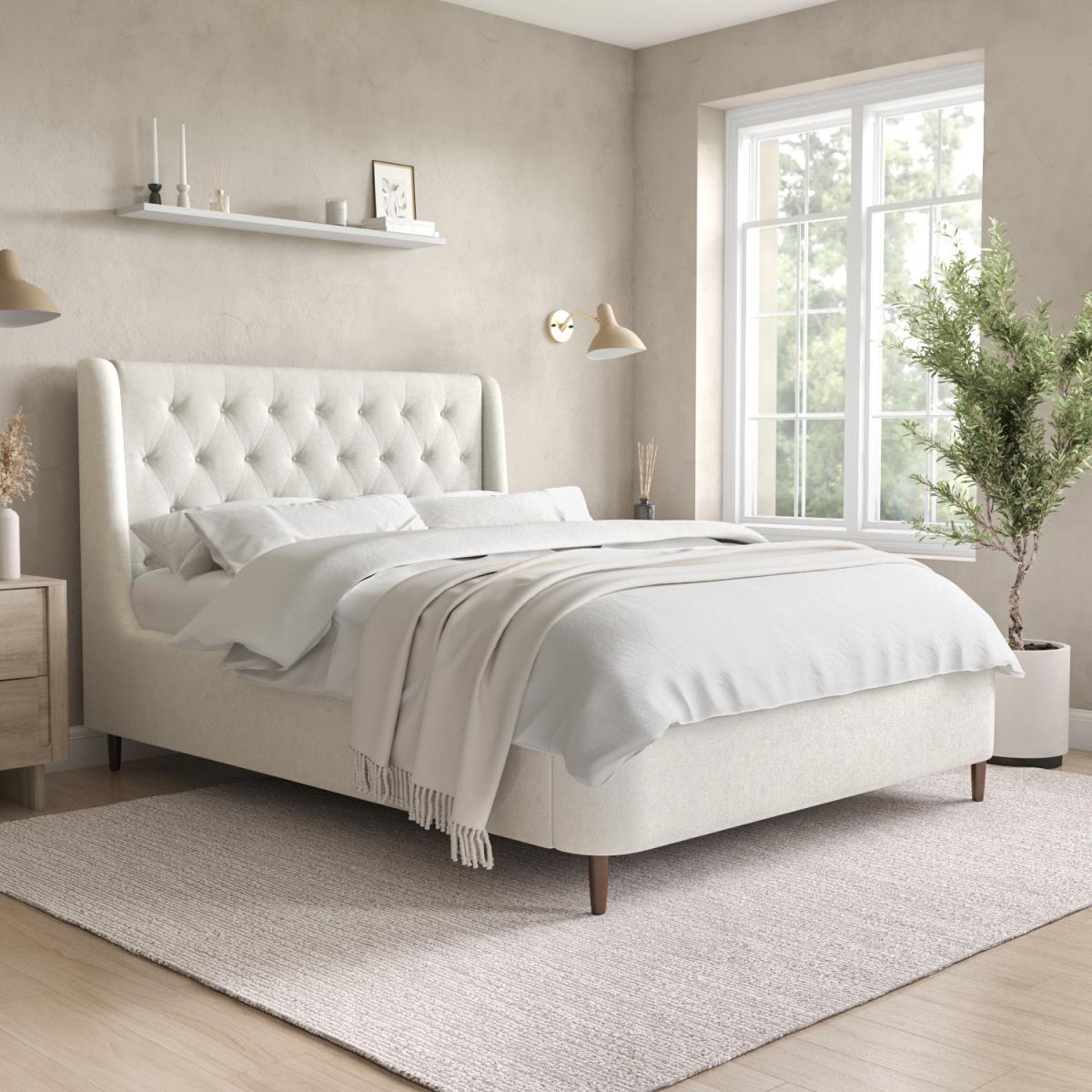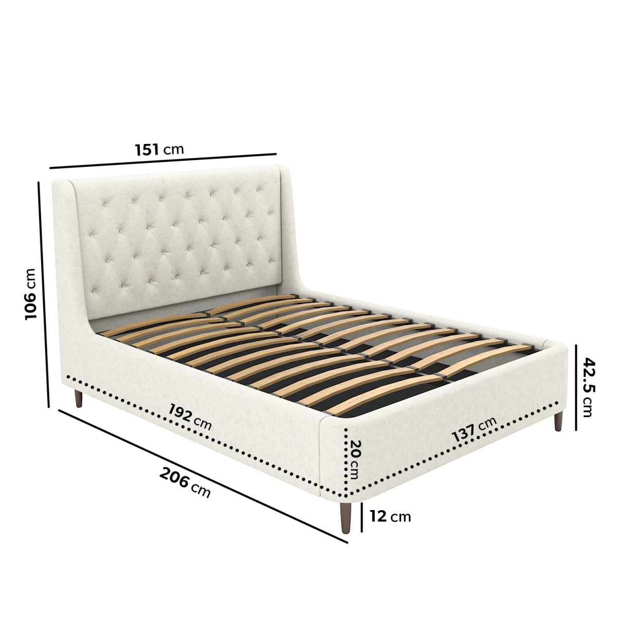 All about me The Amara double ottoman bed is guaranteed to make a stunning focal point in any bedroom, with a winged chesterfield headboard and plenty of storage for your belongings. It features a sturdy sprung-slatted base to keep your items protected and a gas-lift mechanism that ensures easy access to the space beneath. It's upholstered in an ultra-soft off-white woven fabric that complements its mid-century styling and dark wood legs. Need to know Bed dimensions:W151 x D206 x H118 cm Storage dimensions: W137 x D192 x H20 cm Mattress size: Standard UK double (4ft6) Mattress included: No Colour: Off-white Finish: Upholstered Material:Woven fabric Bed base: Sprung-slatted Weight: 63 kg Assembly required: Yes Packaging dimensions (3 boxes):W141 x D111 x H16 cm, W196 x D33 x H28 cm, W109 x D26 x H17 cm Please be advised the ottoman lift mechanism supports a weight of up to 55kg when open
