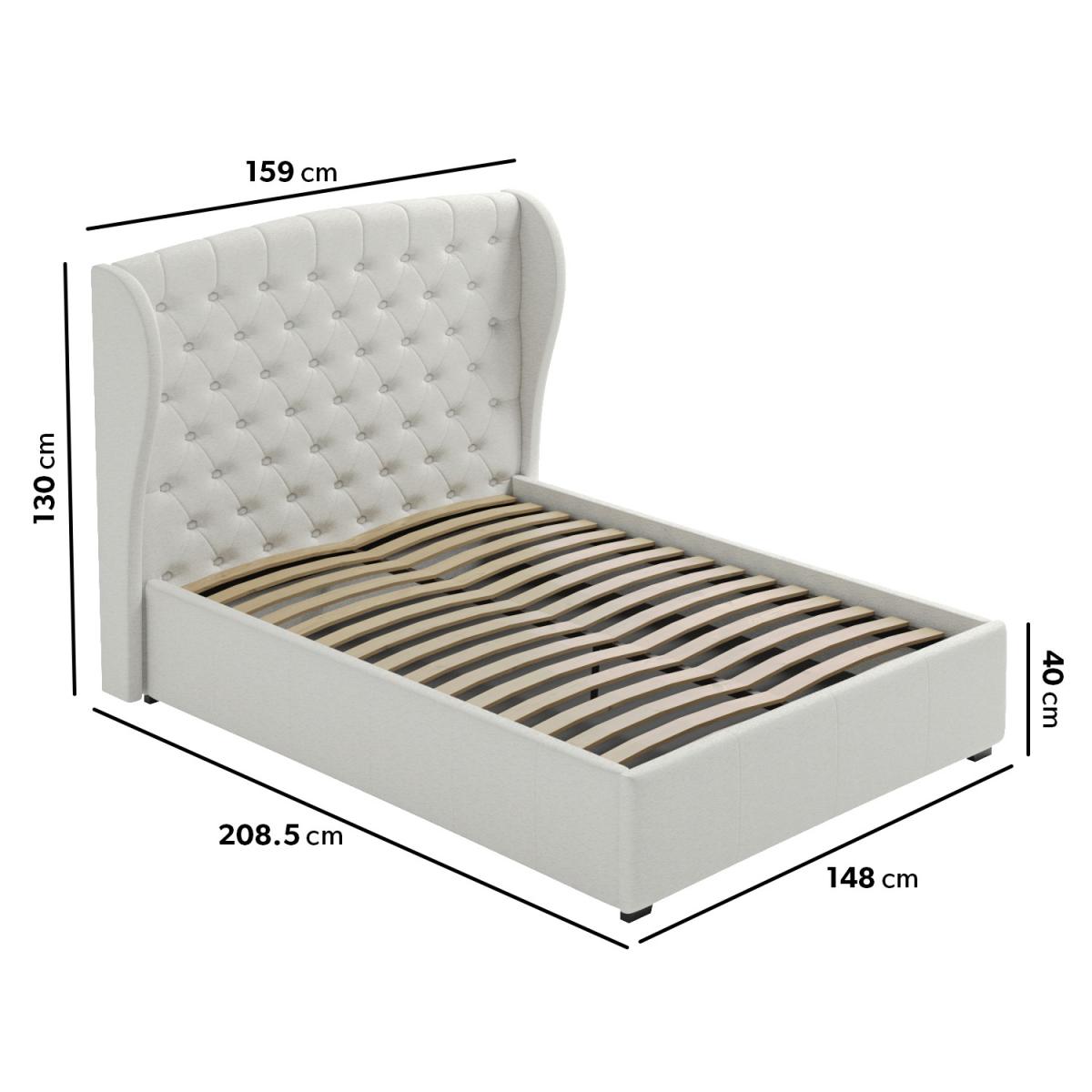 Features we love Elegant double ottoman bed with winged headboard Front-opening storage space with gas-lift pistons Upholstered in a durable natural cream woven fabric Fabric-lined base helps protect stored items from dust Save 10% off selected mattresses with this bed All about me Add a touch of luxury to any bedroom needing sophistication with this modern yet neutral Safina wingback ottoman bed frame. From its chesterfield inspired headboard with deep button tuft detailing to its tall silhouette, it makes it the ideal place to prop up and relax. It's space-saving, too, as the entire space beneath can store anything from clothes and shoes to bedding and towels. You'll soon be clutter-free. Made with a strong wooden frame, it's been built to last. It fits any UK standard double mattress, which isn't included giving you the freedom to choose one that's perfect for you; check out our package deals below. Need to know Packaging dimensions: Box 1: W127 x D152 x H14 cm / Box 2: W38 x D197 x H20.5 cm Packaging weights: Box 1: 26kg / Box 2: 33kg Product dimensions:W159 cm x D208.5 x H130 cm Inner storage dimensions:W138.5 x D193 x H30 cm Bed mattress size: Standard UK Double (4ft 6”) Colour: Cream Finish: Upholstered Material:Woven fabric Bed base:Wooden sprung slatted Assembly required:Yes, it comes flat packed Mattresses included: No Please be advised the ottoman lift mechanism supports a weight of up to 55kg when open