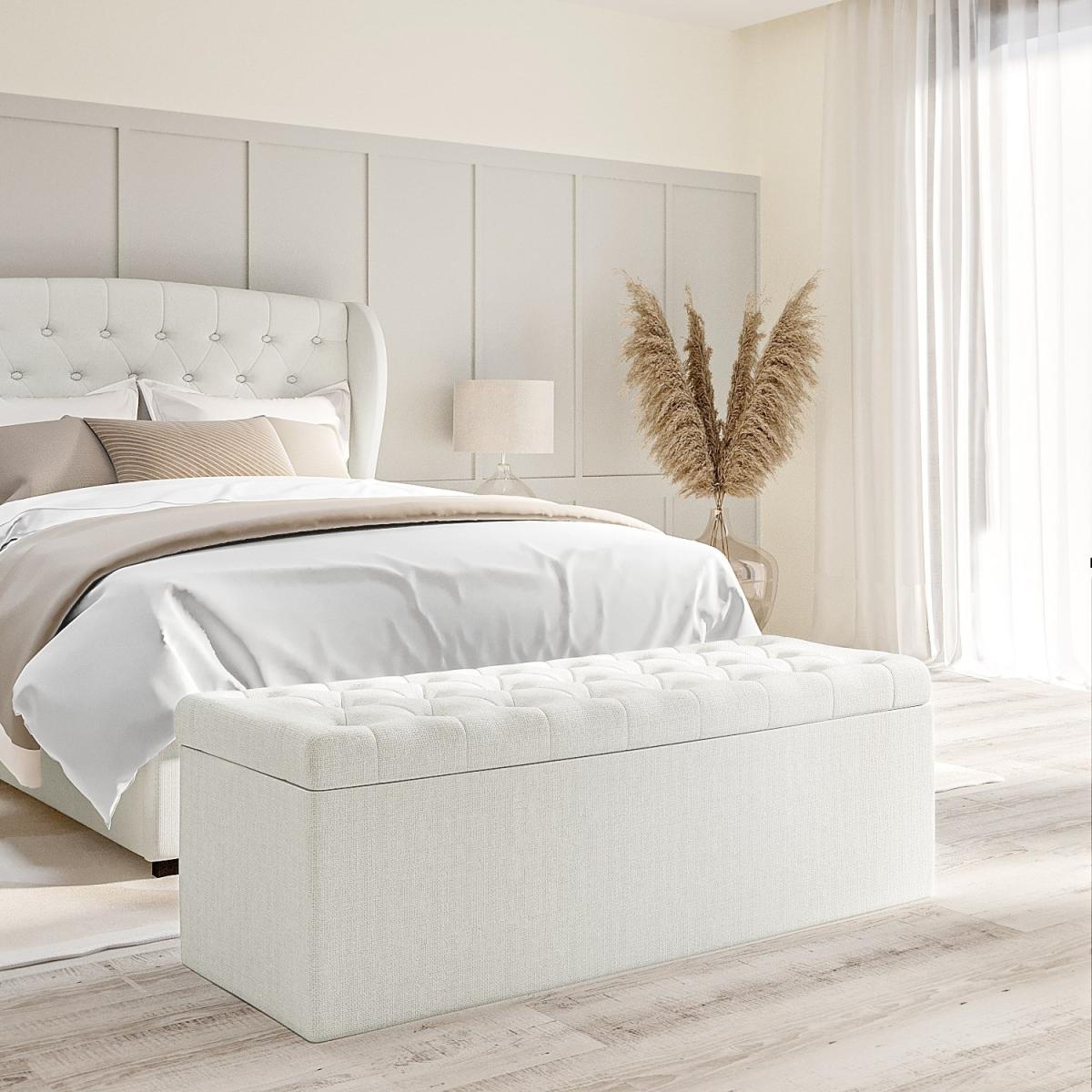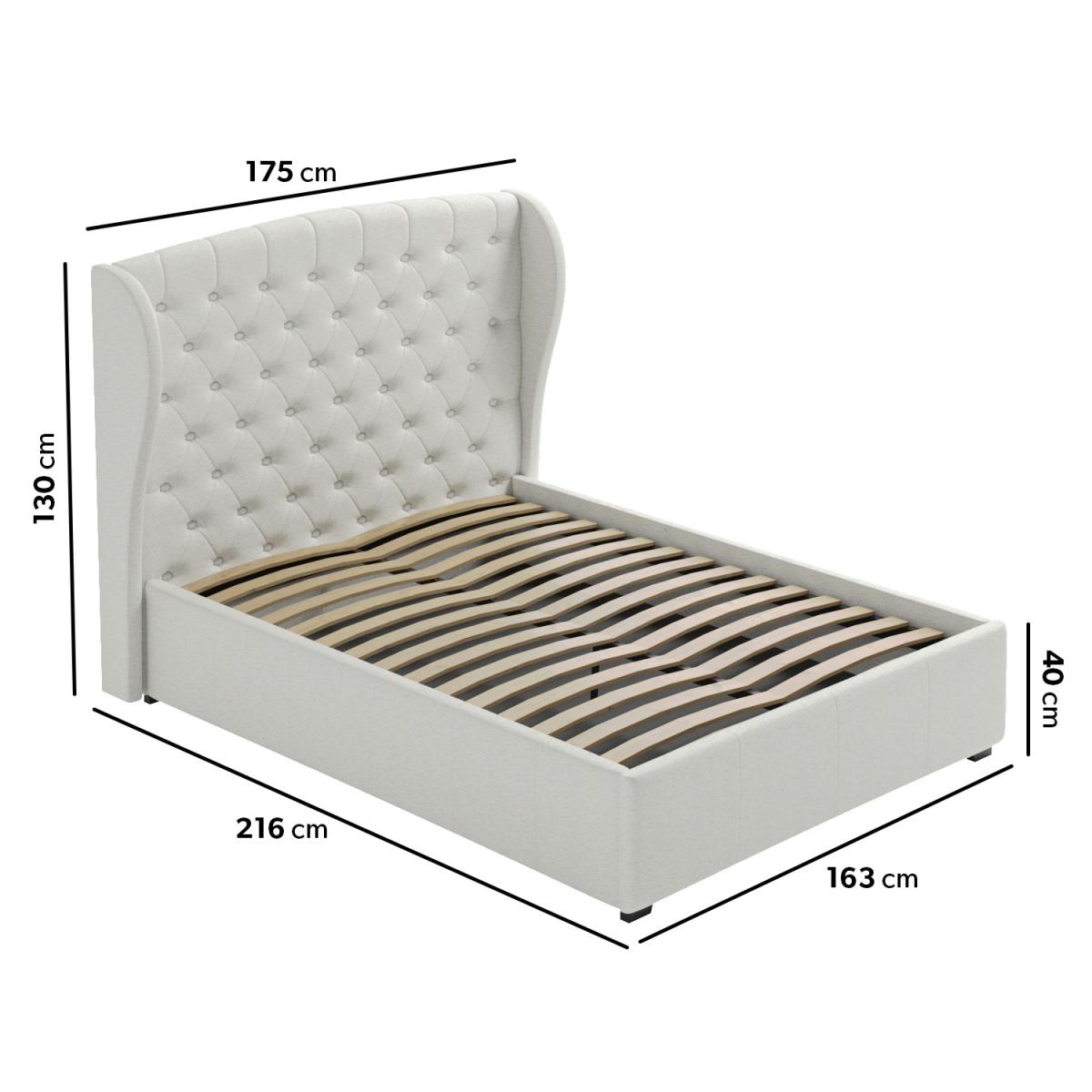 This bundle includes: Grey Velvet King-size Ottoman with Winged Headboard – Safina Grey Velvet Ottoman Blanket Box - Safina Features we love Ottoman bed with winged headboard and blanket box Upholstered in a durable natural cream woven fabric Bed has front-opening storage with gas-lift pistons Both offer plenty of storage space for bedroom items Save 10% off selected mattresses with this bed All about me Add a touch of luxury to any bedroom needing sophistication with this modern yet neutral Safina wingback ottoman bed frame with a matching blanket box. The tall chesterfield inspired headboard with deep button tuft detailing makes the ideal place to prop up and relax. The padded and button-tufted blanket box with stay open lid makes a great end-of-bed bench or even a stunning window seat. It's space-saving, too, thanks to the vast amount of hidden storage, so items are discreetly stored away and your bedroom clutter-free. Need to know Bed packaging dimensions:Box 1: W127 x D168 x H14 cm / Box 2: W38 x D204 x H20.5 cm Bed packaging weights: Box 1: 27.2kg / Box 2: 36.2kg Bed assembled dimensions: W175 cm x D216 x H130 cm Bed inner storage dimensions:W154.5 x D200.5 x H30 cm Bed mattress size: Standard UK King (150 x 200cm / 5ft) Blanket box dimensions:W130 cm x D46 x H44 cm Blanket box inner storage dimensions:W121 x D36 x H33.5 cm Colour: Cream Finish: Upholstered Bed material: Solid wood combination, metal, foam, and woven fabric Bed base:Wooden sprung slatted Blanket box material: Plywood and woven fabric Assembly required:Bed yes, it comes flat packed / Blanket box comes fully assembled Mattresses included: No