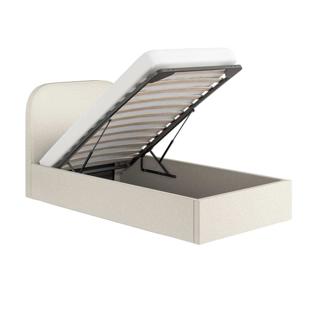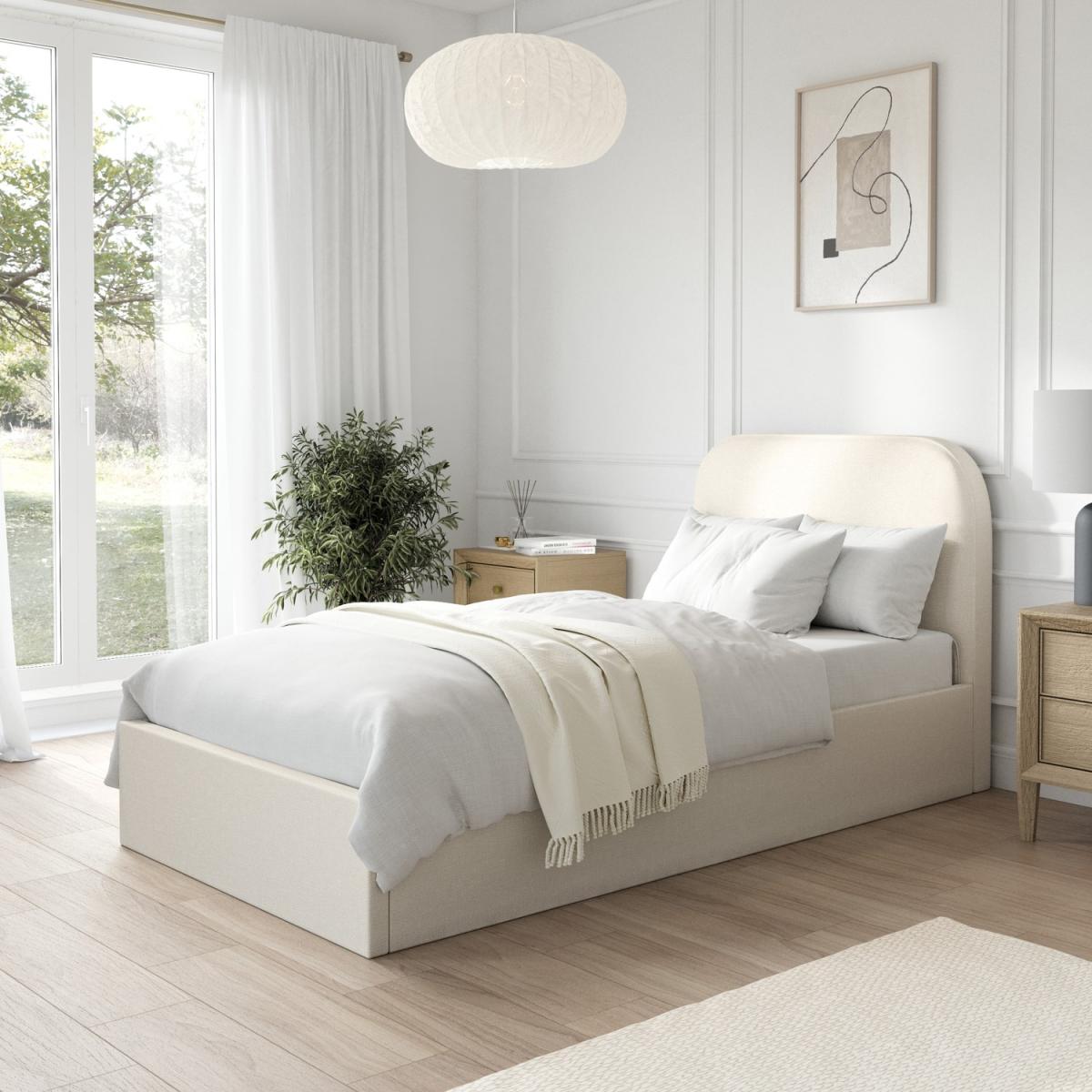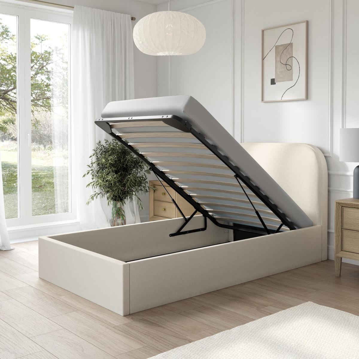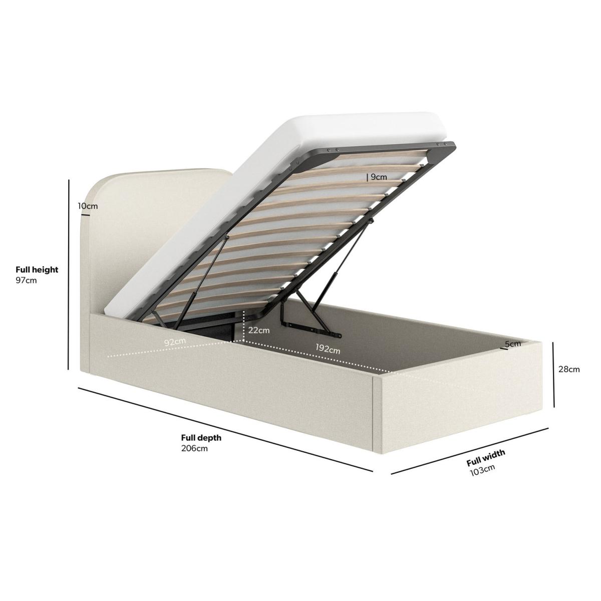Adds a touch of sophistication and style to your bedroom. Convenient storage space accessible via a smooth gas-lift mechanism, ideal for bedding, pillows, or seasonal items. The storage compartment features a fabric-lined base, protecting stored items from dust and wear. Provides excellent support for the mattress, promoting airflow for added comfort and longevity. Soft and durable fabric in a versatile cream shade complements various interior styles. Ideal for maximising bedroom storage without compromising on style. The Zara ottoman bed frame is perfect for lovers of a minimalist style. This modern bed combines functionality and comfort in one contemporary design. Featuring a thick padded headboard upholstered in durable, soft-to-touch cream fabric and easy-access ottoman storage for keeping clothes and bedding neatly tucked away. Built with a sturdy wooden frame and a sprung-slatted base supported by central legs, this bed ensures long-lasting durability and stability. This bed fits a UK standard single-size mattress, which can be purchased with a 10% discount when bought with this bed - see our package deals below.