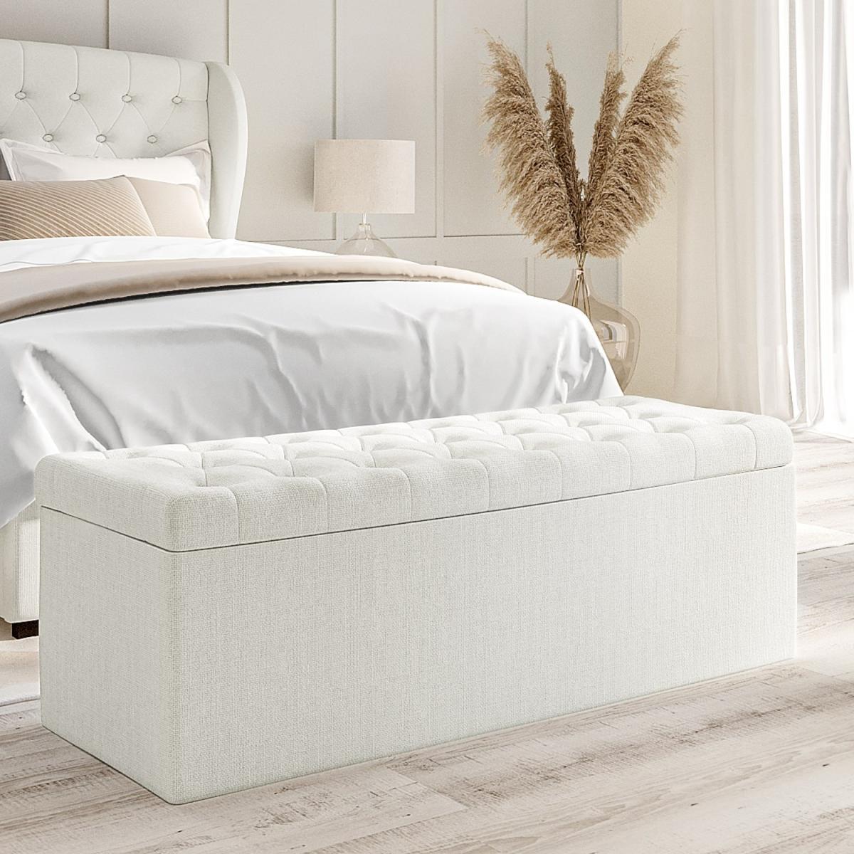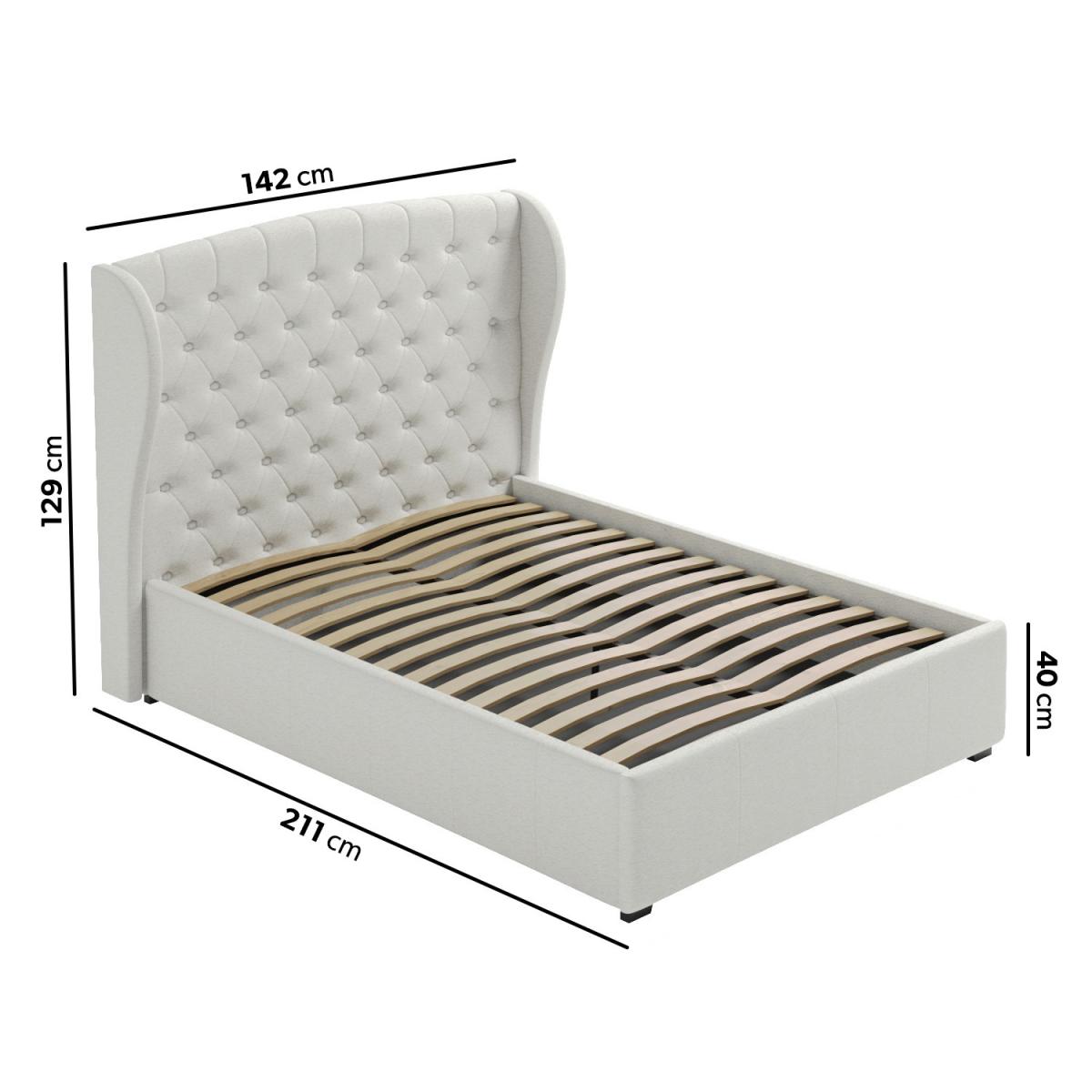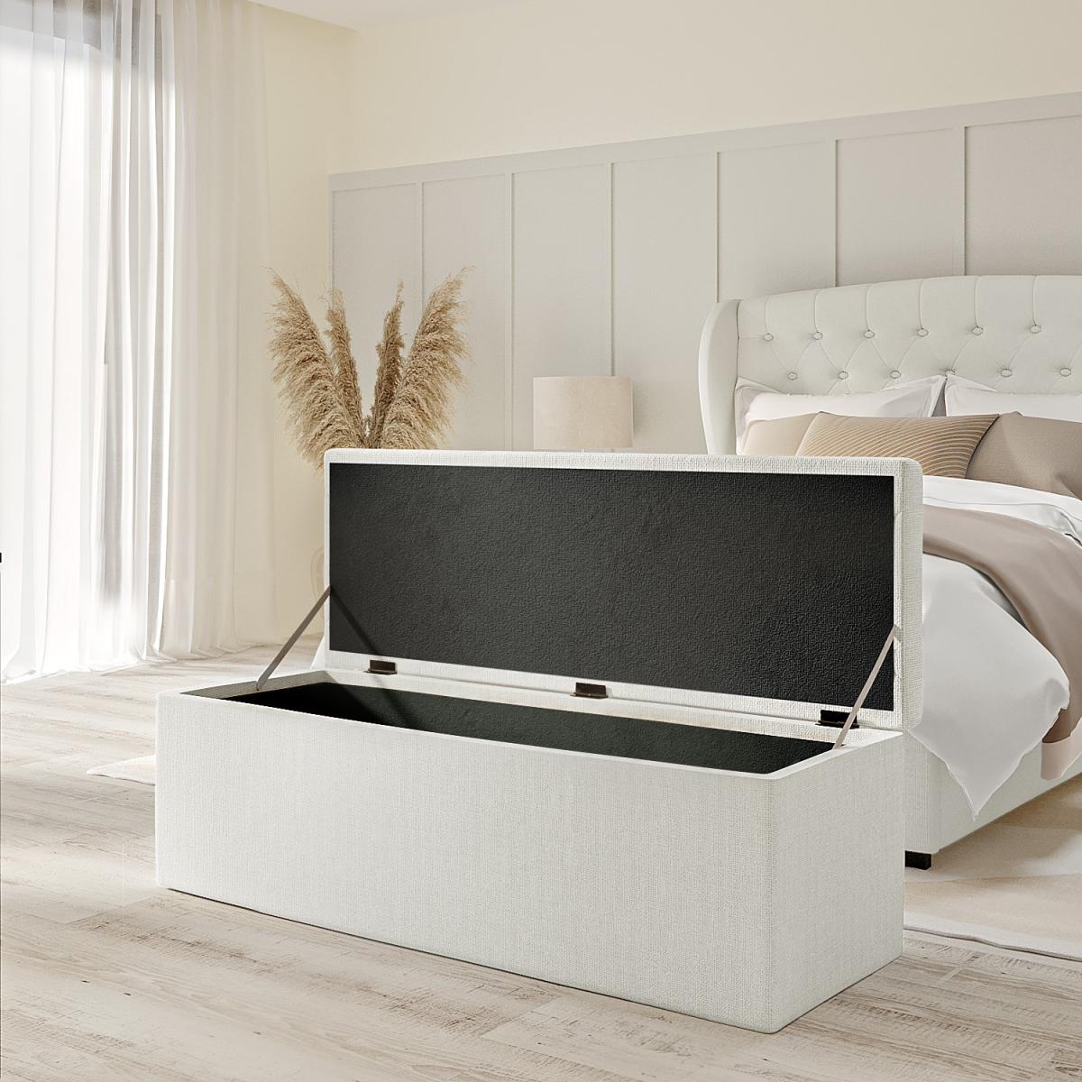 This bundle includes: Cream Fabric Small Double Ottoman with Winged Headboard – Safina Cream Fabric Ottoman Blanket Box - Safina Features we love Ottoman bed with winged headboard and blanket box Upholstered in a durable natural cream woven fabric Bed has front-opening storage with gas-lift pistons Both offer plenty of storage space for bedroom items Save 10% off selected mattresses with this bed All about me Add a touch of luxury to any bedroom needing sophistication with this modern yet neutral Safina wingback ottoman bed frame with a matching blanket box. The tall chesterfield inspired headboard with deep button tuft detailing makes the ideal place to prop up and relax. The padded and button-tufted blanket box with stay open lid makes a great end-of-bed bench or even a stunning window seat. It's space-saving, too, thanks to the vast amount of hidden storage, so items are discreetly stored away and your bedroom clutter-free. Need to know Bed packaging dimensions:Box 1: W127 x D138 x H13 cm / Box 2: W38 x D197 x H20.5 cm Bed Packaging weights: Box 1: 26.5 kg / Box 2: 31 kg Bed assembled dimensions: W142 cm x D211 x H129 cm Bed inner storage dimensions: W124 x D193 x H30 cm Bed mattress size: Standard UK Small Double (4ft ) Blanket box dimensions: W130 cm x D46 x H44 cm Blanket box inner storage dimensions:W121 x D36 x H33.5 cm Colour: Cream Finish: Upholstered Bed material: Solid wood combination, metal, foam, and woven fabric Bed base:Wooden sprung slatted Blanket box material: Plywood and woven fabric Assembly required:Bed yes, it comes flat packed / Blanket box comes fully assembled Mattresses included: No