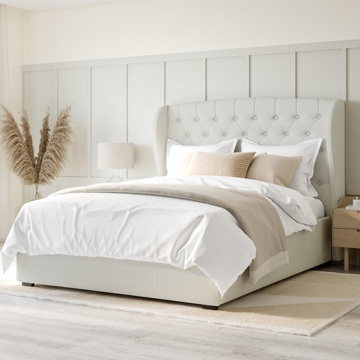 Features we love Luxurious Small Double ottoman bed with winged headboard Upholstered in a durable natural cream woven fabric Lift-up front opening storage space with gas mechanism Fabric lined base helps protect stored items from dust Save 10% off selected mattresses with this bed All about me Make a stunning statement in your bedroom with this Safina wingback ottoman bed frame with an elegant chesterfield inspired design. It includes a tall, modern headboard with deep button detailing, perfect for propping up and relaxing. It's space-saving, too, thanks to the ottoman design, which means you can store anything from bedding to towels or even an unsightly suitcase. You'll soon be clutter-free. Made with a strong wooden frame, it's been built to last. It fits any UK standard small double mattress, which isn't included giving you the option to choose one that's perfect for you; check out our package deals below. Need to know Packaging dimensions:Box 1 : W127 x D138 x H13cm / Box 2: W38 x D197 x H20.5cm Packaging weights: Box 1: 26.5kg / Box 2: 31kg Product dimensions:W142 x D211 x H129cm Inner storage dimensions:W124 x D193 x H30cm Bed mattress size: Standard UK Small Double (4ft) Colour: Cream Finish: Upholstered Material:Woven Fabric Bed base:Wooden sprung slatted Assembly required:Yes, it comes flat packed Mattresses included: No Please be advised the ottoman lift mechanism supports a weight of up to 55kg when open