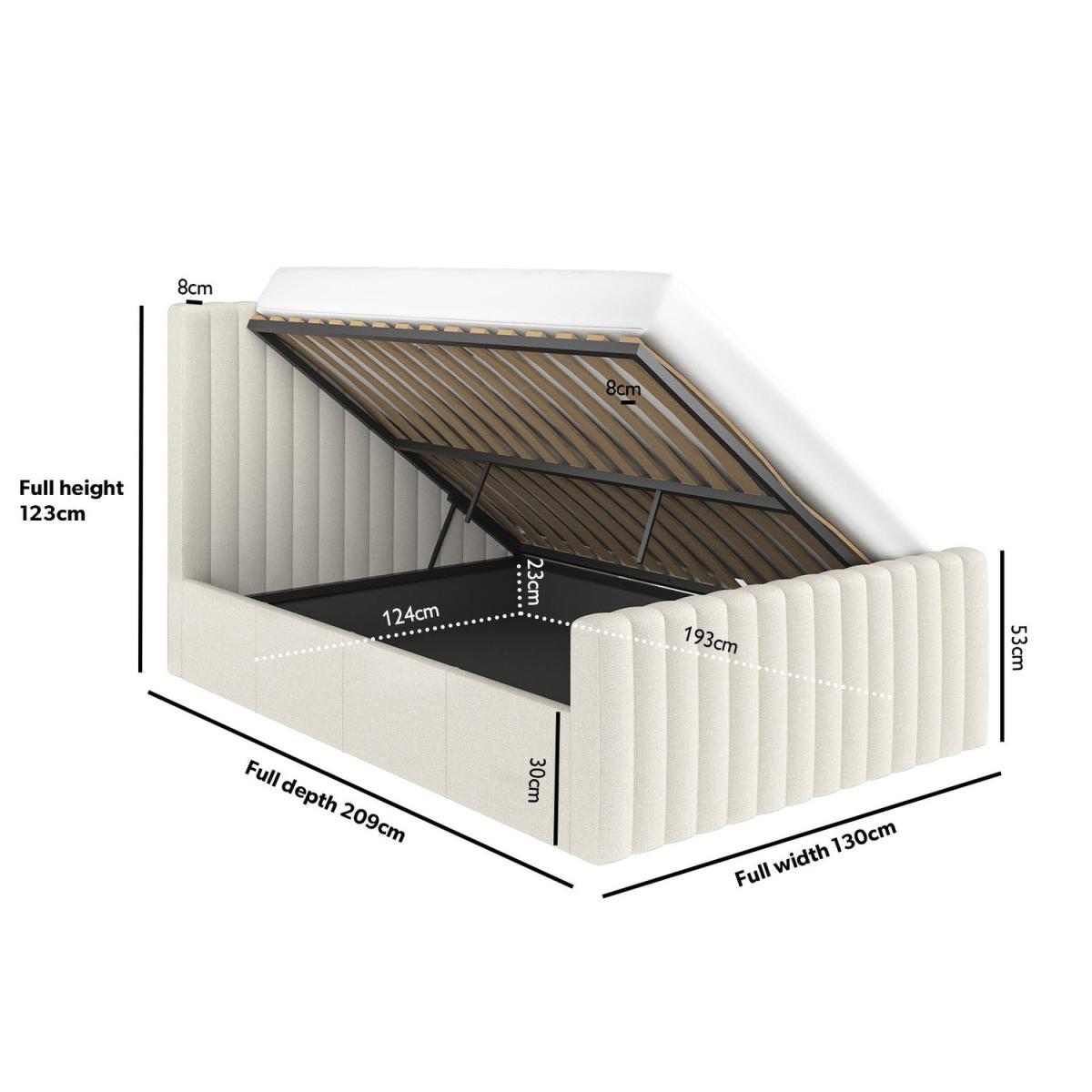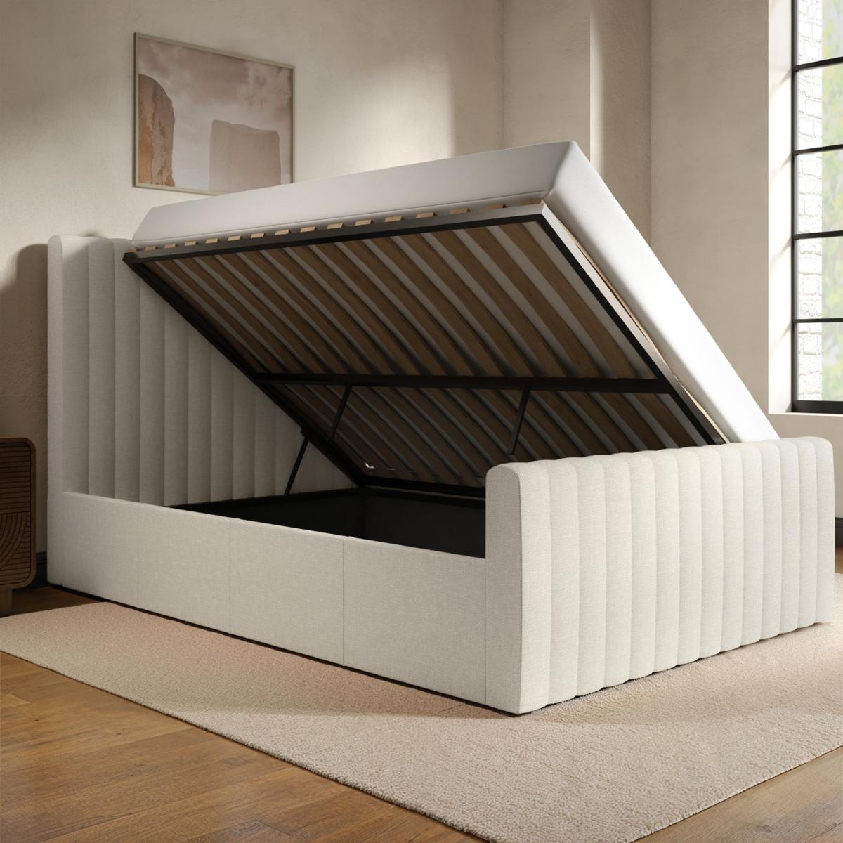 The contemporary vertical stitch detailing on the headboard and footboard adds a touch of sophistication, creating a striking focal point in any bedroom. Convenient storage space accessible via a smooth gas-lift mechanism, ideal for bedding, pillows, or seasonal items. Provides excellent support for the mattress, promoting airflow for added comfort and longevity. Soft and durable fabric in a versatile cream shade complements various interior styles. Ideal for maximising bedroom storage without compromising on style. The Khloe Ottoman Bed is an opulent focal point for any bedroom, perfect for adding a touch of luxury while offering practical hidden storage. Upholstered in a soft, durable cream woven fabric, it fits seamlessly into any modern bedroom design. The side-opening gas-lift mechanism allows you to access the generous fabric-lined storage space effortlessly. You can also set the storage frame to open on either the right or left-hand side, allowing extra freedom with your bedroom layout. It features a sprung slatted base for comfortable mattress support, ensuring a great night's sleep. This bed fits a UK standard small double-size mattress, which is not included, giving you the freedom to pair it with a mattress of your choice.
