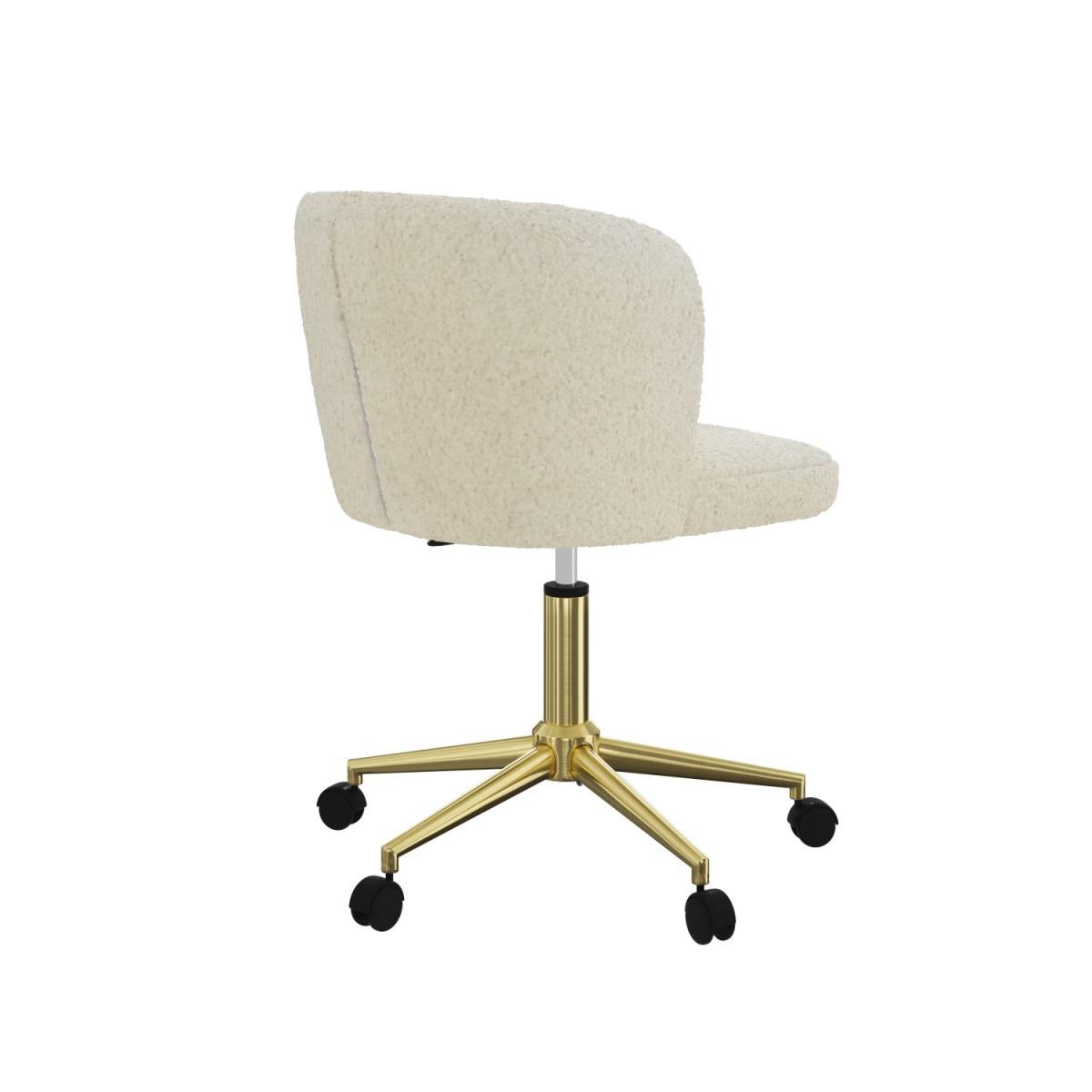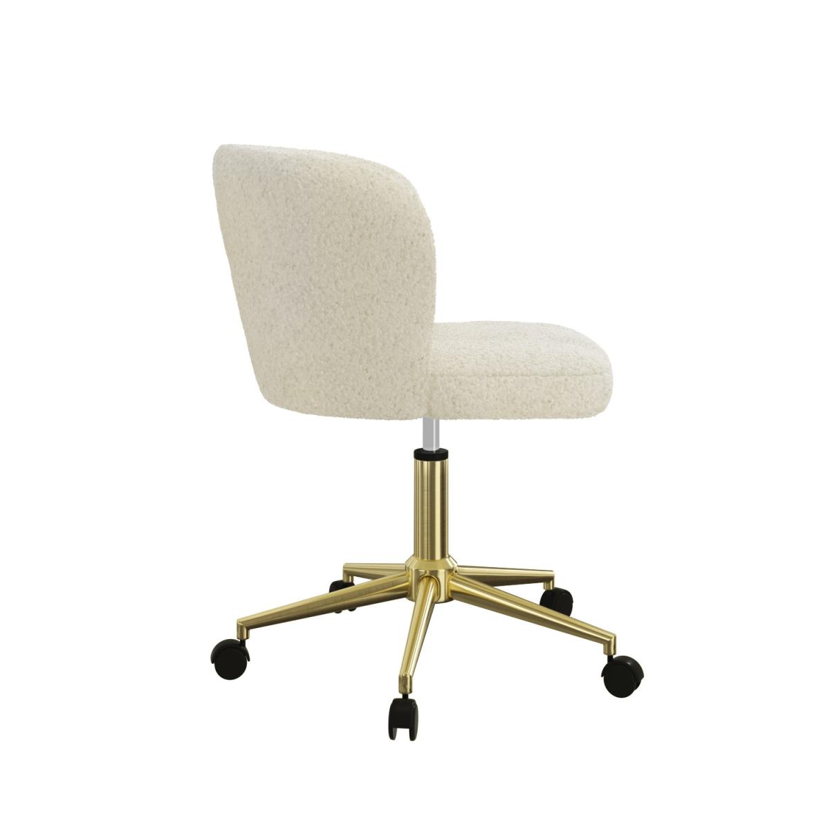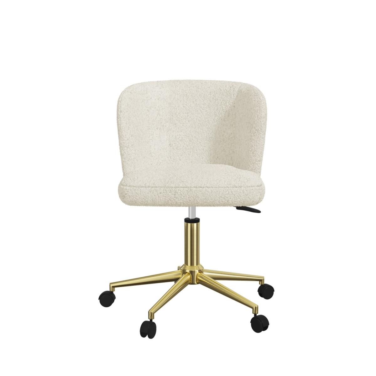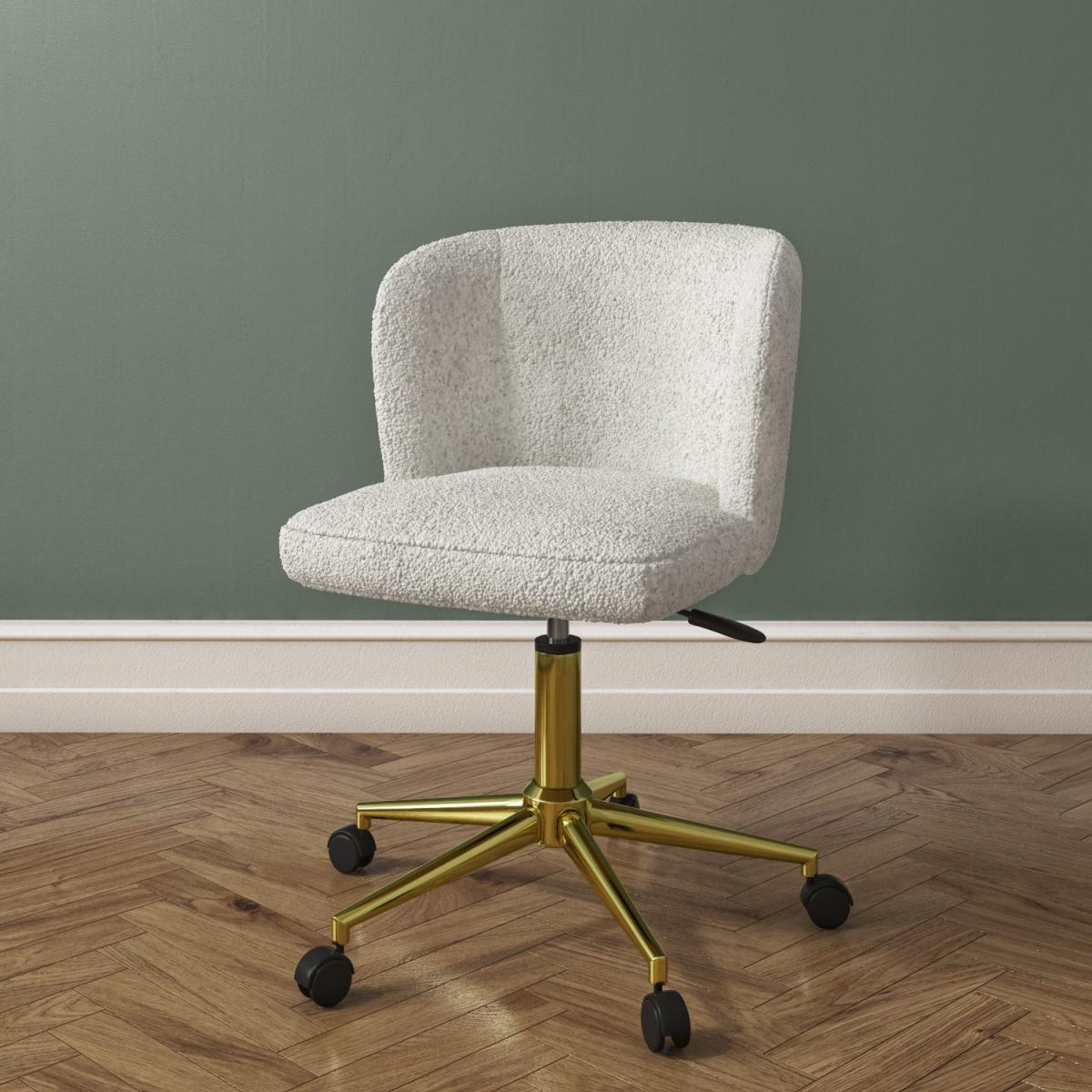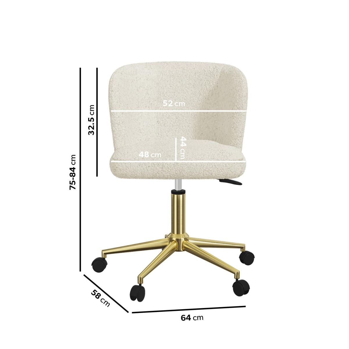 Features we love Contemporary office chair with modern gold base. Upholstered a cream faux sheepskin fabric Gas lift mechanism and 360-swivel function. Rounded back and sides offer support whilst you work. Also available in a grey faux sheepskin Work from home in style with this faux sheepskin office chair. Get the look of luxury with the practicality of a great office chair. Glide around your space on the easy roll castors whilst the curved backrest and soft upholstery supports you. This compact yet stylish chair will look great with any office interior but can also be used in any room in the house. Need to know. Dimensions. H75-84 x W58 x D64cm Weight. 7.2kg Max supported weight. 120kg Colour. Cream and gold Finish. Faux sheepskin Material. Faux sheepskin and steel Filling. Foam Assembly required. Yes- minimal..