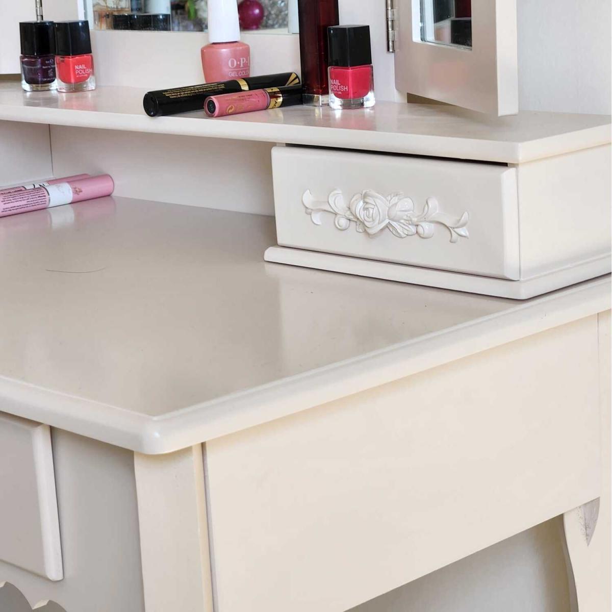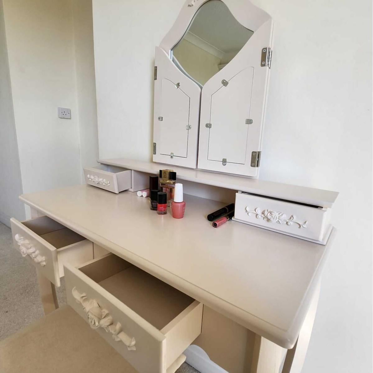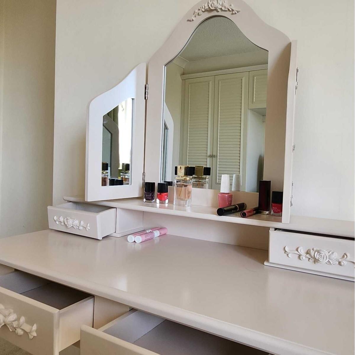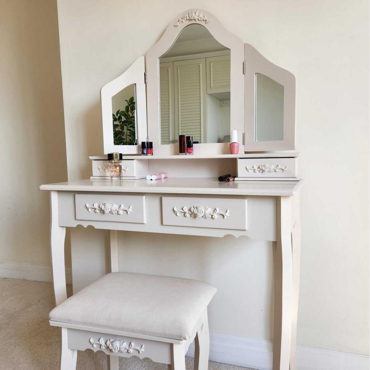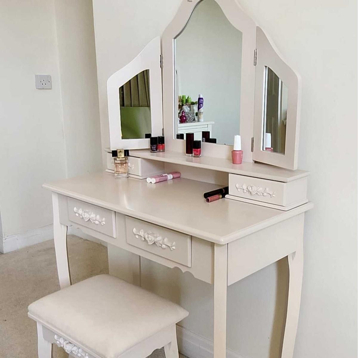Modern Cream Folding Three Mirror Dressing Table with Padded Stool 4 Drawers Carved Storage. Contains 4 drawers with carved poles and table that offers enough space to store all your items. In the drawers you can place some cross-shaped dividers to classify your jewelry, hair ornaments, nail polishes and cosmetics, etc. Premium quality dressing table, stool & mirror(folding mirror), Perfect gift for your loved one. When the mirror and the drawer above the table are not placed, it can be used as a table independently. Dimension:Table: W80cm x H128cm x D40 cm Approx, Stool :W38cm x D29cm x H39cm Approx. Flat packed, self-assembly required.