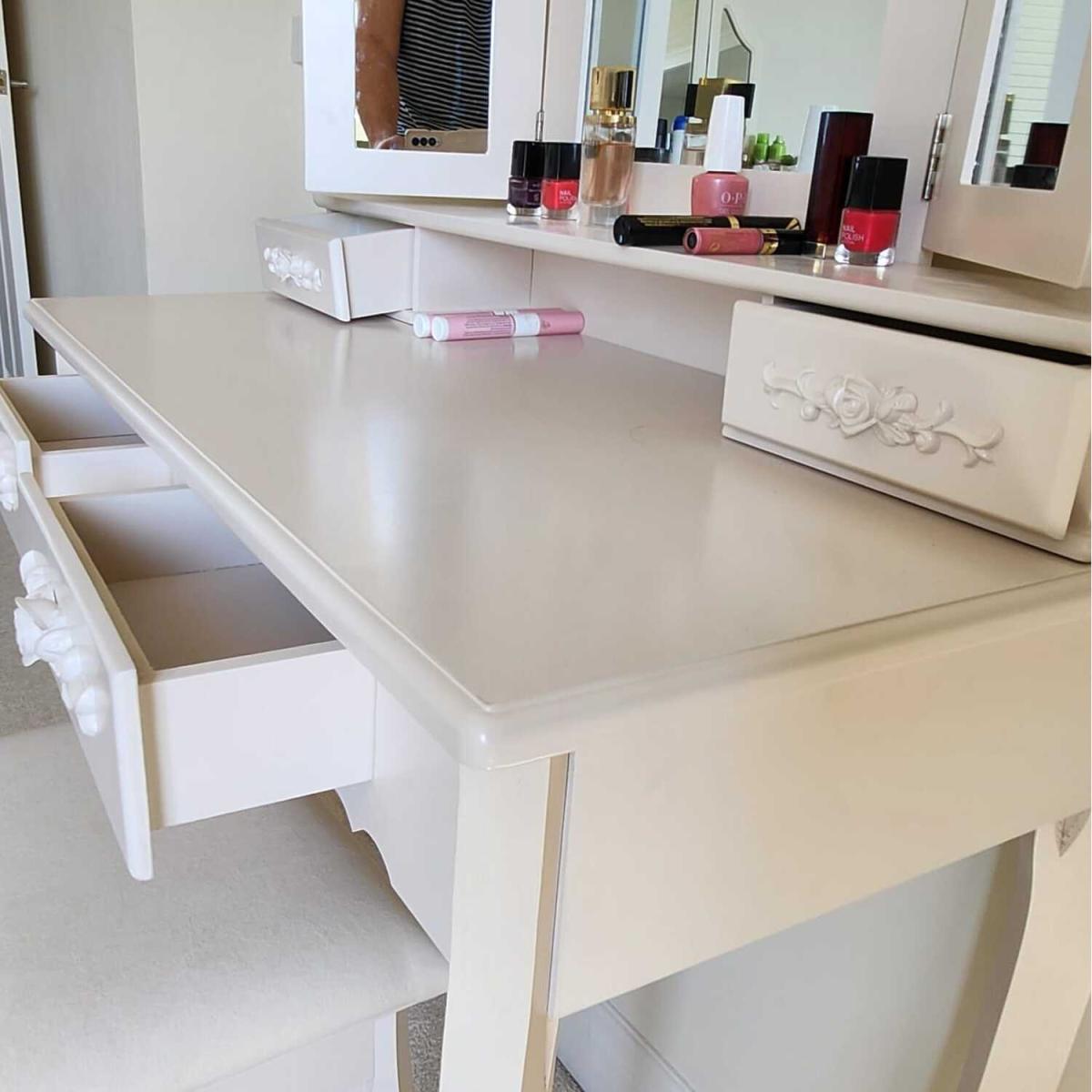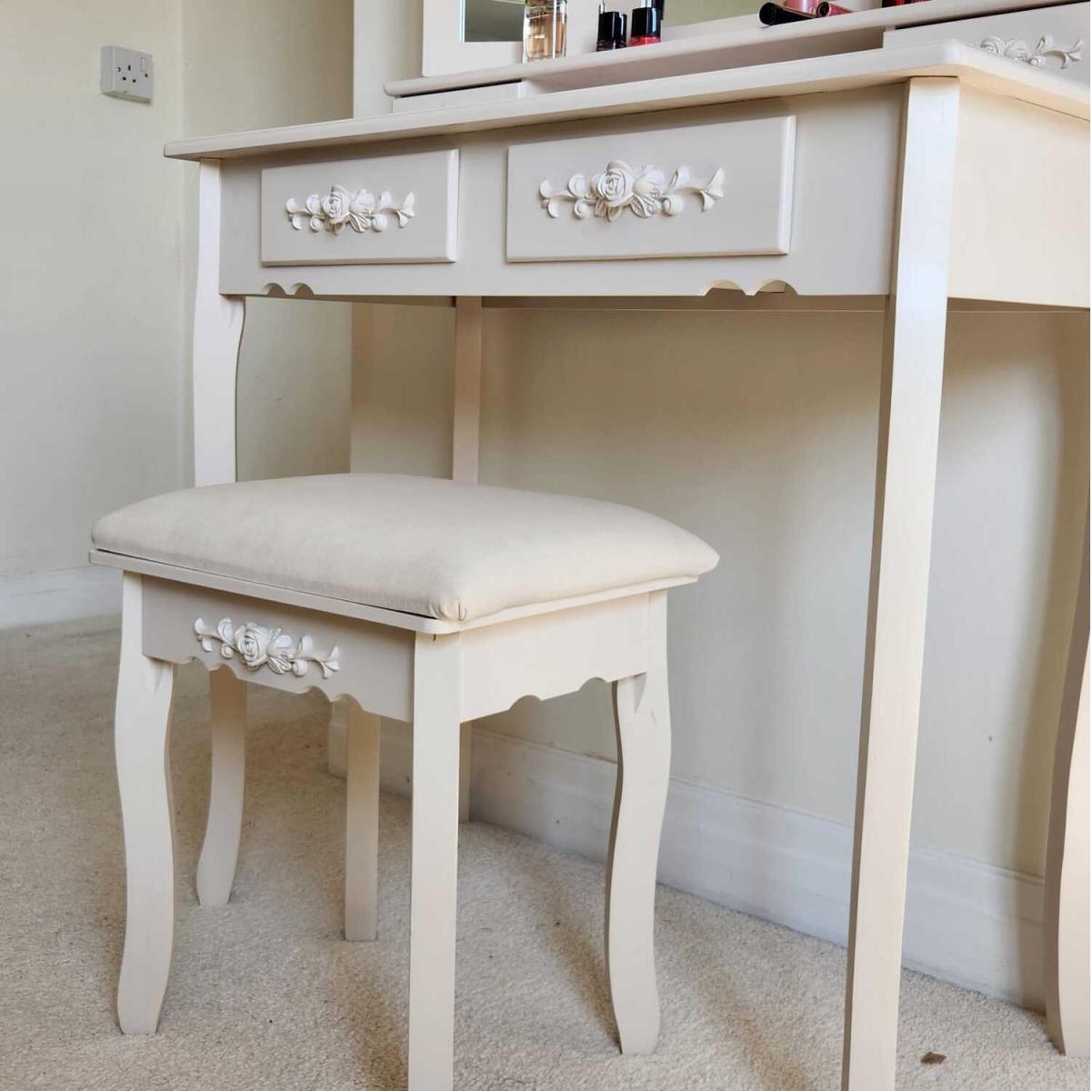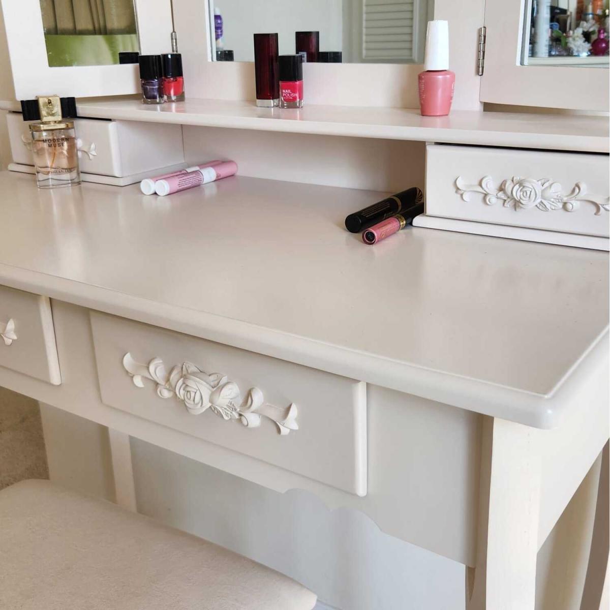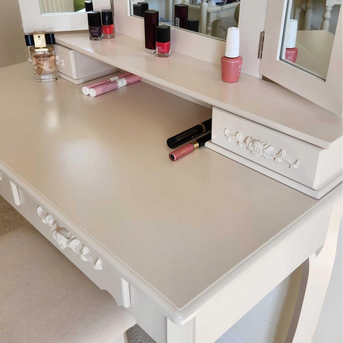Modern Cream Folding Three Mirror Dressing Table with Padded Stool 4 Drawers Carved Storage. Contains 4 drawers with carved poles and table that offers enough space to store all your items. In the drawers you can place some cross-shaped dividers to classify your jewelry, hair ornaments, nail polishes and cosmetics, etc. Premium quality dressing table, stool & mirror(folding mirror), Perfect gift for your loved one. When the mirror and the drawer above the table are not placed, it can be used as a table independently. Dimension:Table: W80cm x H128cm x D40 cm Approx, Stool :W38cm x D29cm x H39cm Approx. Flat packed, self-assembly required.