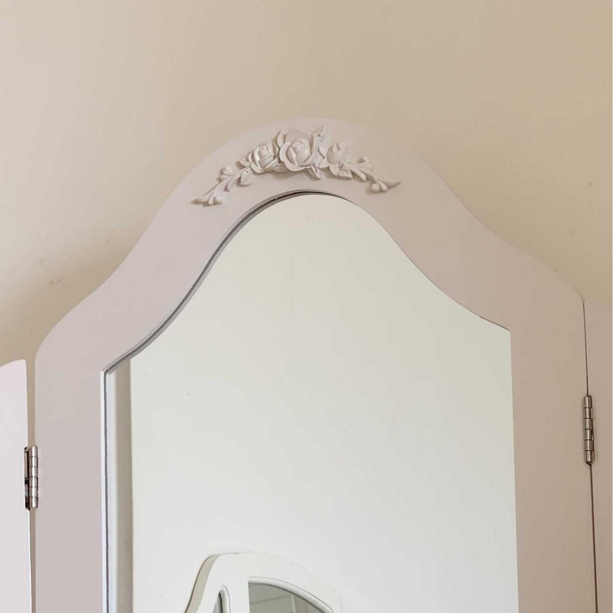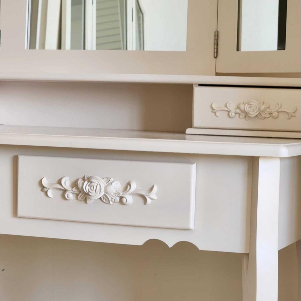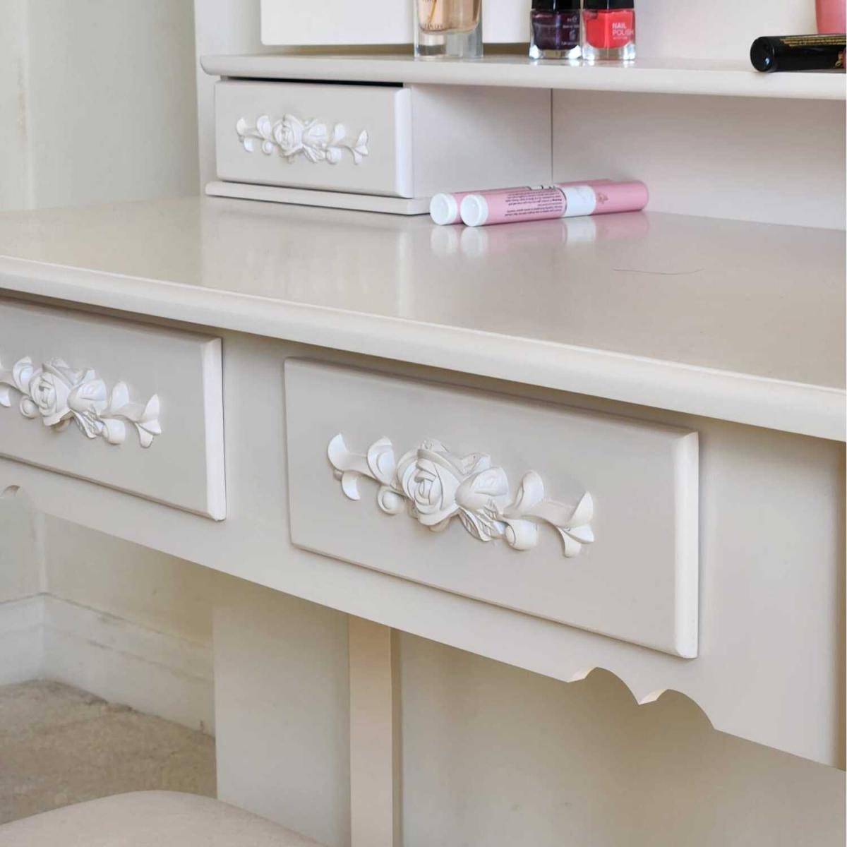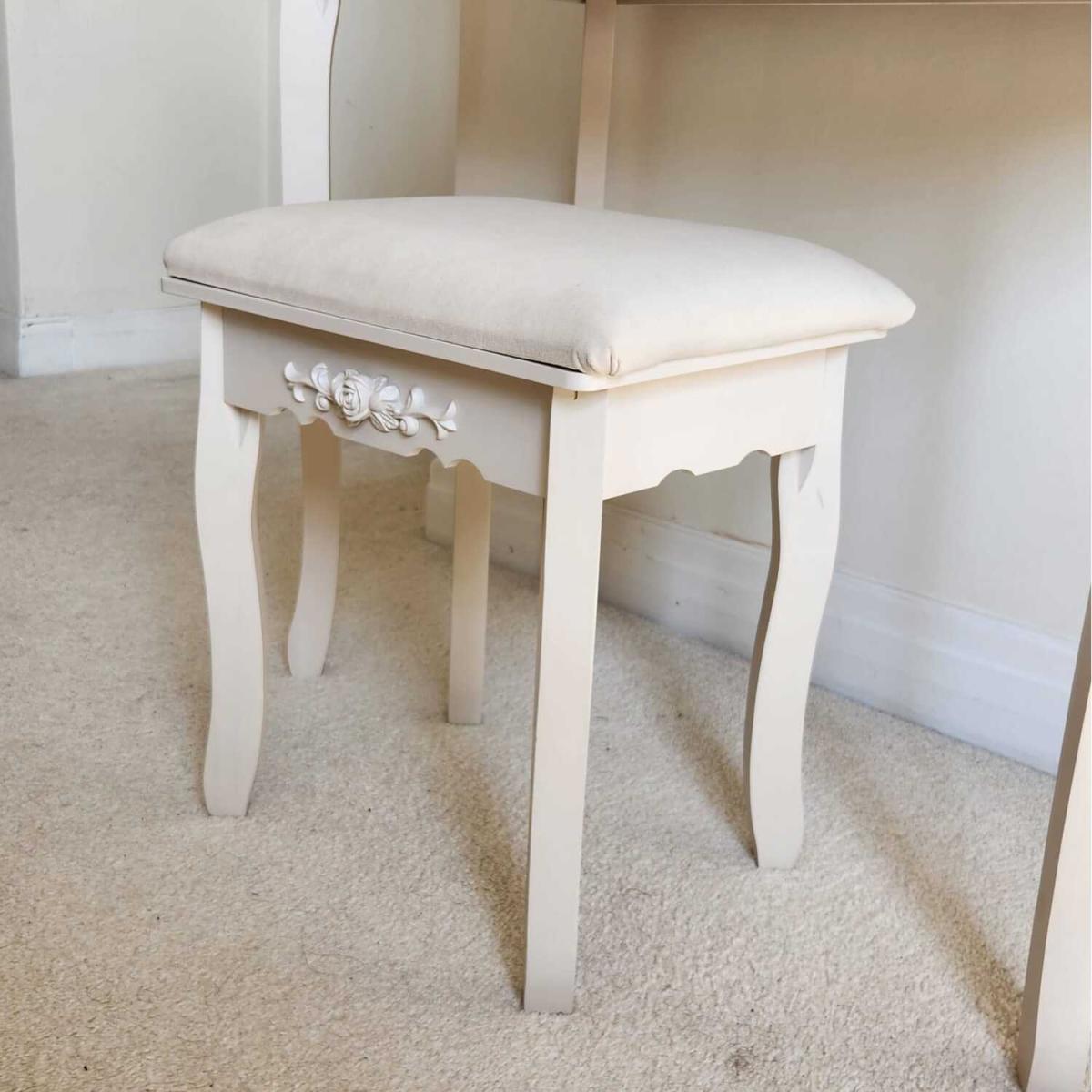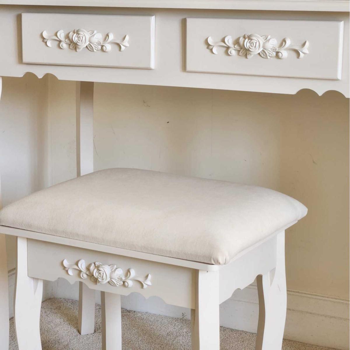 Modern Cream Folding Three Mirror Dressing Table with Padded Stool 4 Drawers Carved Storage. Contains 4 drawers with carved poles and table that offers enough space to store all your items. In the drawers you can place some cross-shaped dividers to classify your jewelry, hair ornaments, nail polishes and cosmetics, etc. Premium quality dressing table, stool & mirror(folding mirror), Perfect gift for your loved one. When the mirror and the drawer above the table are not placed, it can be used as a table independently. Dimension:Table: W80cm x H128cm x D40 cm Approx, Stool :W38cm x D29cm x H39cm Approx. Flat packed, self-assembly required.