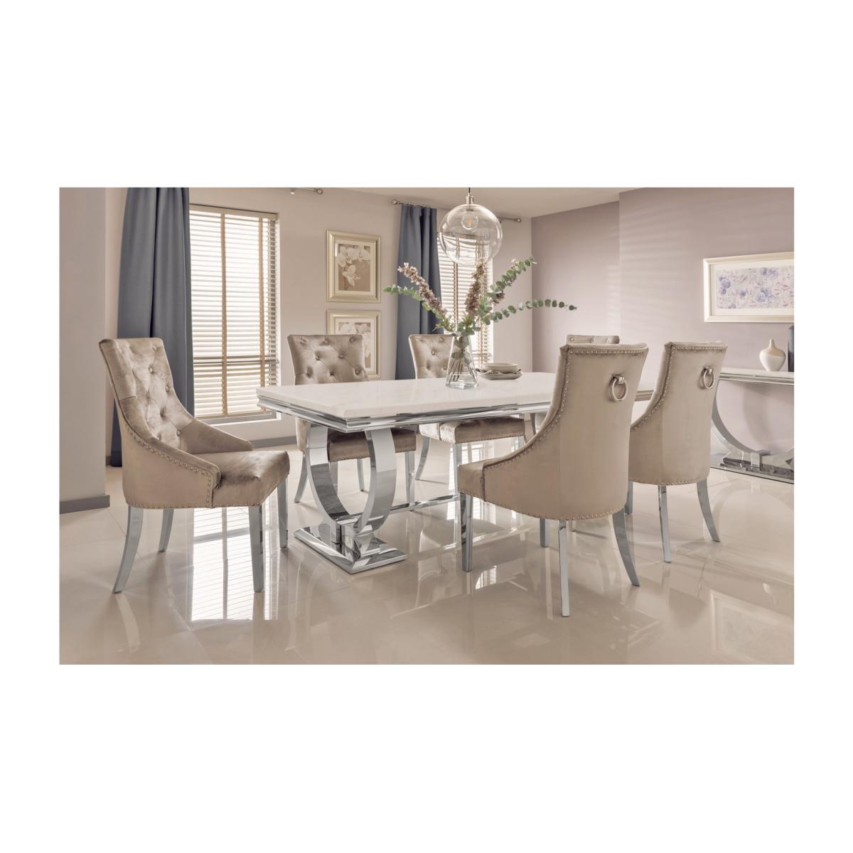 This bundle includes Arianna Cream Marble Rectangle Dining Table 200cm - Vida Living. 6 x Vida Living Belvedere champagne Knockerback Dining Chairs. Dimensions W200 x H77 x D100 cm Ultra chic and high end the Arianna is the ultimate collection for those who crave style and glamour. It's unique marble top is supported by a polished stainless steel base. Features. Interest Free Finance available on this dining table and; chair set. Comes with Dining table table and 6 Dining Chairs. Creates an instant focal point with its unique shape and modern good looks. Hardwearing cream marble top Stainless steel base. Comfortably seats 6 people. A stunning edition to any modern home Super easy to wipe clean great for such a practical piece Simple assembly required..