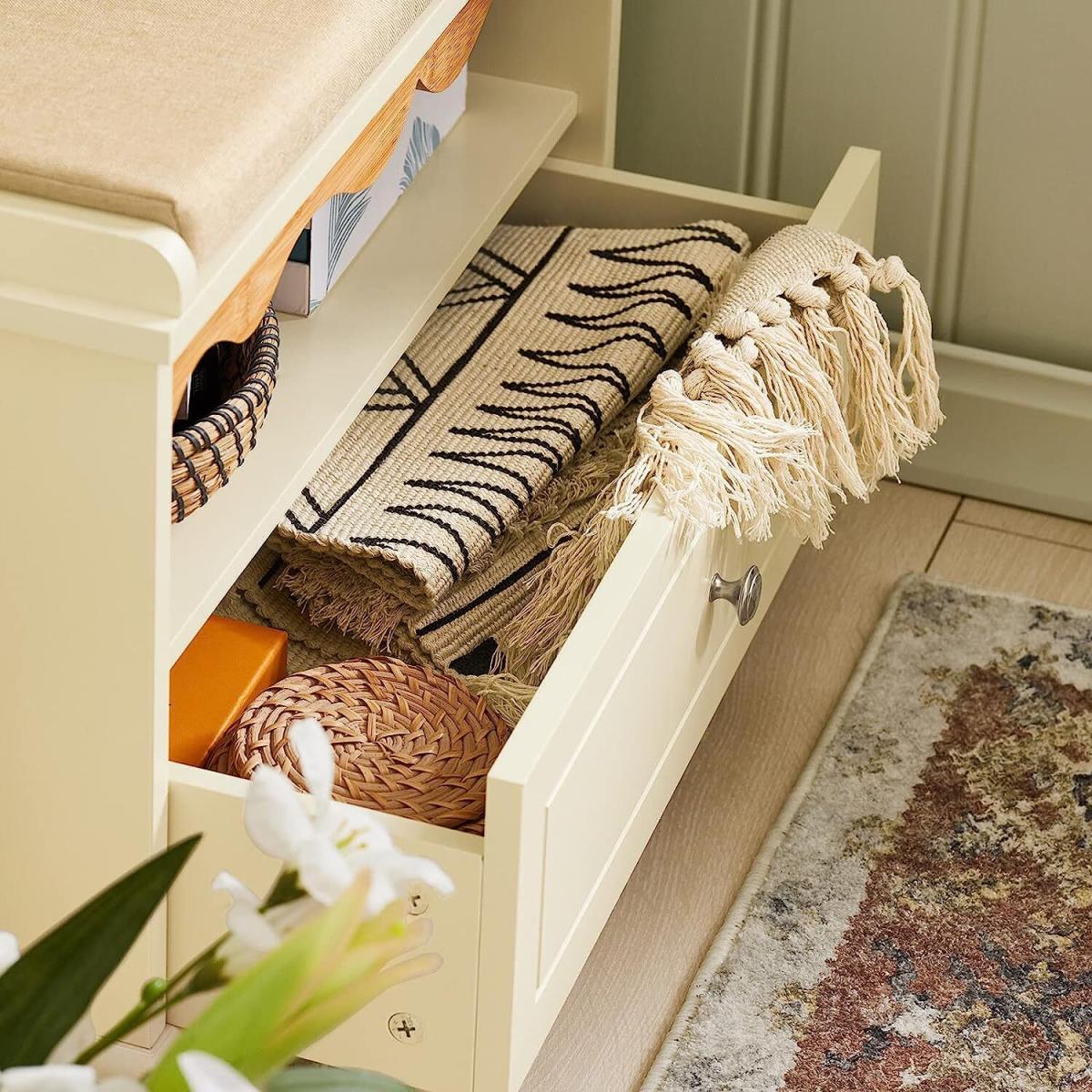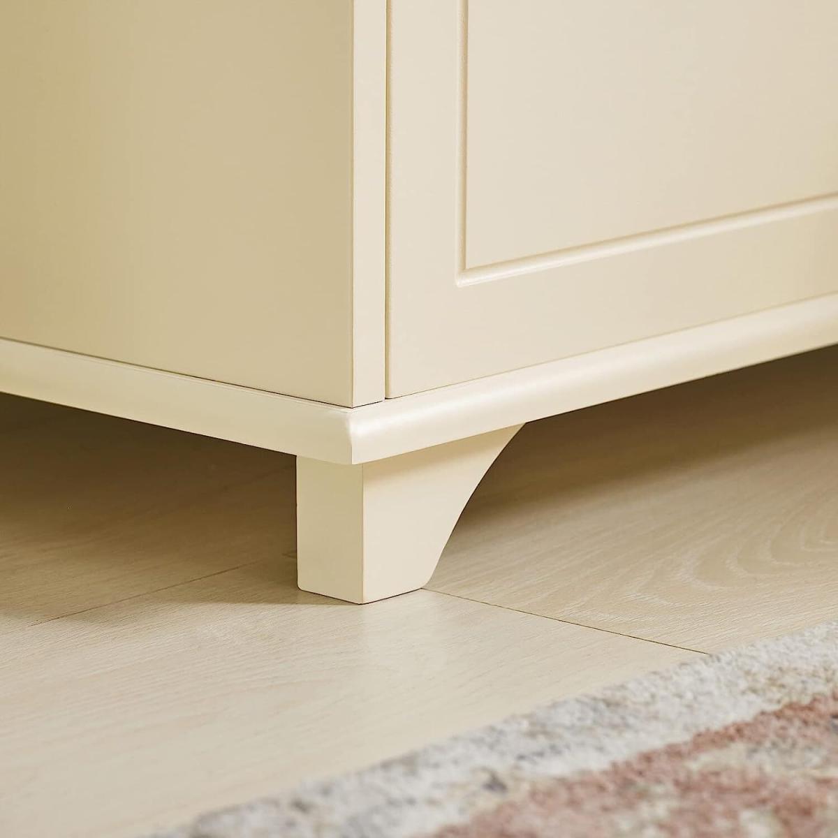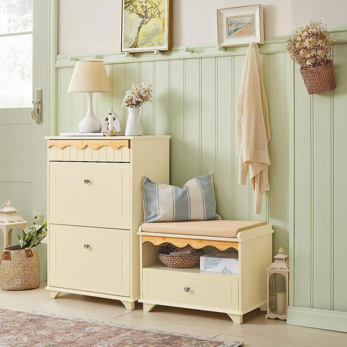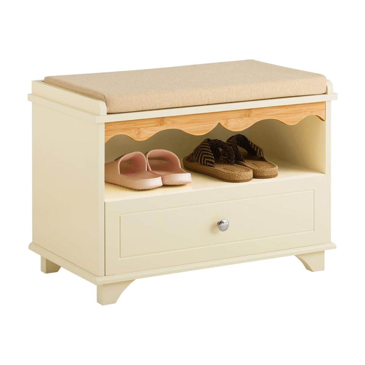 Modern design shoe cabinet storage bench is a good choice for hallway, living room, bedroom, etc. The padded seat which is removable is ideal for comfortable sitting while putting on and taking off shoes. A slide-out drawer with handle provides ample storage space for your personal items. The storage compartment above the drawer is ideal for the shoes. Made of high quality MDF in cream lacquer. The front panel on the open compartment and 4 feet are made of bamboo. Stable and good looking. Full of presence, the shoe cabinet in cream fills any room with warmth and comfort. This shoe cabinet will keep your halls and entryway neat and tidy.