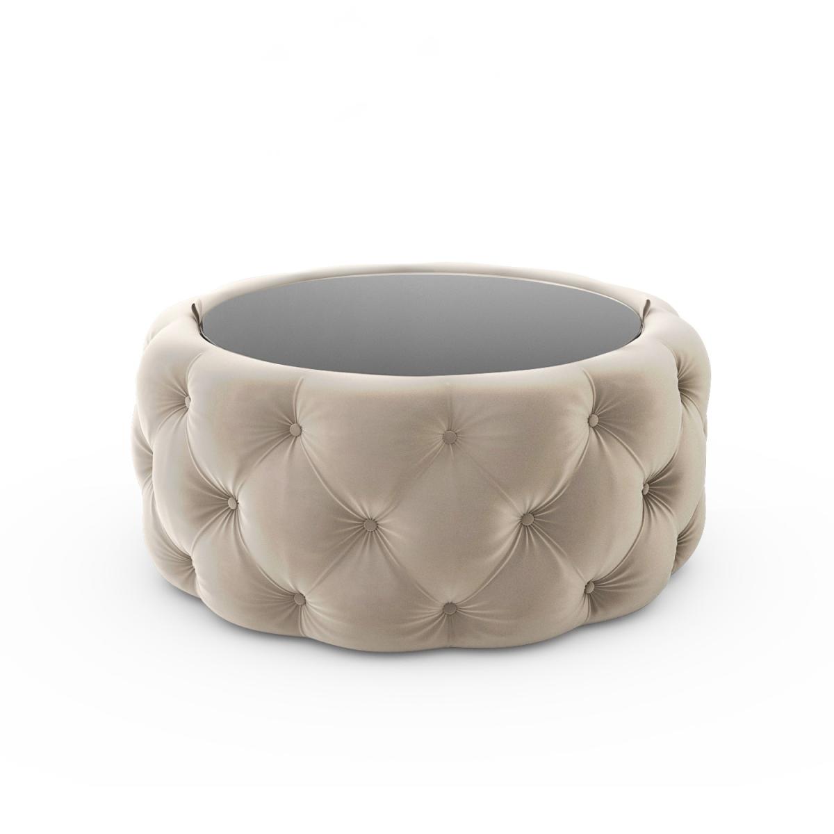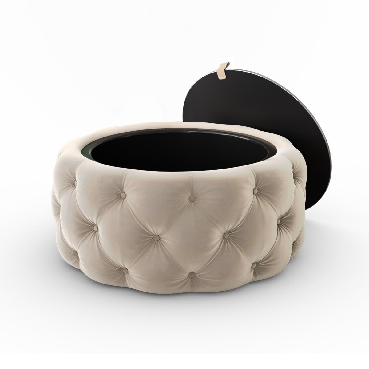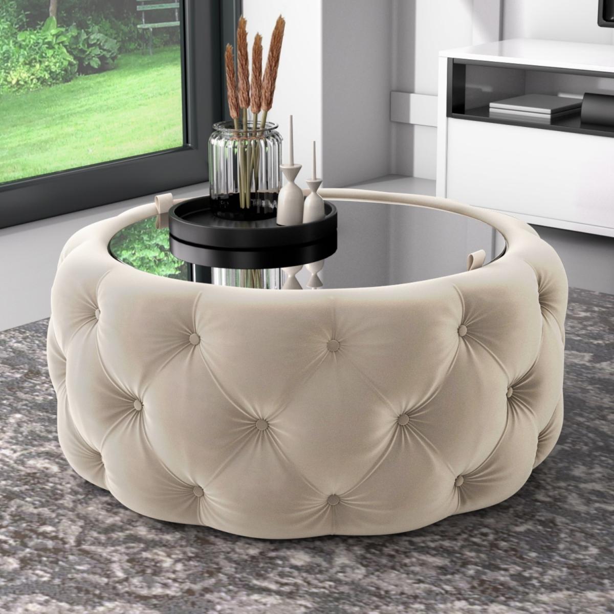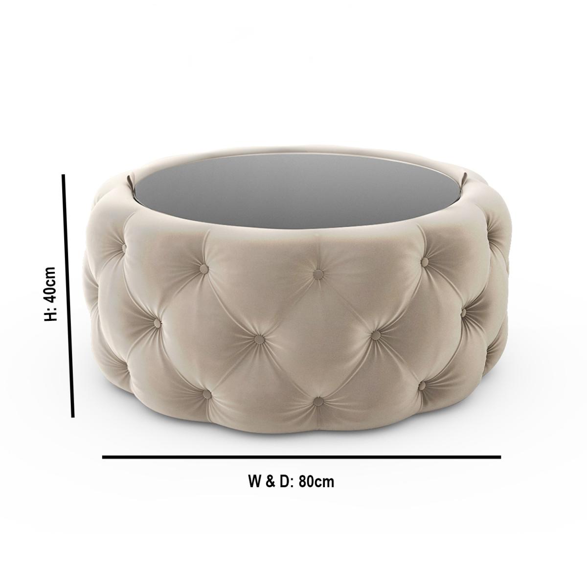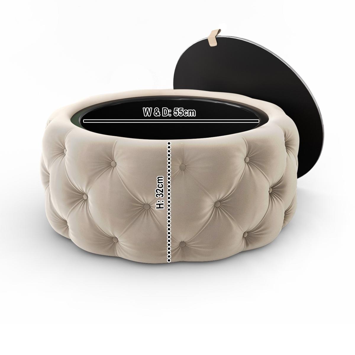 Features we love Beautifully upholstered in plush cream velvet Deep buttoned detailing adds a touch of luxury Mirrored glass top lifts to reveal ample storage space Perfect for storing all your living essentials. Feature piece suitable for any room in your home. Also available in other colours. Need to know. Dimensions. H40 x W80x D80 cm Interior dimensions. H32 x W55 x D55 cm Shape. Round Colour. Cream Finish. Velvet upholstery and tempered glass top Material. Eucalyptus and plywood frame and velvet polyester fabric Weight. 20kg Assembly required. No..