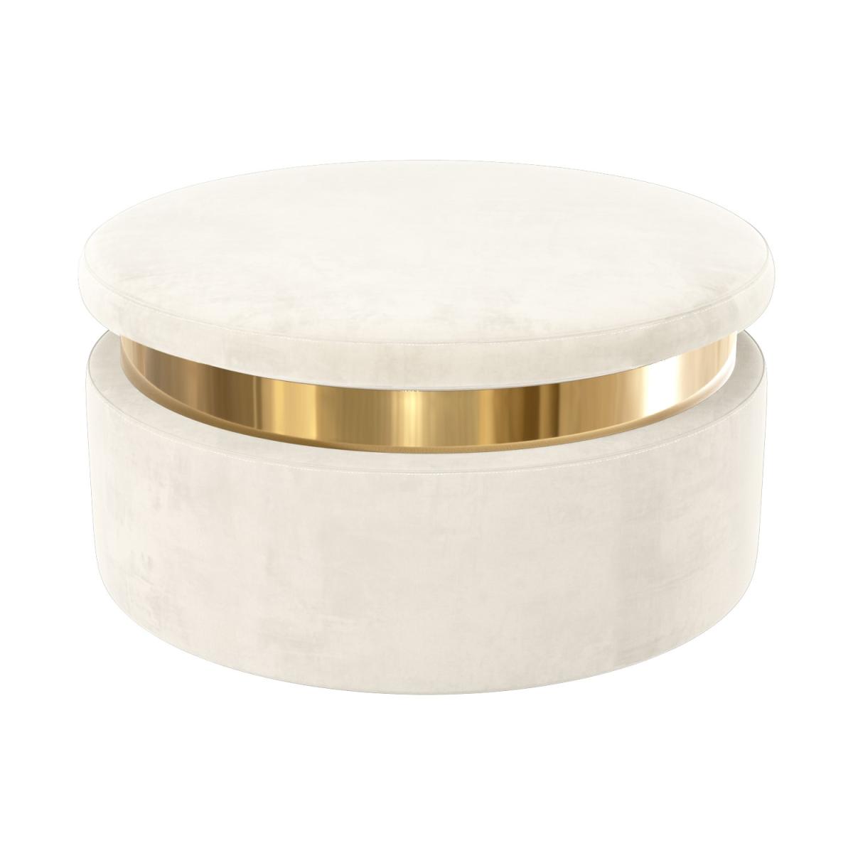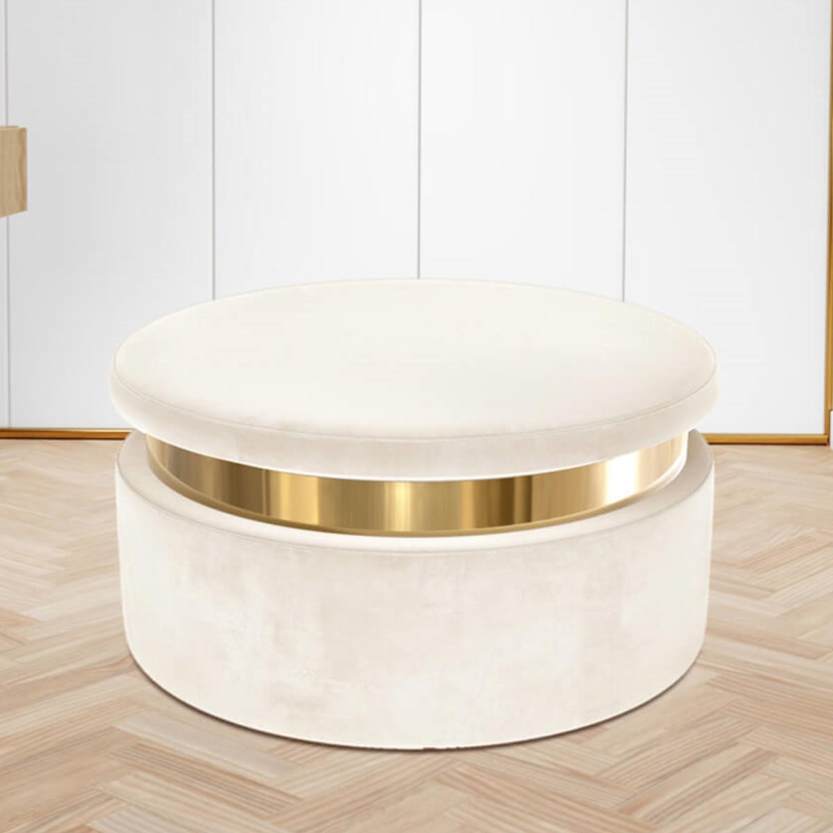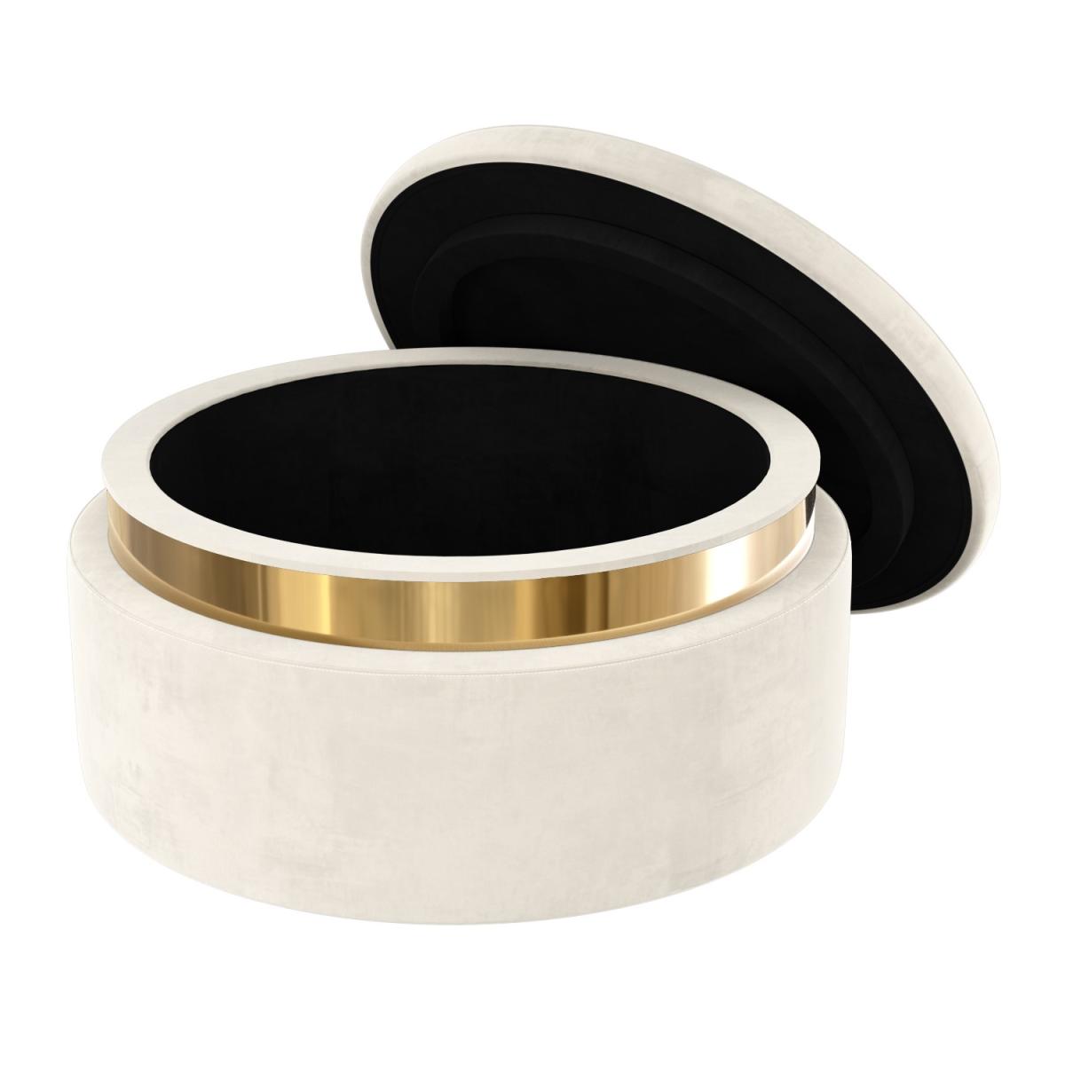 Features we love Round storage pouffe upholstered in soft cream velvet Internal compartment offers plenty of storage. Gold plinth adds art deco style to any room. Looks stylish as a footstool or stool. Also available in baby pink and grey All about me. Add a touch of style and elegance to your home with the Zendaya storage pouffe. Upholstered in soft-to-touch cream velvet not only does it offer ample discreet storage it also brings a stylish feel to any room. Use your storage pouffe as a footstool or stool in any living area or even as a feature in your dressing room. The gold plinth brings the piece together and conceals the fastening. Simply lift the lid to reveal the storage compartment. Need to know. Dimensions. H40 x W80 x D80cm Internal dimensions. 71.5cm Colour. Cream Finish. Upholstered Material. Fabric Assembly required. No.