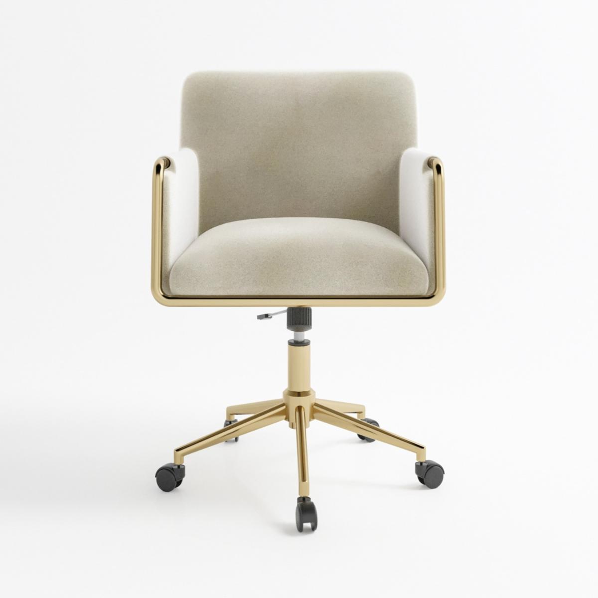 Built with comfort and convenience in mind, this sleek office chair would enhance any office or home study. It features five wheels with castors which give you a 360⁰ degree swivel and freedom whilst you work. Plus, you can set it to the perfect working height with the gas-lift mechanism. Upholstered in a soft-to-touch velvet and contrasting polished gold base, it's versatile enough to coordinate with existing furniture.