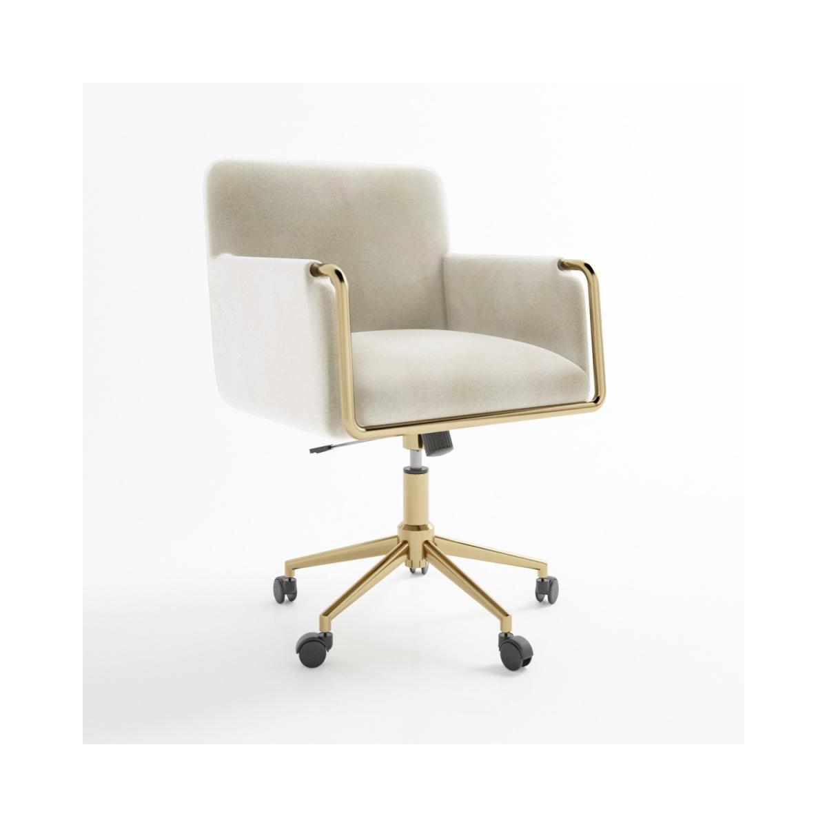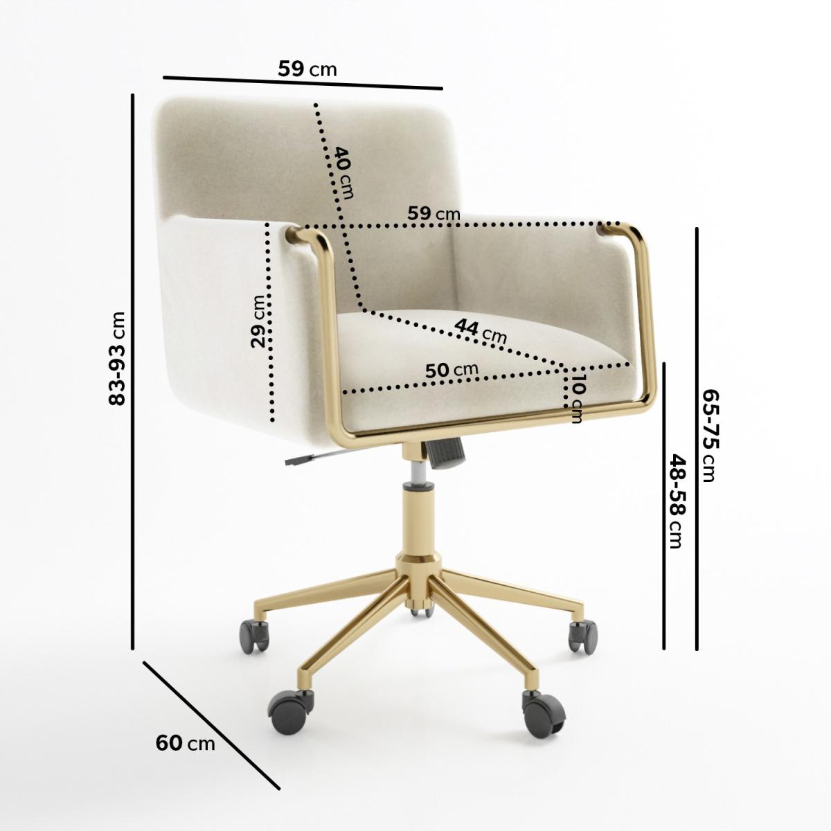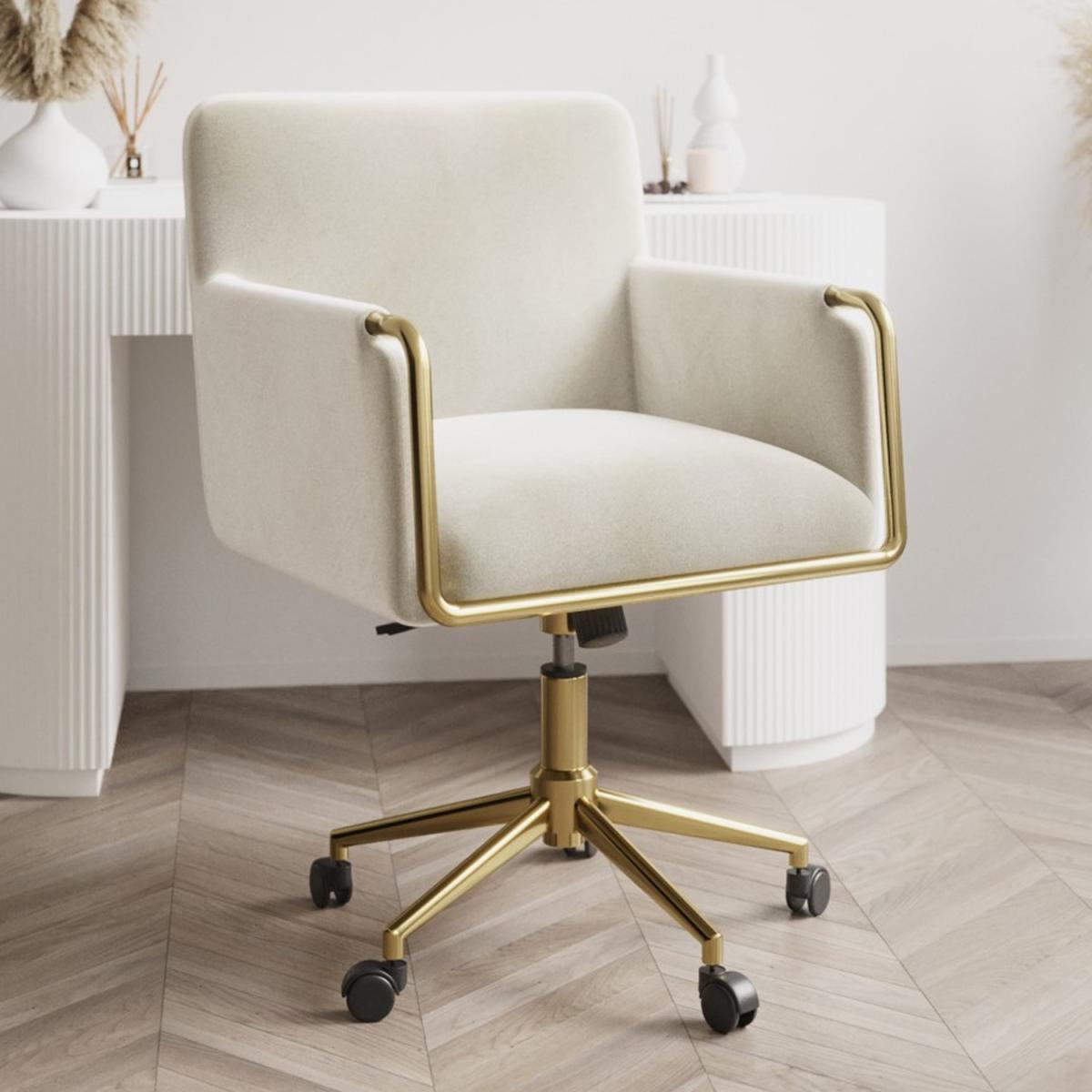 I really like this cream velvet office chair because it's versatile and adds a soft touch to any workspace. The plush velvet gives it a luxurious feel, making it suitable not just for traditional offices but also for contemporary or minimalist interiors that incorporate tactile textures. The gold accents elevate the look, lending a hint of glamour without being overbearing. For styling, I’d suggest pairing it with neutral-toned desks and adding complementary accessories like muted ceramics or natural fibres to create a balanced, inviting environment. It's a practical choice with a sophisticated twist-the perfect chair for creating a chic yet functional workspace.