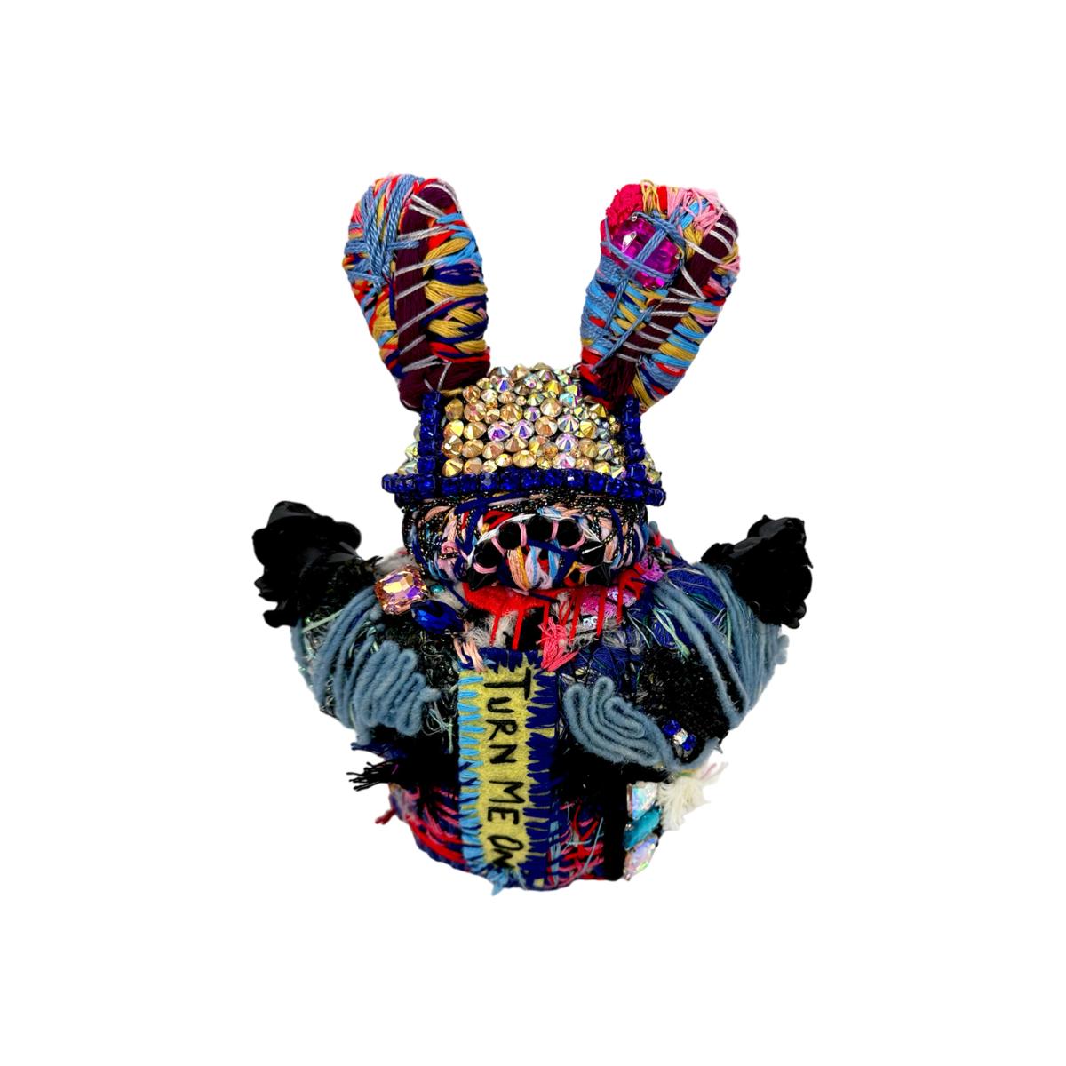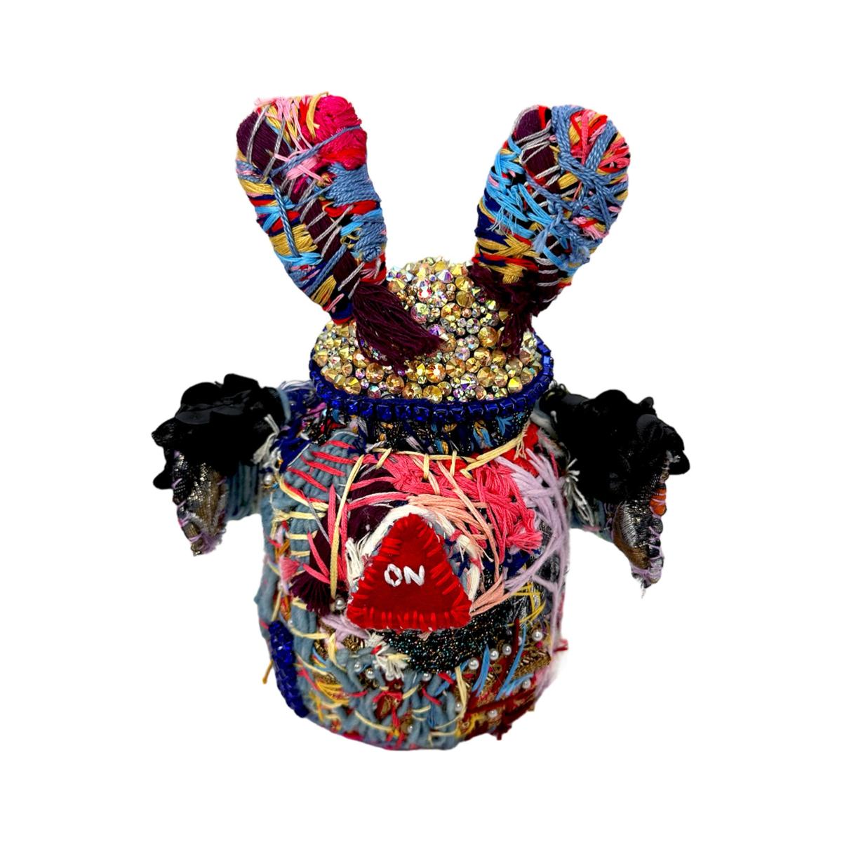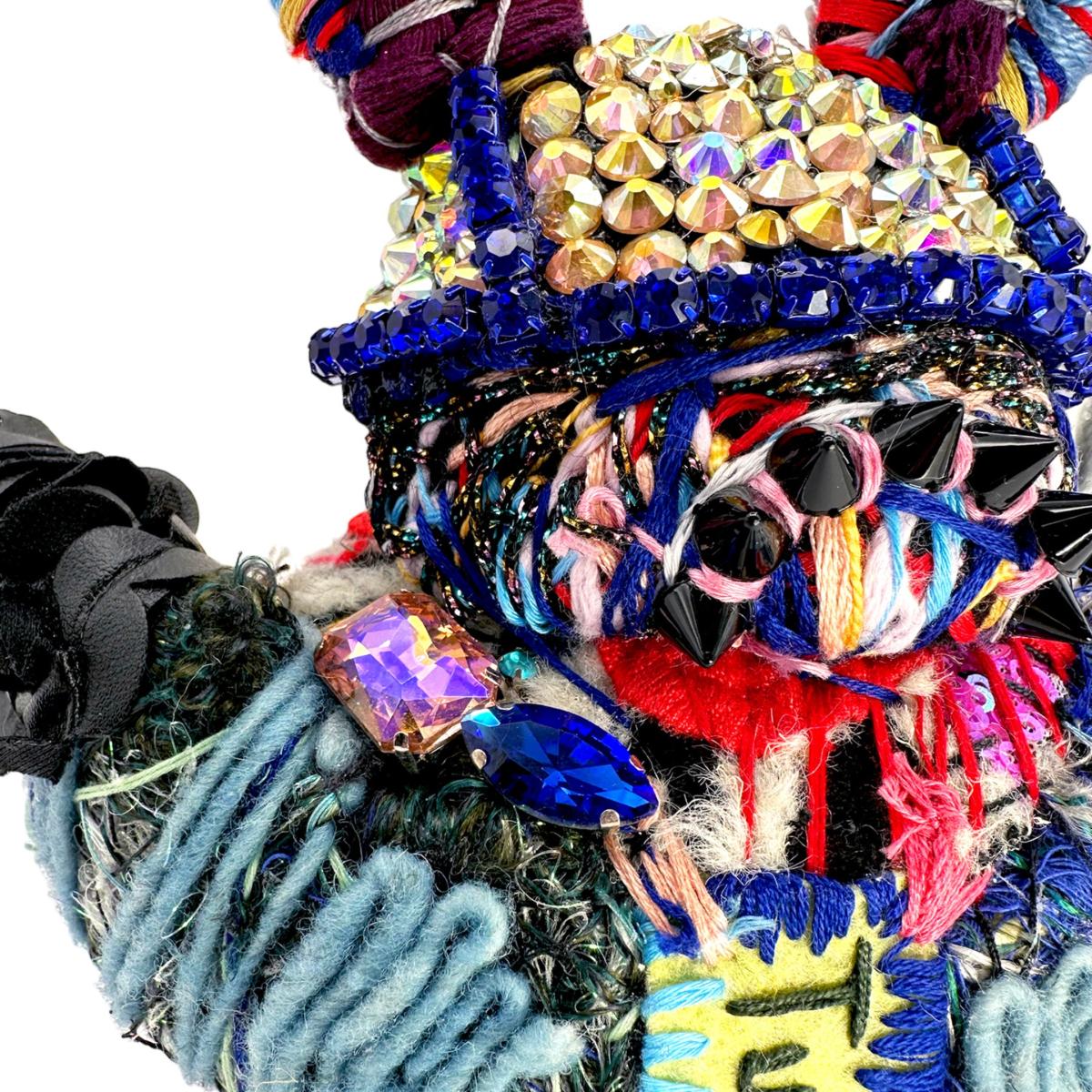 This unique soft-sculpture creature is a magical blend of hand-felted wool and repurposed materials, making it truly one-of-a-kind. Its body is crafted with layers and layers of colorful threads, giving it a textured and vibrant appearance. Turn Me On has a crystal helmet, wings and an "ON button" structured on the back which makes this creature other worldly. The addition of used sneaker parts and appliqued remnant fabrics adds an element of playfulness and imagination to this hand-stitched creation.