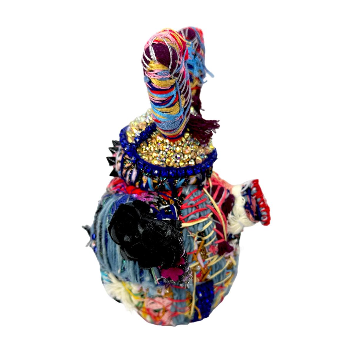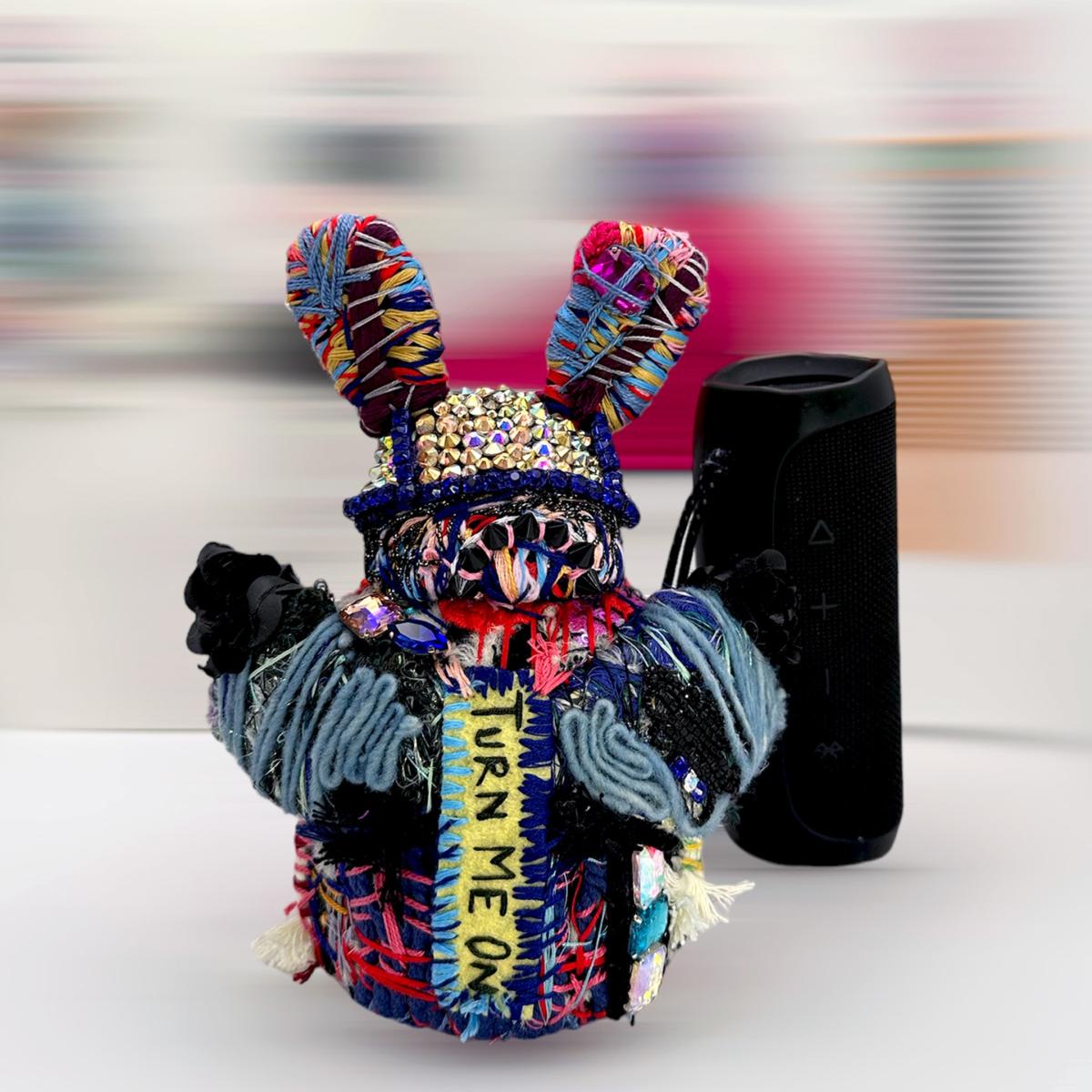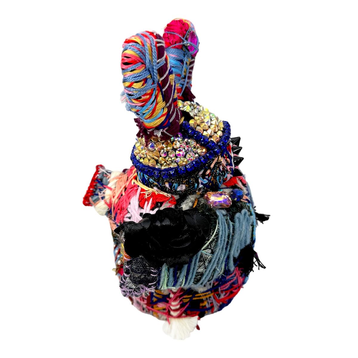 This unique soft-sculpture creature is a magical blend of hand-felted wool and repurposed materials, making it truly one-of-a-kind. Its body is crafted with layers and layers of colorful threads, giving it a textured and vibrant appearance. Turn Me On has a crystal helmet, wings and an "ON button" structured on the back which makes this creature other worldly. The addition of used sneaker parts and appliqued remnant fabrics adds an element of playfulness and imagination to this hand-stitched creation.