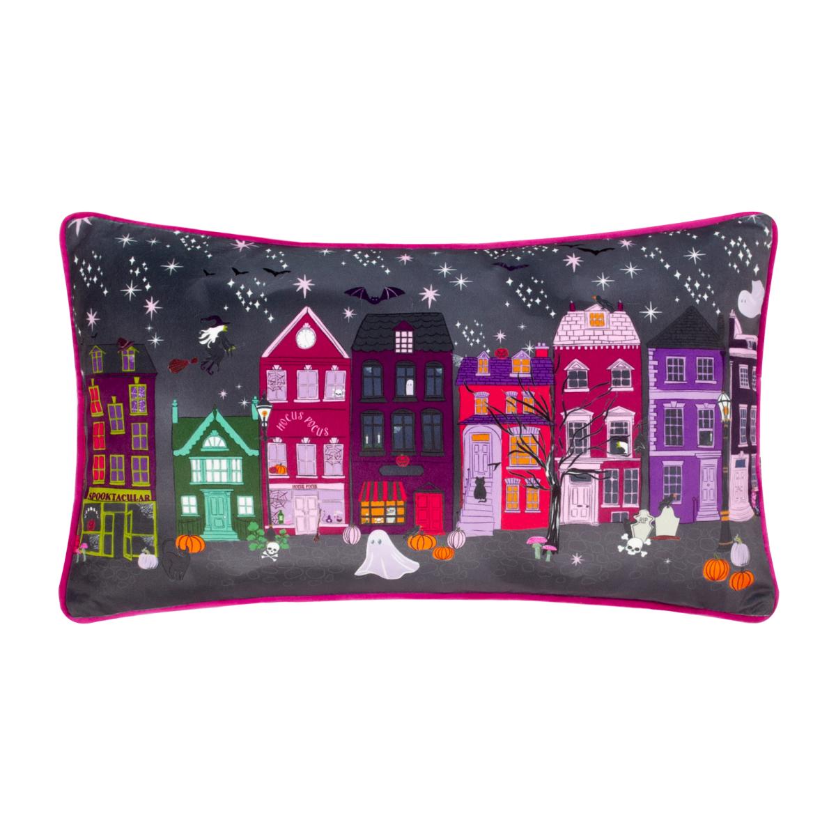Who says Halloween is just for October Do you dare to go along the dark street in Creepy Town Witches weave between the stars and bats in shops packed with strange curiosities and potions. Keep an eye out in the night sky for charming ghosts floating along the pavement. Watch out! There is a black cat ready to cross your path. The Creepy Town cushion is a truly unique addition to any home decor. Its printed velvet material gives off a hauntingly beautiful vibe, perfect for adding some spookiness to your living space. The piped trim adds a touch of elegance and completes the overall look of this eerie cushion. It's the perfect piece for anyone looking to add a bit of creepiness to their home.