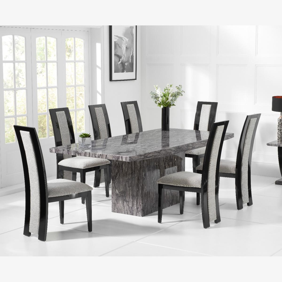 The Crema 180cm Grey Large Marble Dining Table with Novara Chairs set seats 6 diners. This marble dining set features a large grey marble table and solid wood dining chairs.
