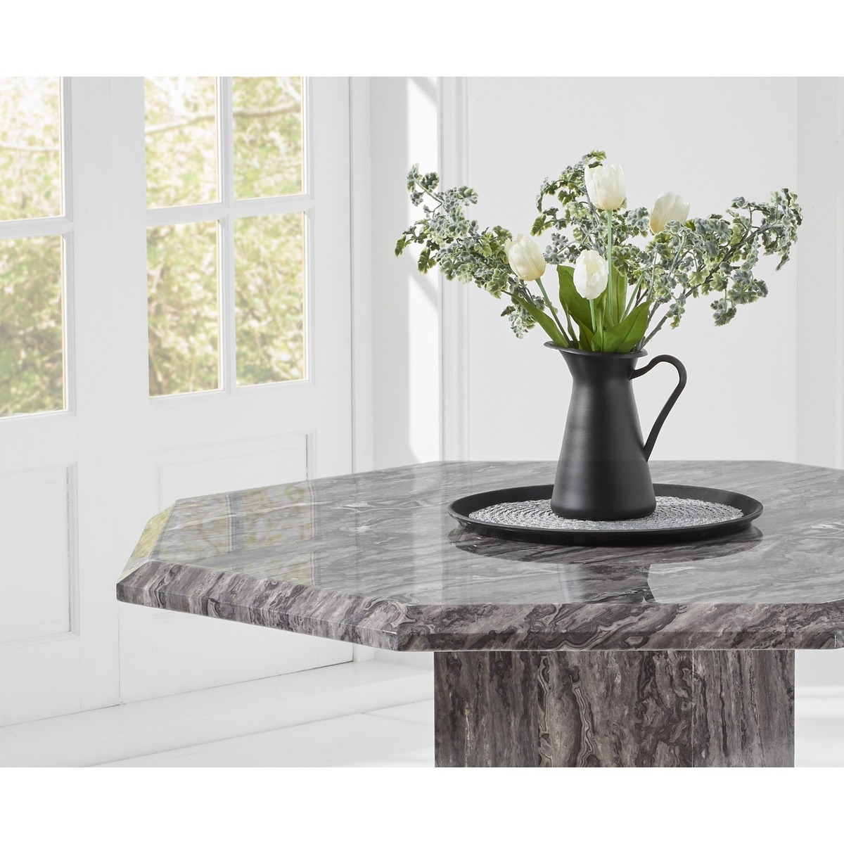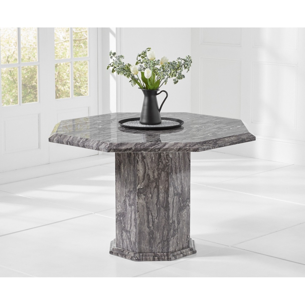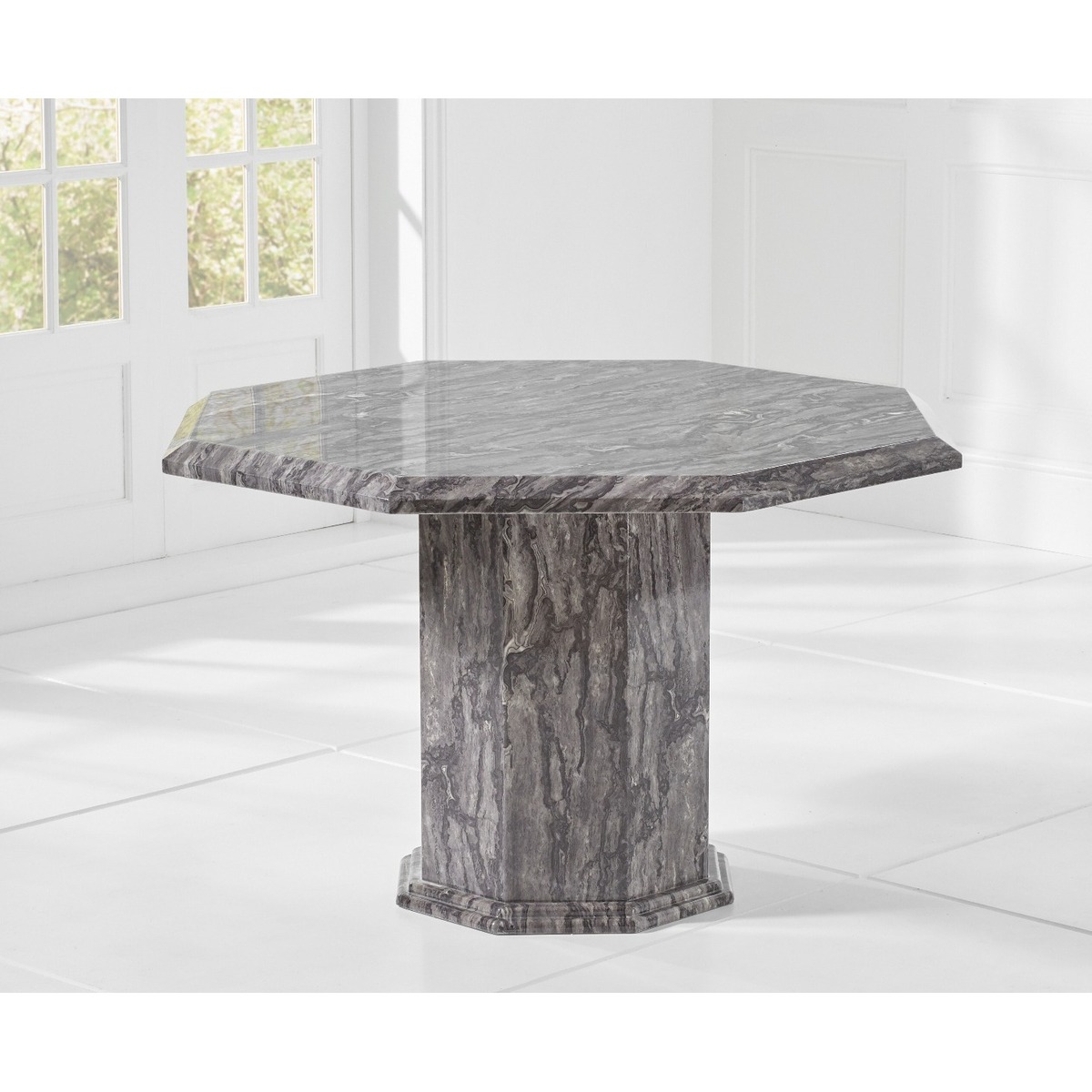 The Crema collection showcases elegant marble tables with rich, deep grey colouring on both the tabletops and the bases. Coming in various shapes and sizes, this range has something for everyone. The octangular base demonstrates robust lines, beautiful marbling, and immaculate shaping to perfectly complement the tabletop. The detailed texture and intricate patterns of this stunning grey marble are presented on this octaganol, mid-sized table's beautiful surface.