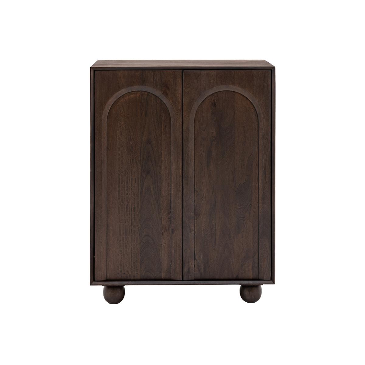 The Crescent 2 Door Cupboard features rich, dark wood tones with distinctive arch curves. Designed with your organisational needs in mind.