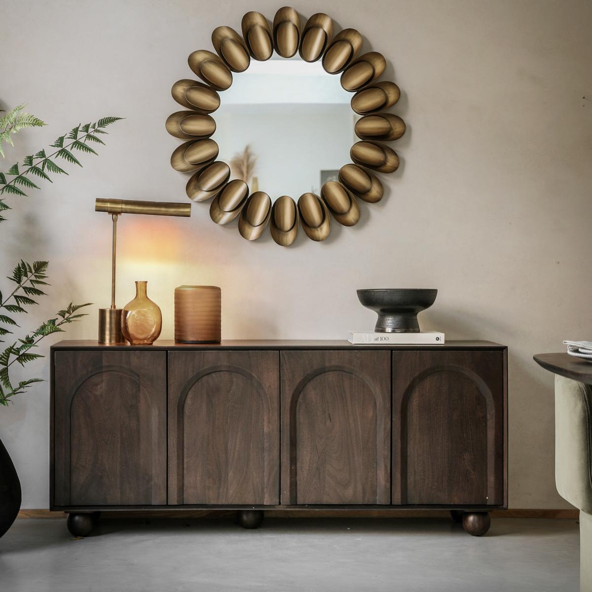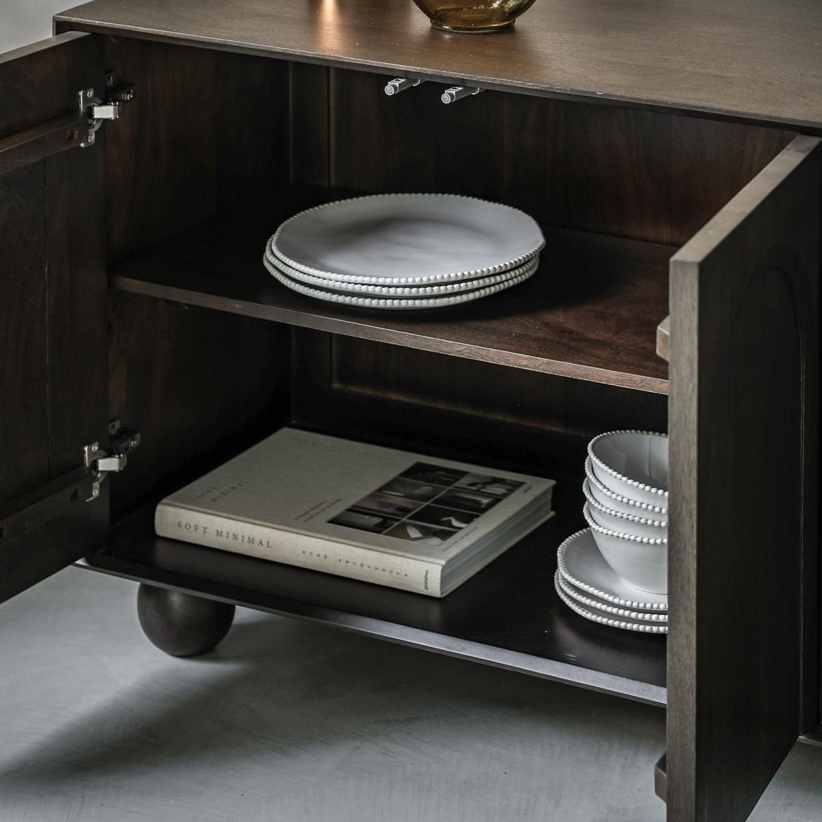 The Crescent 4 Door Sideboard features rich, dark wood tones featuring distinctive arch curves. Designed with your organisational needs in mind.