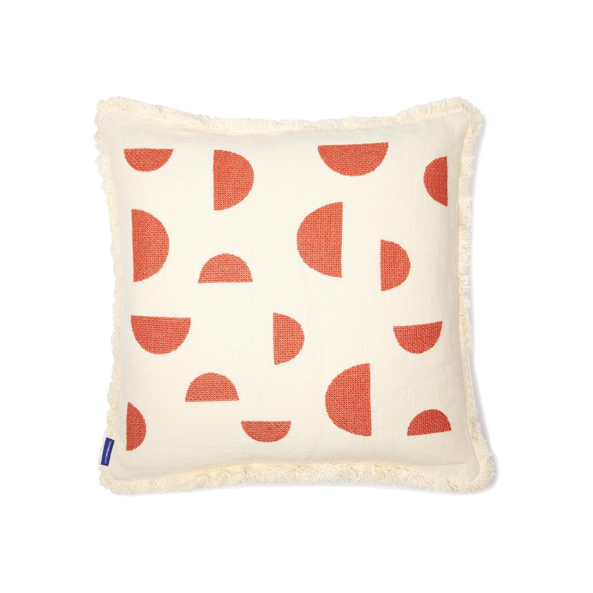 New for 2023, the white/orange Crescent Cross Stitch Cushion Cover is only available at The Conran Shop. A linen cushion with a contrast cross-stitched dotted abstract circle design, each is completed with a tonal fringed edge. Part of our SS23 edit, this cover epitomises our Jungle Metropolis theme, championing conscious artisanship for an intimate relationship with materials to reinforce the value of well-made products. Informed by nature without causing it harm, the theme's organic colours transcend the seasons, providing calm and ease at home.