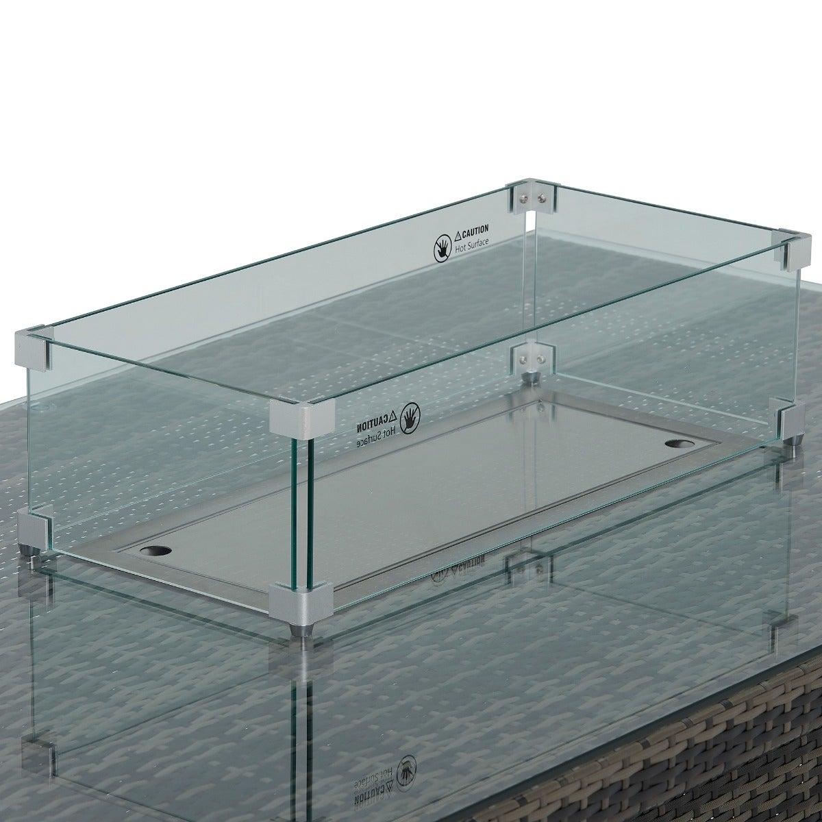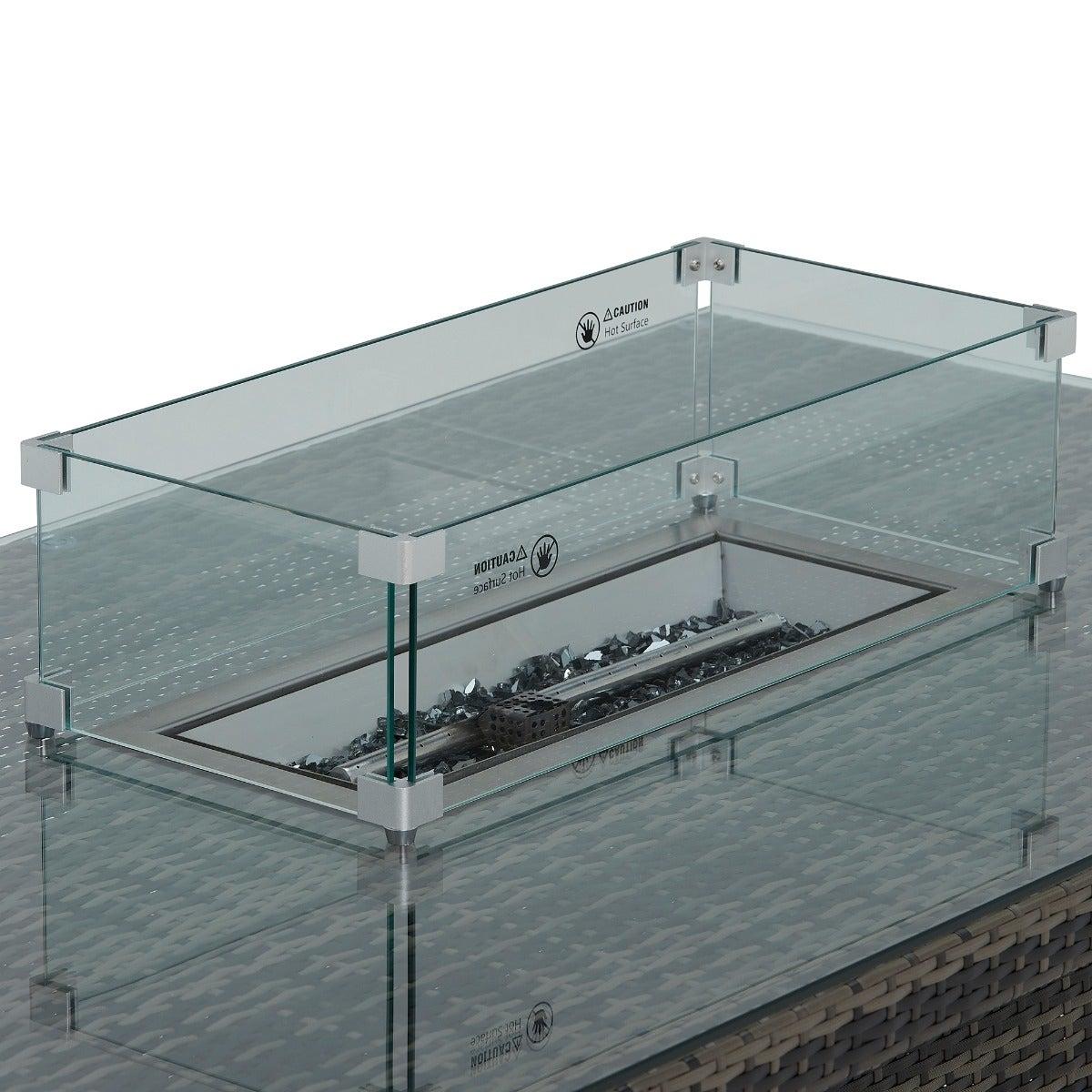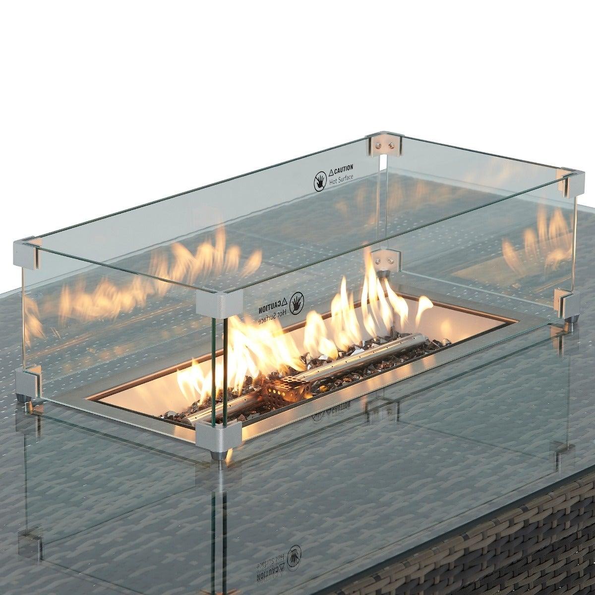 Design. Enjoy your outdoor space with friends and family to the total max on the beautiful Cresswell Corner Garden Dining Set with Brown Weave and Beige Fabric with Fire Pit. The corner sofa and three stools provide plenty of space to accommodate your guests while being super comfortable too, with deep-filled fibre and foam cushions. Boasting a sturdy, clean lined base, the table is complete with elegant rattan weave and a glass top for protection and security. The fire pit feature taking this stunning set to the next level of luxury, create a cosy atmosphere for when the night starts to draw in.