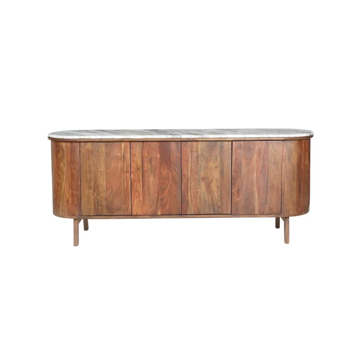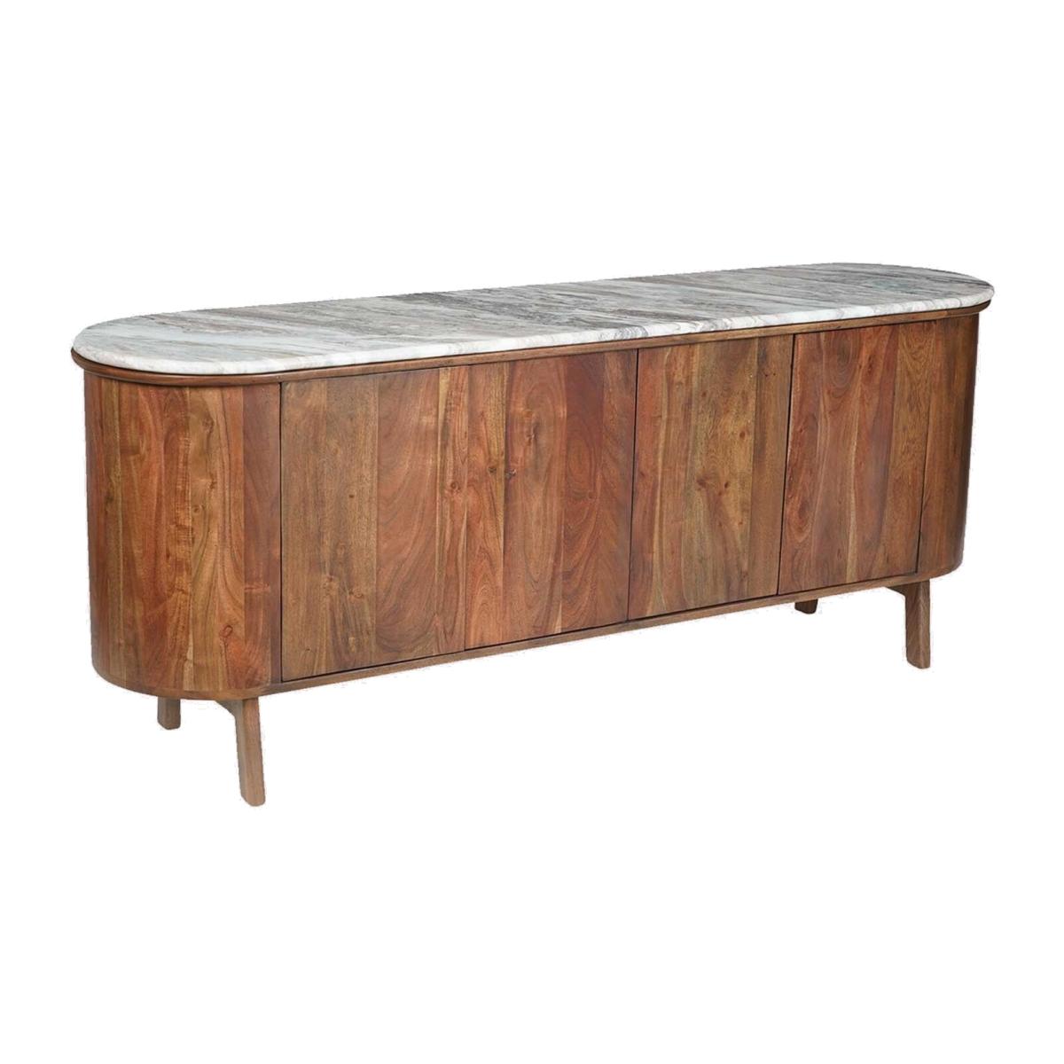 The Marble 4-Door Sideboard with an Acacia Wood Base is a stunning blend of elegance and functionality for your living room. Crafted from luxurious Sanwar marble and acacia wood, and finished with Viso Walnut, this sideboard exudes sophistication and timeless charm. With four spacious doors and an oval shape, it offers ample storage space while making a bold statement in your home decor. The rich brown hue and impeccable craftsmanship add warmth and character to any space. Elevate your living room with this smart and stylish storage solution