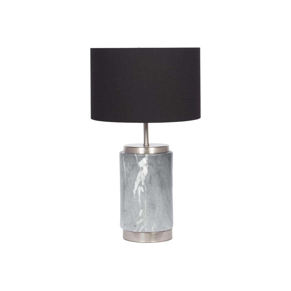 Add a touch of marble chic to your décor. The Crestola table lamp is the perfect combination of luxury and cool monochrome elegance.  Why you’ll love it  •    Luxe, monochrome table lamp.  •    Sophisticated contemporary style.  •    Bold, black drum shade. •    Ceramic base has a grey marbled finish. •    Brushed silver metal detailing.   What you need to know  •    Ceramic base. •    Silver coloured metal detailing.  •    Black faux cotton drum shade.  •    ES/E27 GLS 60W bulbDimensions •    Width: 28 cm (11 inches)  •    Depth: 28 cm (11 inches)  •    Height: 49 cm (19.3 inches)