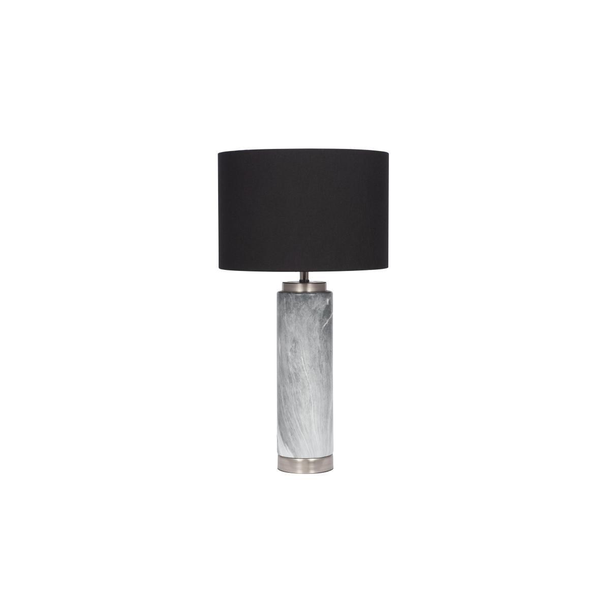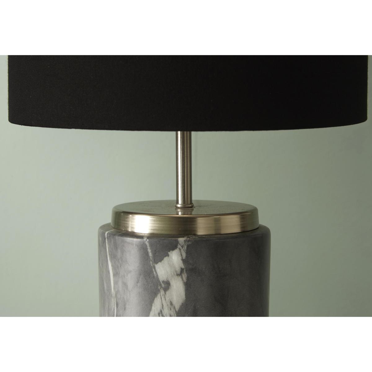 Monochrome, marbled contemporary style. This table lamp is grandly tall with a striking black drum shade. Why you’ll love it. Grandly tall, elegant table lamp. Sophisticated contemporary style. Bold, black drum shade. Ceramic base has a grey marbled finish. Brushed silver metal detailing. What you need to know. Ceramic base. Faux cotton drum shade. Silver coloured metal detailing. ES/E27 GLS 60W bulb. Dimensions. Width: 30 cm (11.8 inches). Depth: 30 cm (11.8 inches). Height: 55 cm (21.7 inches).