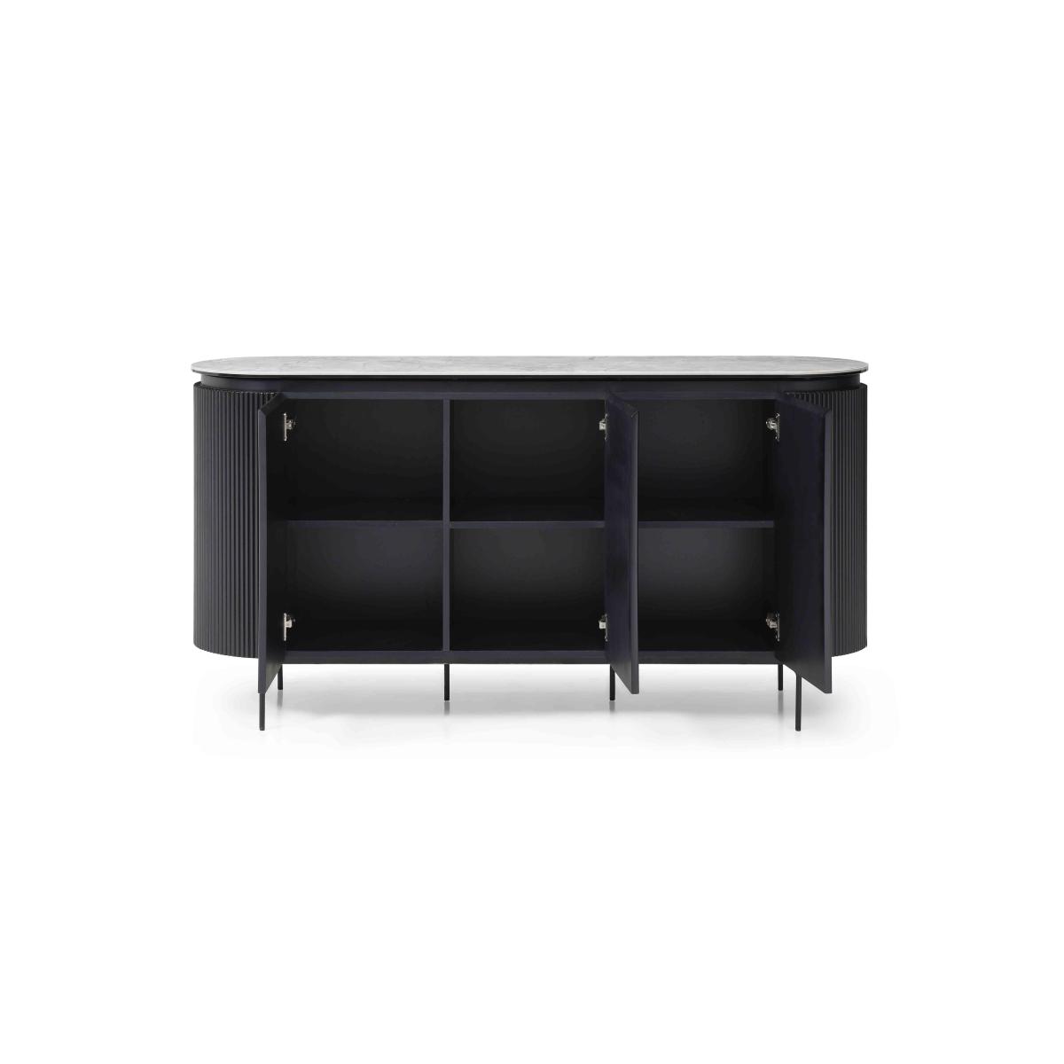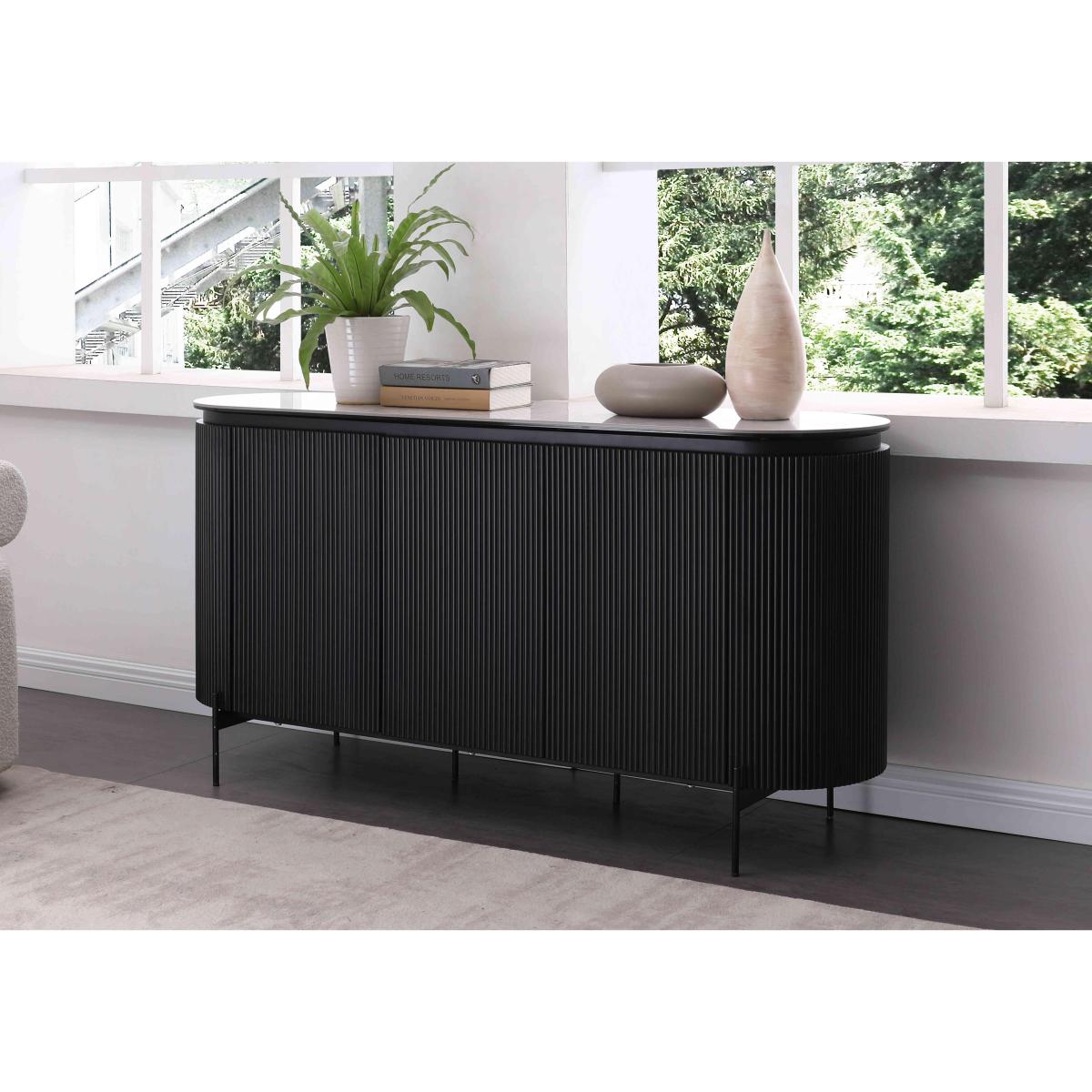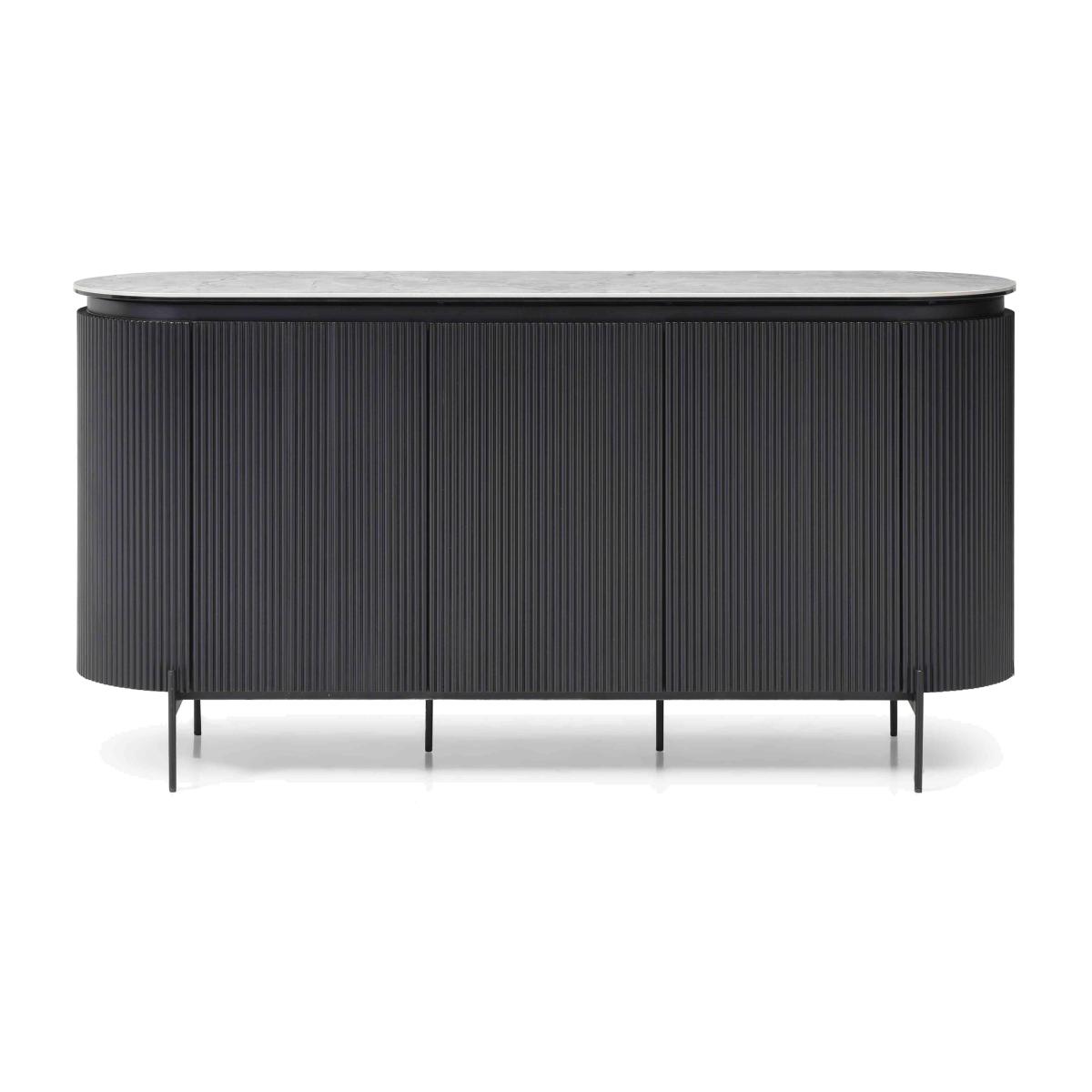 Ready to transform your dining room? Our Crete range makes it easy to give any space that high-end interiors magazine look thanks to its combination of materials and finishes – gorgeous high-gloss white ceramic, matt black powder-coated metal and luxurious velvet upholstery. This carefully curated range comprises a handmade ceramic-topped extending dining table that’s available in two sizes, velvet swivel dining chairs and sideboards. To make life even more effortlessly stylish, we’ve put together some ready-made dining sets featuring the collection’s dining tables and chairs. The Crete range is exclusively available at Furniture Village. Stylish, spacious and with a bold monochromatic look, this ceramic-topped sideboard is perfect for a modern and elegant dining room. Why you'll love it A bold modern aesthetic with a beautiful and hardwearing finish. This sideboard has a stunning high-gloss white ceramic top. Matt black frame with decorative fluting. Ceramic is heatproof and both scratch- and chip-resistant. Designed to be extra durable – the ceramic top is laminated to tempered glass. 2 cupboards with shelves offer spacious storage. Cupboard doors are soft-closing. Made by hand. A Furniture Village exclusive design. This 3-door sideboard is part of our Crete range. What you need to know 2 cupboards each with 1 adjustable shelf. 6 mm ceramic top laminated to 8 mm tempered glass. We recommend using coasters and placemats at all times. Easy to care for. Simply wipe with a clean damp cloth. Transform your dining room with beautiful furniture from our Crete collection. WARNING!