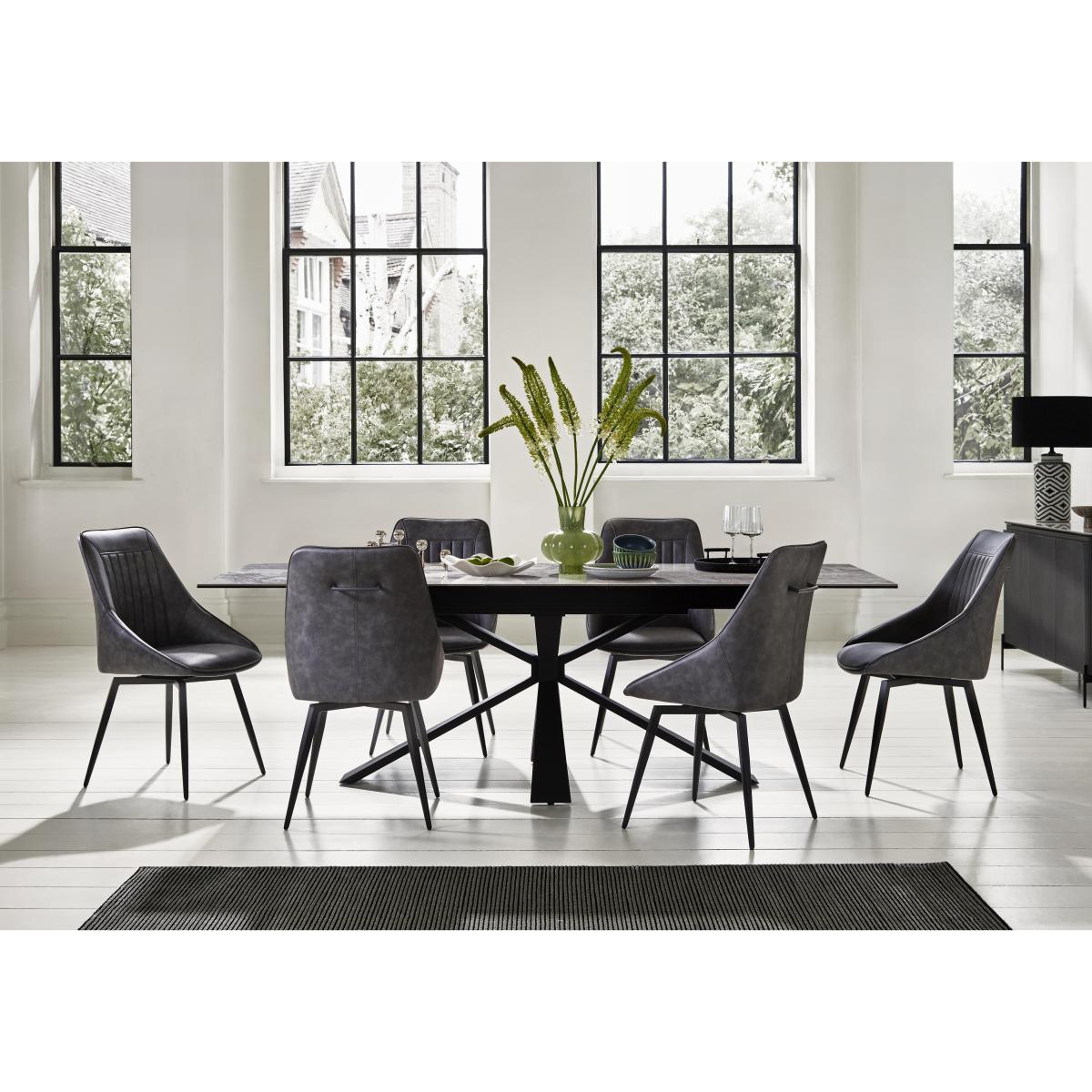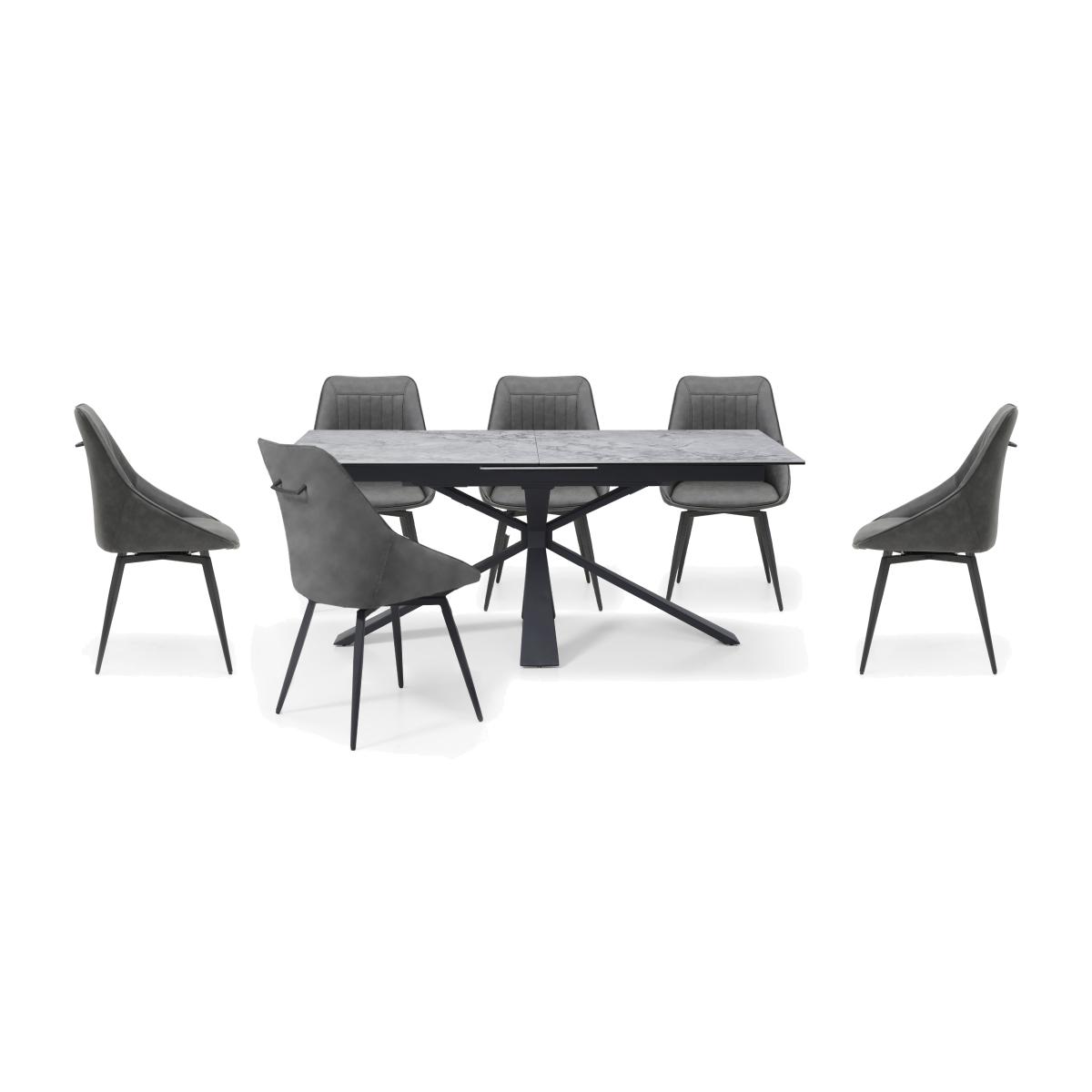 Ready to transform your dining room? Our Crete range makes it easy to give any space that high-end interiors magazine look thanks to its combination of materials and finishes – gorgeous high-gloss white ceramic, matt black powder-coated metal and luxurious velvet upholstery. This carefully curated range comprises a handmade ceramic-topped extending dining table that’s available in two sizes, velvet swivel dining chairs and sideboards. To make life even more effortlessly stylish, we’ve put together some ready-made dining sets featuring the collection’s dining tables and chairs. The Crete range is exclusively available at Furniture Village. Enjoy the most stylish dinner parties with this fabulous dining set, part of our Crete collection. The glossy ceramic dining table extends to seat ten and comes with six swivel dining chairs. Why you'll love it A bold modern aesthetic with a beautiful and hardwearing finish. Extending dining table has a stunning high-gloss white ceramic top. Statement base in black powder-coated metal. Ceramic is heatproof and both scratch- and chip-resistant. Designed to be extra durable – the ceramic top is laminated to tempered glass. Pop-up mechanism with extra leaf makes this table so easy to extend. Exceptional quality – the top has flawless continuous ceramic patterning when closed. Set includes 6 swivel dining chairs with slender matt black metal legs. Shaped for comfort and embellished with fluting. Soft and luxurious faux leather upholstery in dark grey. Made by hand. A Furniture Village exclusive design. This dining set is part of our Crete range. What you need to know Dining chairs have metal frames and legs and are cushioned with foam. Dining table seats 8 closed and 10 when extended. 6 mm ceramic laminated to 8 mm tempered glass. This dining table is very heavy. Please take care when moving it. We recommend using coasters and placemats at all times. Easy to care for. Simply wipe with a clean damp cloth. Transform your dining room with beautiful furniture from our Crete collection. Item code: CRETDSET18-001