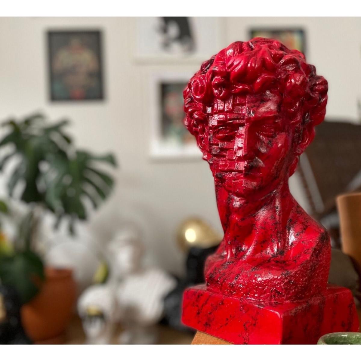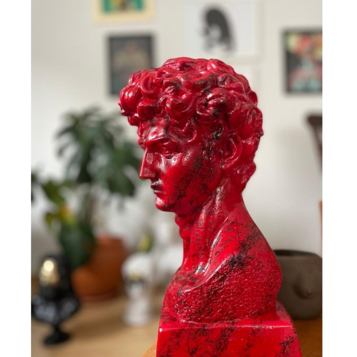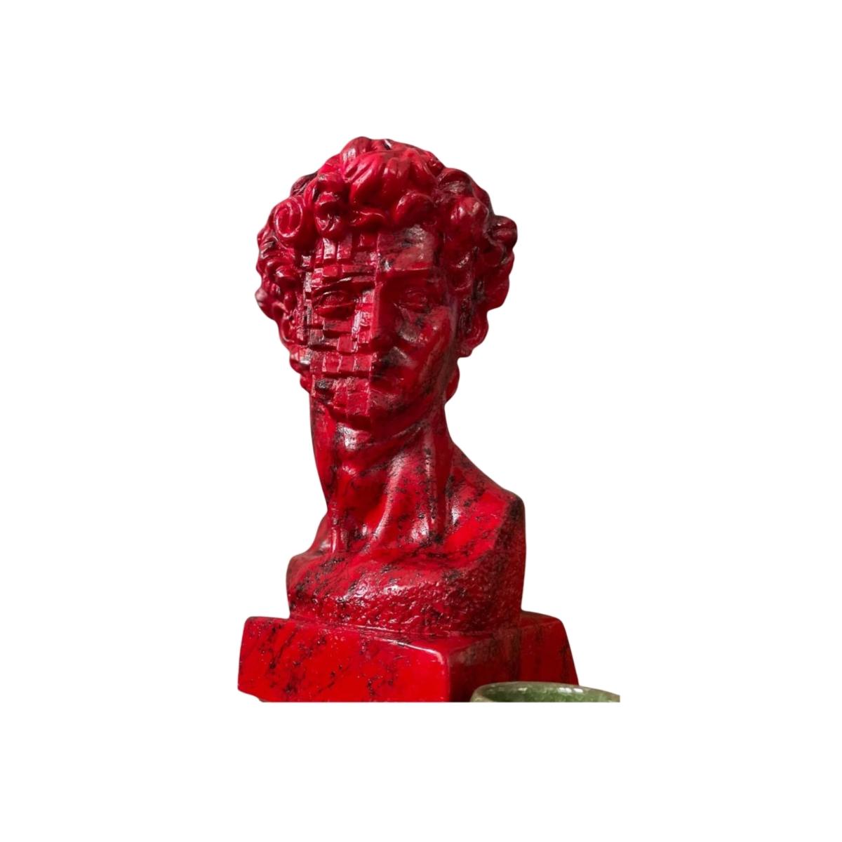 "Crimson Mosaic" is a striking 34 x 20 cm sculpture that reinterprets the classical bust with a modern, fragmented twist. Painted in a vivid red hue with intricate mosaic-like detailing, this sculpture commands attention in any space. The bold color combined with the unique texture offers a contemporary edge, making it a perfect statement piece for those who appreciate art that challenges traditional boundaries. Crafted with precision, "Crimson Mosaic" is more than just decor; it’s a conversation starter, embodying both the strength and complexity of the human form in a captivatingly bold aesthetic.