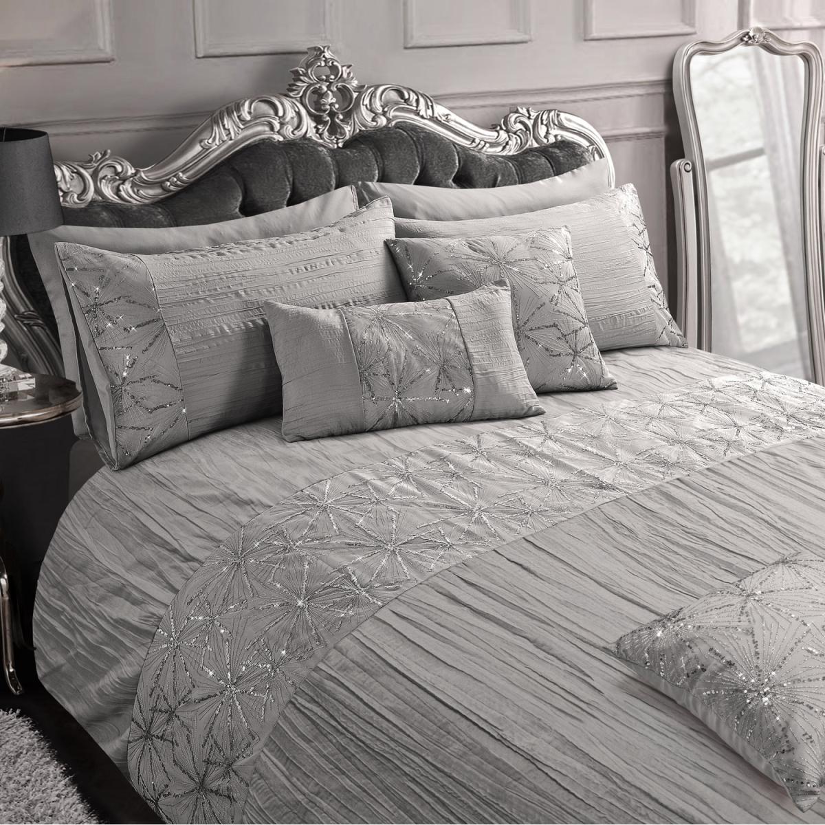 Elevate the glamour in your bedroom with our stunning Intimates Marini Sequin Pleated Crinkle Duvet Cover and Pillowcase Set. This ensemble showcases a duvet cover in a captivating shade, accompanied by matching pillowcases that harmoniously complete the overall aesthetic. Crafted from soft microfibre fabric, the material exhibits a crinkled texture, with the standout feature being an enchanting star sequin burst set on delicate lace gracing the front of the duvet cover. This captivating embellishment serves as the focal point of your room, radiating a dazzling shimmer in both natural and artificial light. The same border design is replicated on the pillowcases, rendering this sequin pleated duvet cover set a genuine showstopper destined to make a striking statement in your sleeping space. Enhance your experience further with coordinating cushion accessories also available