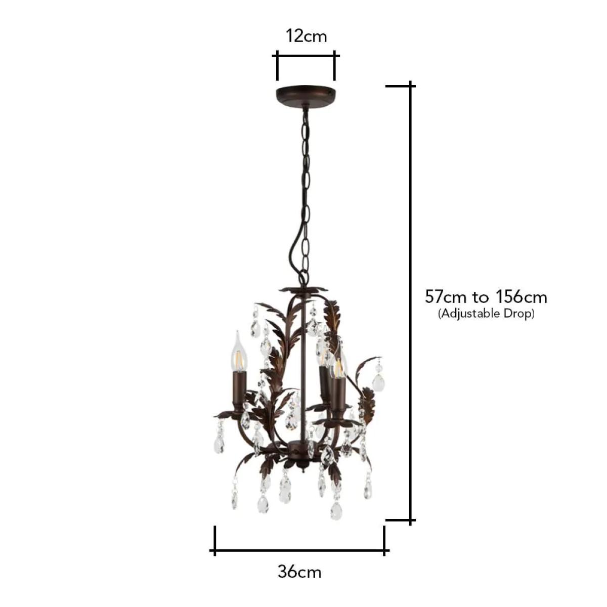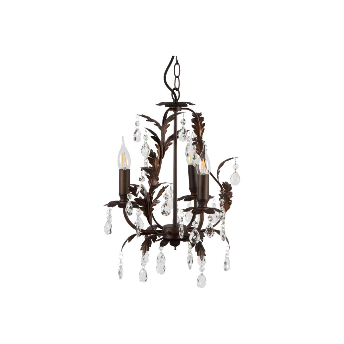 Rustic lighting design for your interior décor with the Cristalo 3 Light Chandelier. This chandelier is finished in bronze for a refined and distinguished aesthetic that looks beautiful in countryside, cottage, or farmhouse-type homes. It also comes adorned with crystal effect droplets which reflect the light for a sparkling appearance, and features a frame decorated with a sculpted leaf design for an elegant feel to any home.