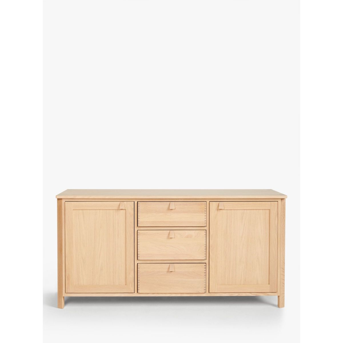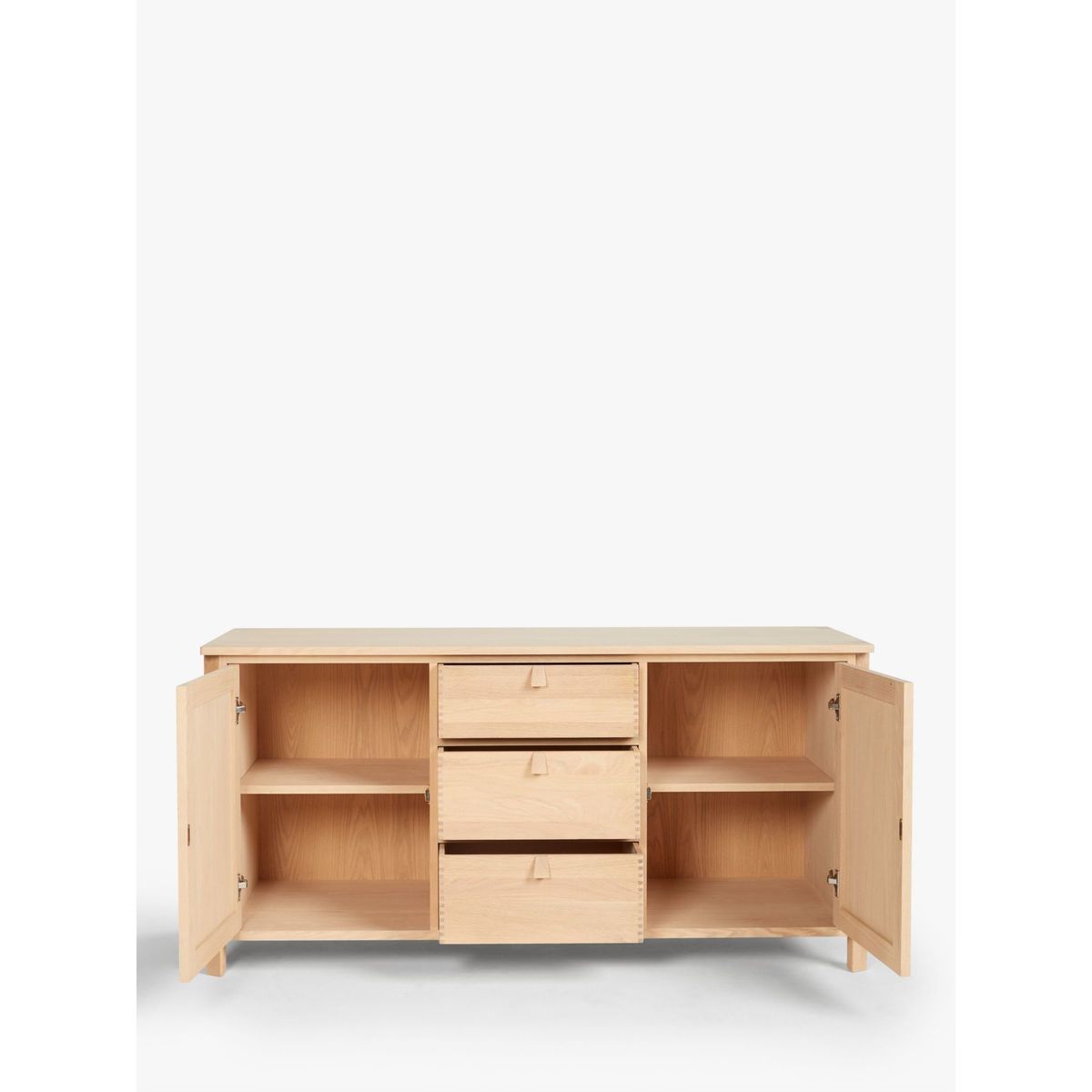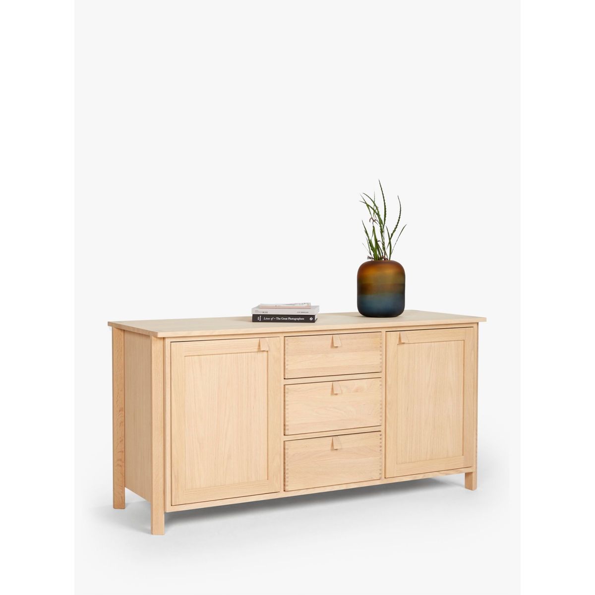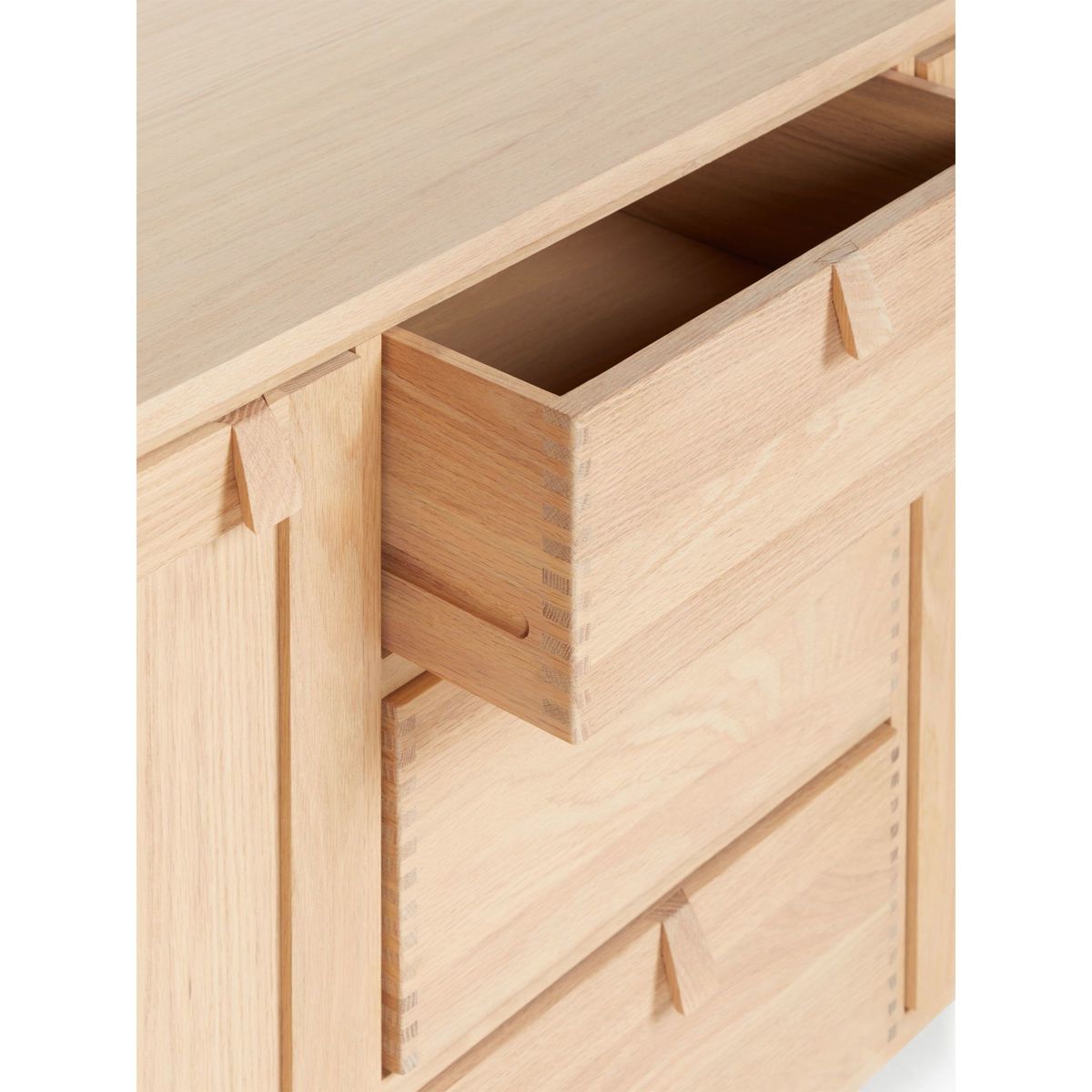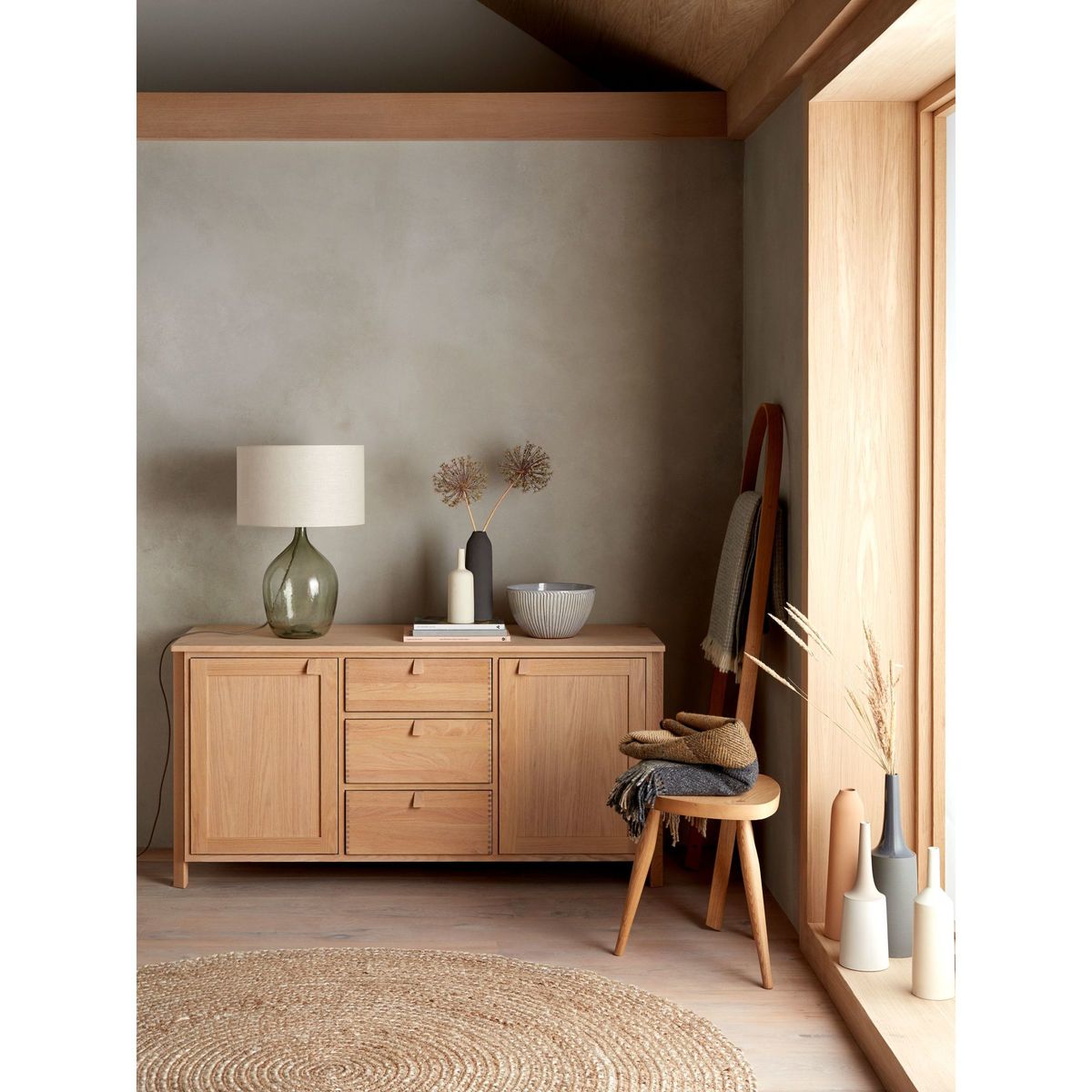 Characterised by its design, our Dovetail range showcases the sophisticated craft of the traditional dovetail joinery technique. Dovetail joints are interlocked and become stronger over time as they're designed to tighten when loaded. Made from solid red oak and veneers in an oiled finish, this range offers timeless storage pieces that highlight the interlocking style of dovetail design, with legs carefully shaped to lock cabinets together and even form sturdy handles. This spacious sideboard provides an organised storage space, in a design that showcases the appeal of natural craft. Its clean-lined profile houses 3 large drawers and 2 cupboards with interior shelves that can be adjusted at your preference. Our Croft Collection is beautiful and considered. Neutral in palette, tactile by nature, it evokes a relaxed feel you’ll love to come home to forever.