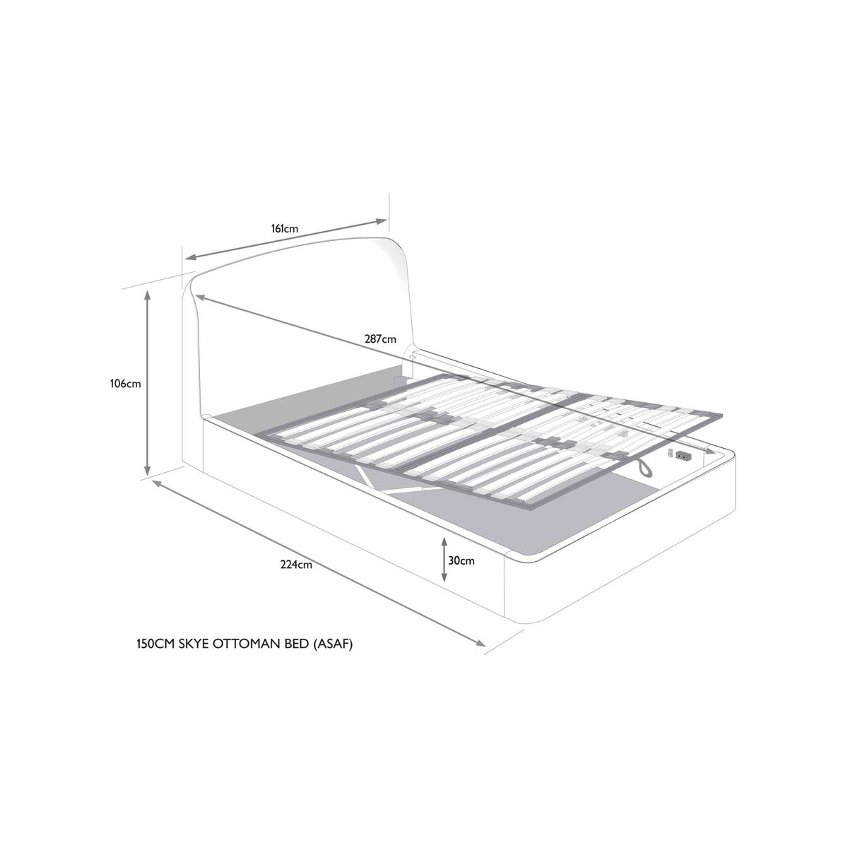 The Skye ottoman storage bed frame is designed with gently curved edges and a wide headboard. Its handle and hydraulic arms facilitate an easy manual lift-up, and reveals a functional and spacious storage space for linens. Sprung slats provide additional support for you and your mattress. Smart Slats This bed frame is designed with wider slats at the shoulders, lumbar and feet, that provide maximum support for your mattress so that you experience perfect spinal alignment while you sleep. Standard slat caps are black so we have added grey slat caps to ensure that you know where to place the wider slats.
