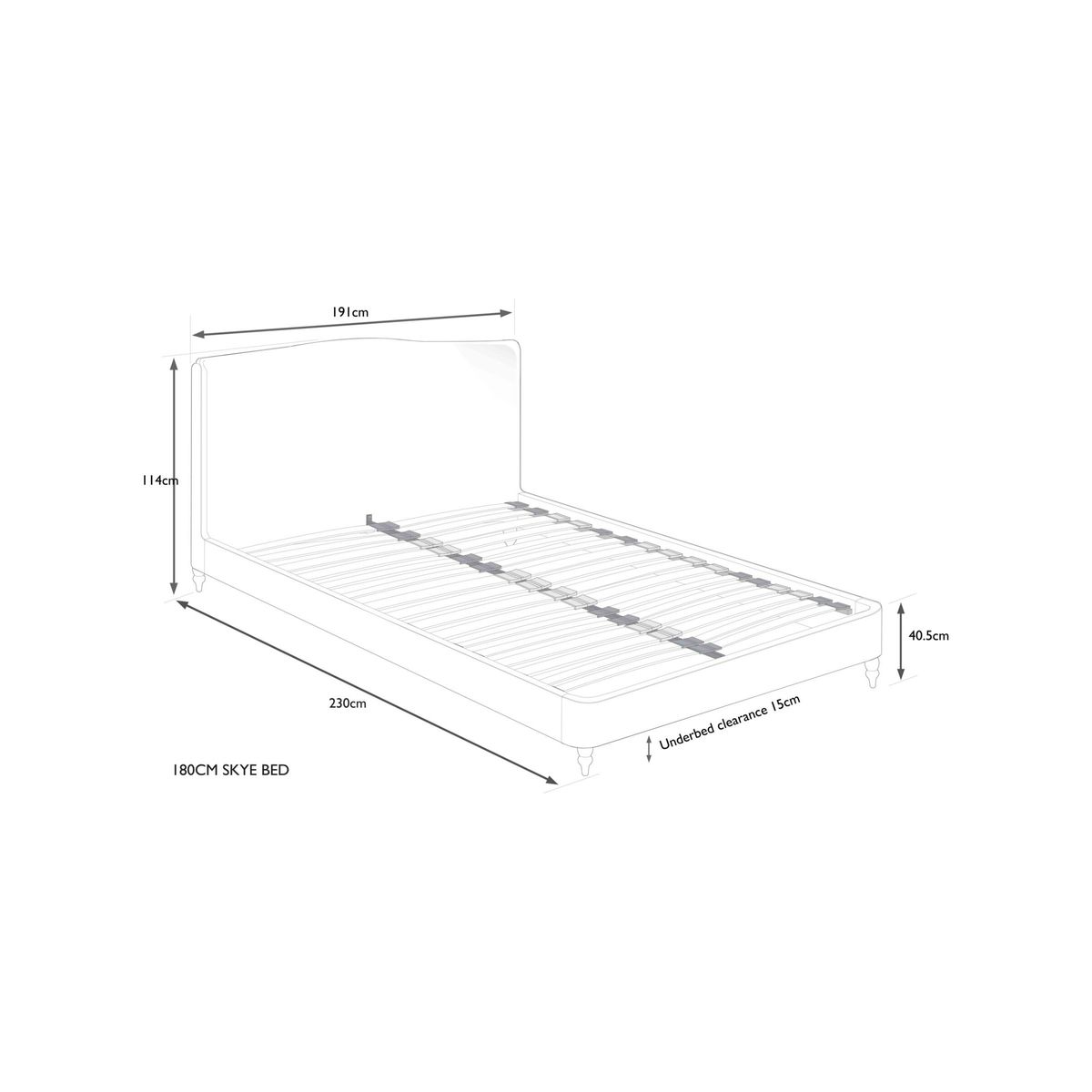 The Skye bed frame is an elegant, gently curved piece that boasts a wide, rounded headboard. It's supported by traditional wooden legs and features sprung slats that offer additional support for you and your mattress. Smart Slats This bed frame is designed with wider slats at the shoulders, lumbar and feet, that provide maximum support for your mattress so that you experience perfect spinal alignment while you sleep. Standard slat caps are black so we have added grey slat caps to ensure that you know where to place the wider slats.