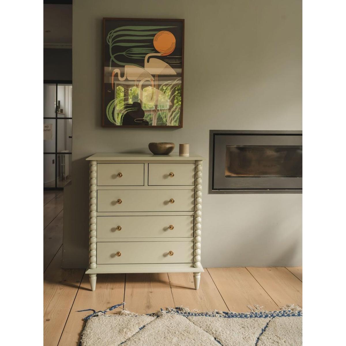 The Cromwell 2 over 3 Chest of Drawers is a stylish and functional piece of furniture that combines contemporary design with practical storage solutions. This chest features a unique configuration of two smaller drawers placed above three larger drawers, providing versatile storage options for your bedroom or living space. It is supported by slightly turned legs with rubber feet, ensuring stability while protecting your flooring. Each drawer is elegantly painted throughout and enhanced with chic gold metal round handles, adding a touch of sophistication to its overall appearance. The drawers glide smoothly on metal runners, making them easy to open and close. A charming round bobbin design adorns the sides of the chest, contributing to its overall aesthetic appeal. Dimensions: Width 80 cm Height 90 cm Depth 46 cm The Cromwell 2 over 3 Chest of Drawers is available in two attractive colours Pale Olive and Linen. It arrives fully assembled, requiring only the attachment of the legs for quick and easy setup. Additionally, various matching bedroom furniture pieces from this range are available, allowing you to create a cohesive and stylish look throughout your home.