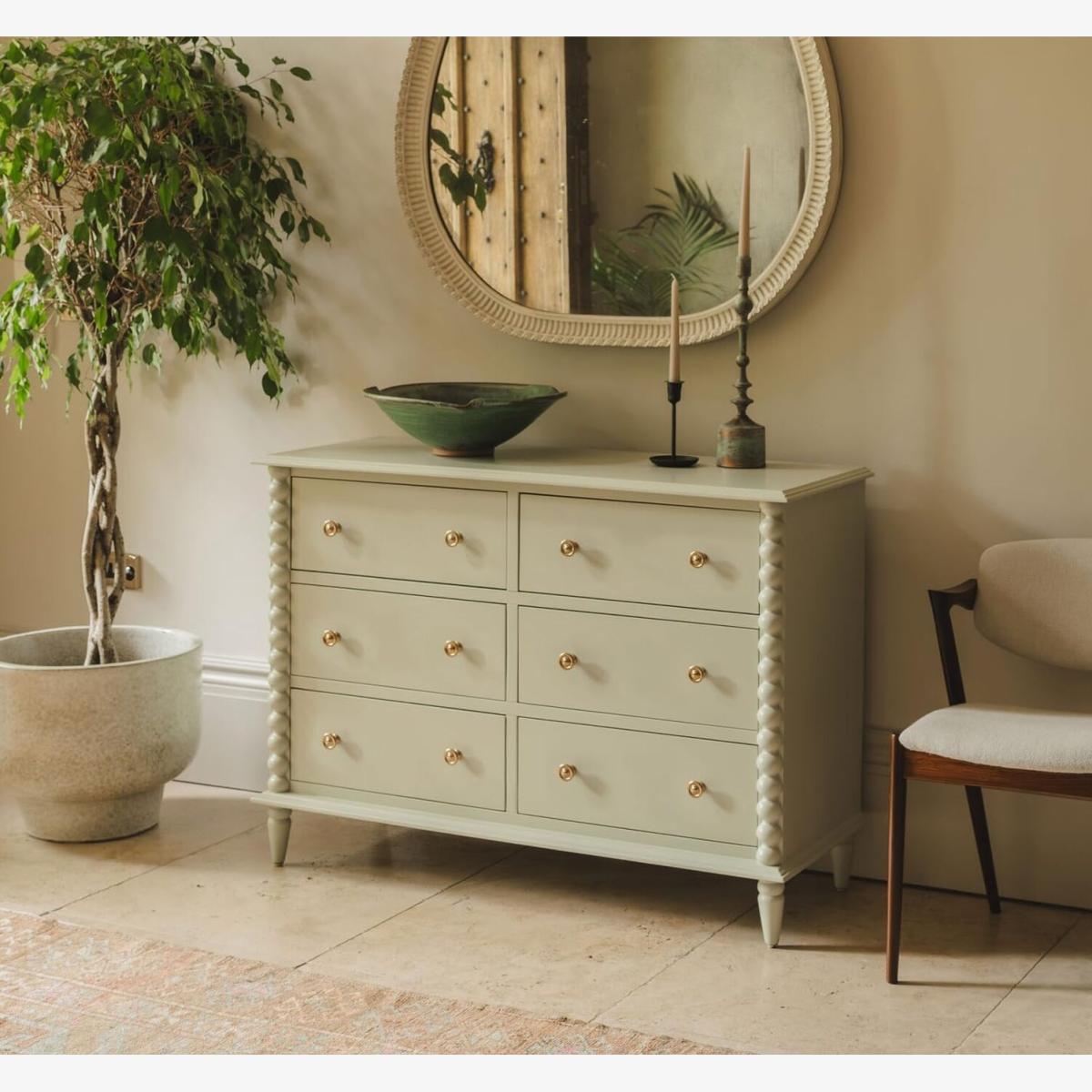 The Cromwell Large Chest of Drawers is a beautifully crafted storage solution that combines elegance and practicality. It features six spacious drawers adorned with stylish round gold handles, and its design enhances the aesthetic of any bedroom or living area. The slightly turned legs with rubber feet provide both stability and floor protection. This wide wooden chest of drawers showcases a charming round bobbin design on the sides, adding a distinctive touch to its overall look. With three deep drawers on each side, it offers ample storage space, and the metal runners ensure smooth operation for effortless access to your belongings. Each drawer is fully painted, which adds to the durability and visual appeal of this piece. Dimensions:Width 120 cm, Height 85 cm, Depth 46 cm The Cromwell Chest of Drawers is available in two elegant colours Pale Olive and Linen Cream. Additionally, there are various matching bedroom furniture pieces, including a bed, wardrobe, and bedside table, allowing for a coordinated look throughout your space. The chest arrives fully assembled, requiring only the legs to be attached for a quick and easy setup.