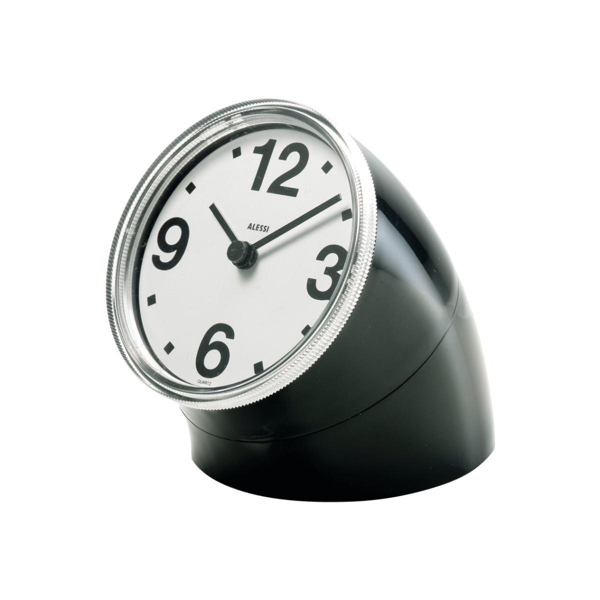 Desk clock in ABS, black. Second edition (first one in 1988) for the Alessi desk clock designed by Pio Manzù.