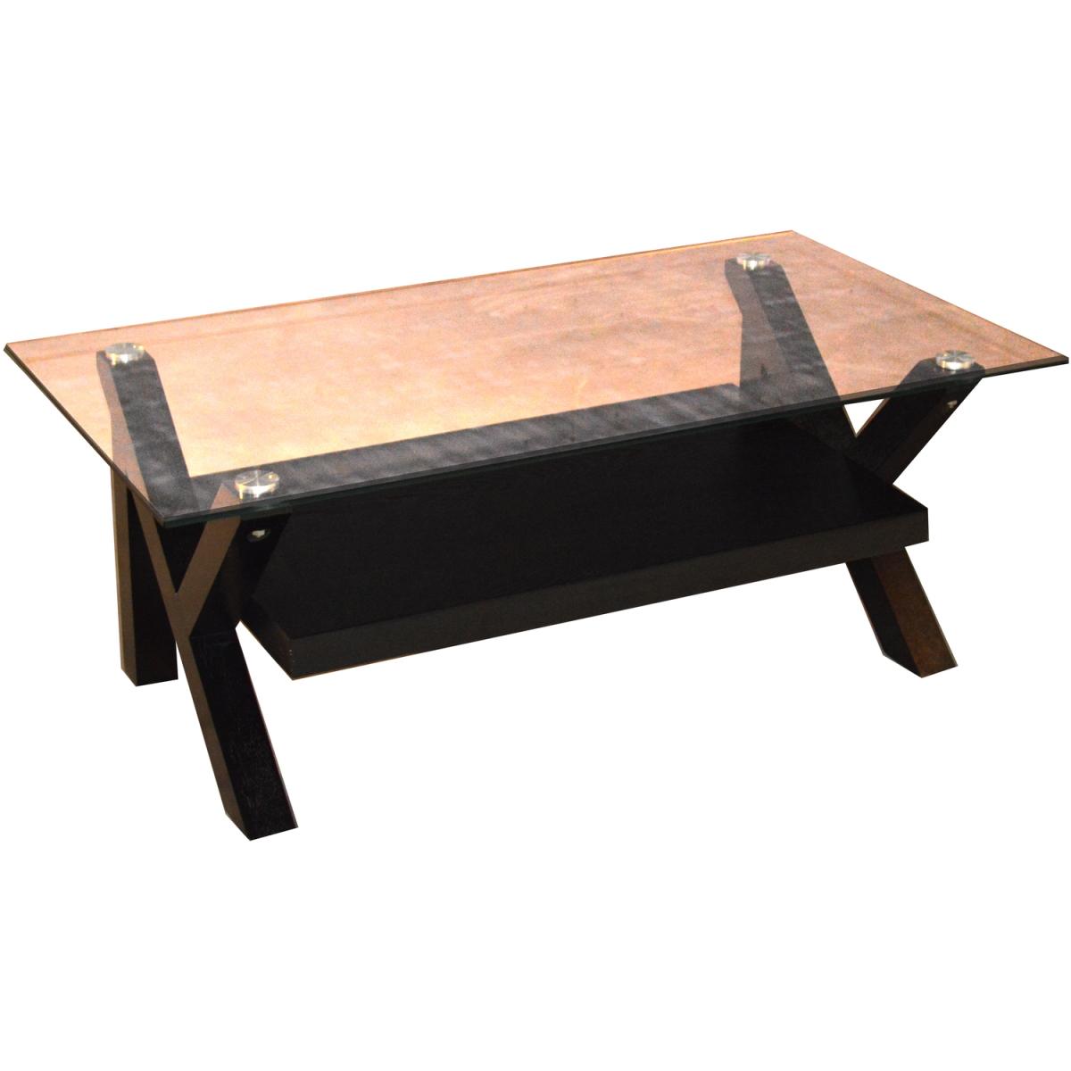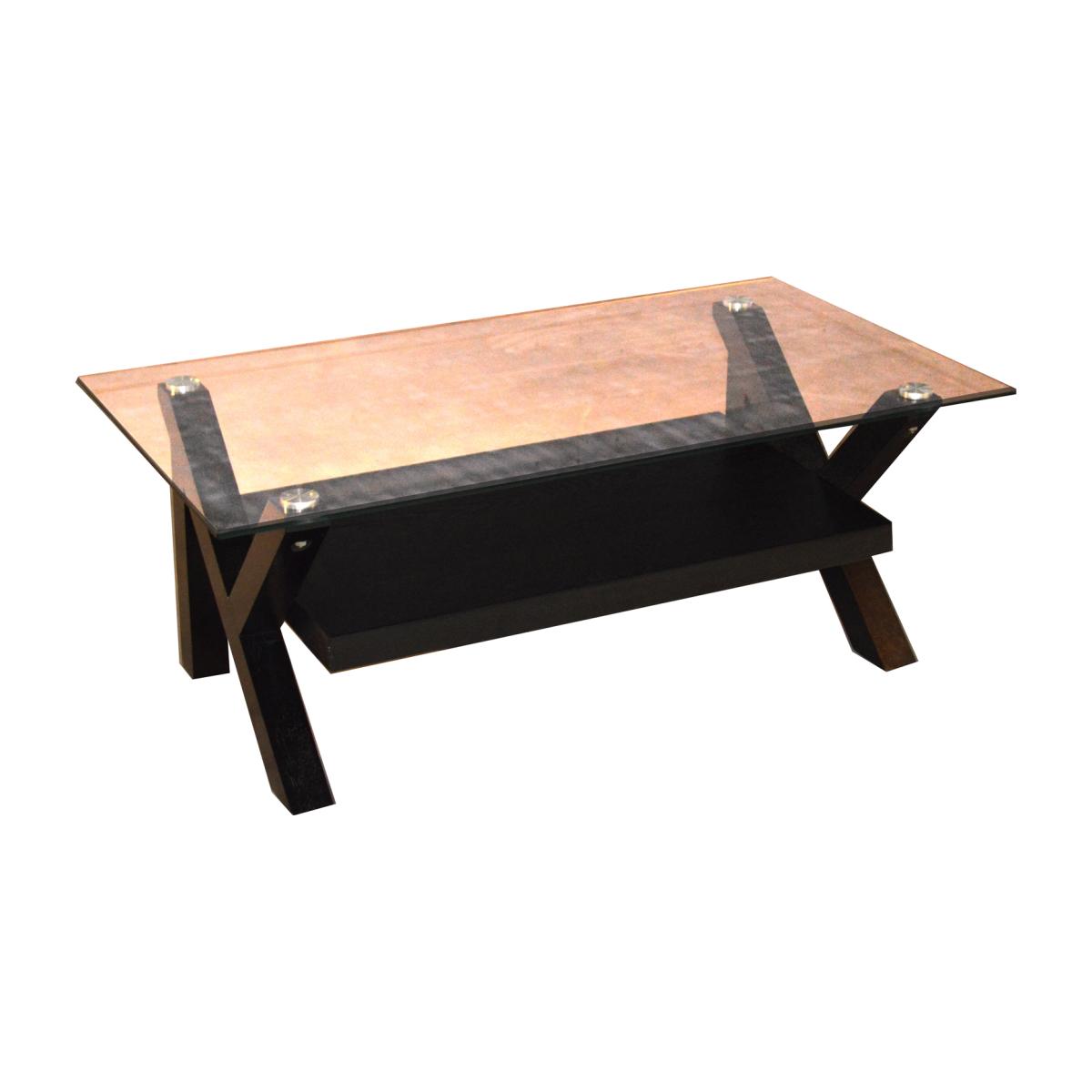 A sophisticated cross coffee table, this coffee table is perfect for making a focal point in your living room or study glass topped with one shelve and solid mdf base.