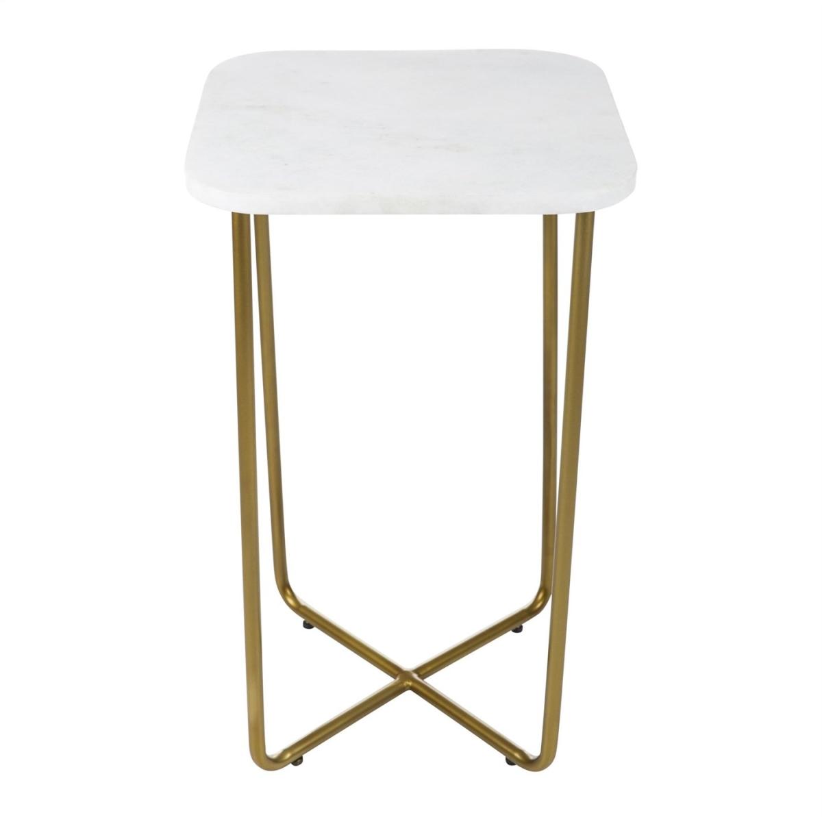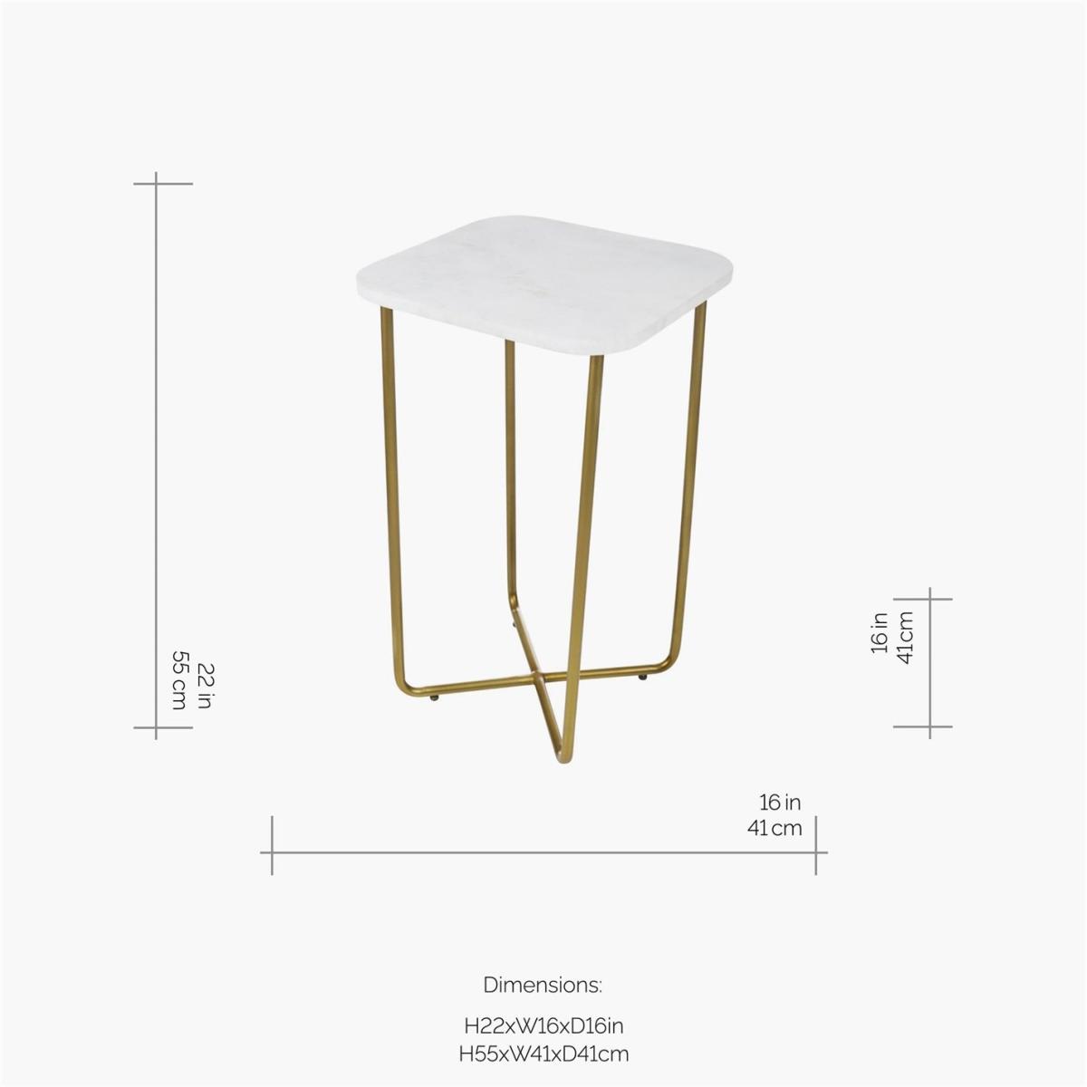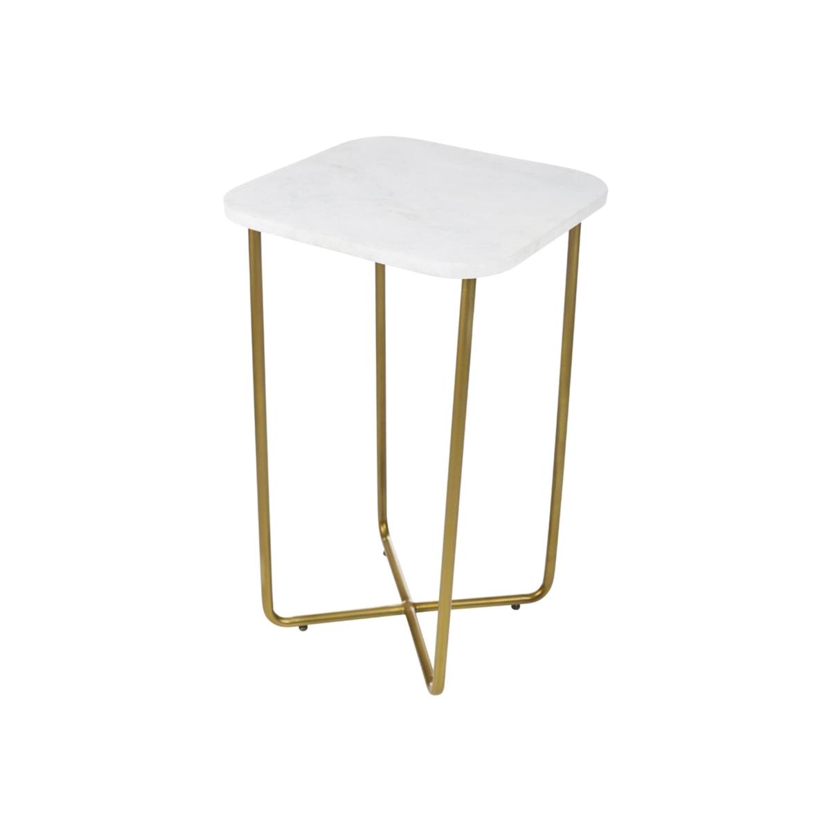 Create a chic living space with this Crossover table from Luxe. In a rounded square shape,  this table is topped with an on-trend stoneware surface in a fresh white marble design. On a frame of brass coloured metal, this small side table is finished with a crossover leg design and is a striking addition to a living room next to a sofa or armchair.